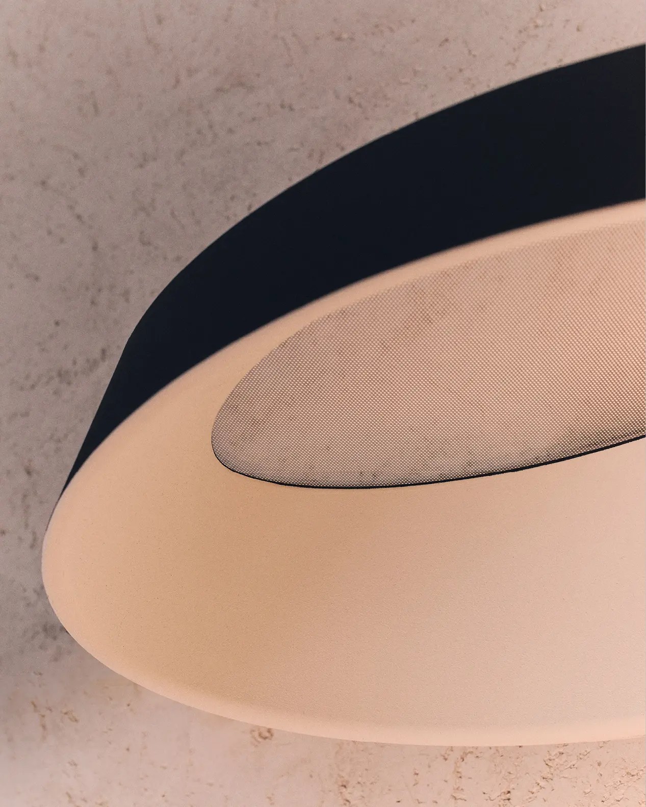 Конструкция продумана до мелочей. Двухцветный полиуретановый абажур сочетается с прозрачным рассеивателем из ПММА. Благодаря лазерной микрогравировке свет распределяется идеально ровно, без резких теней и бликов. Завершает образ белое алюминиевое кольцо — оно подчёркивает аккуратность и изящество дизайна.