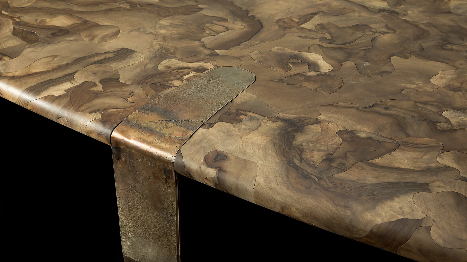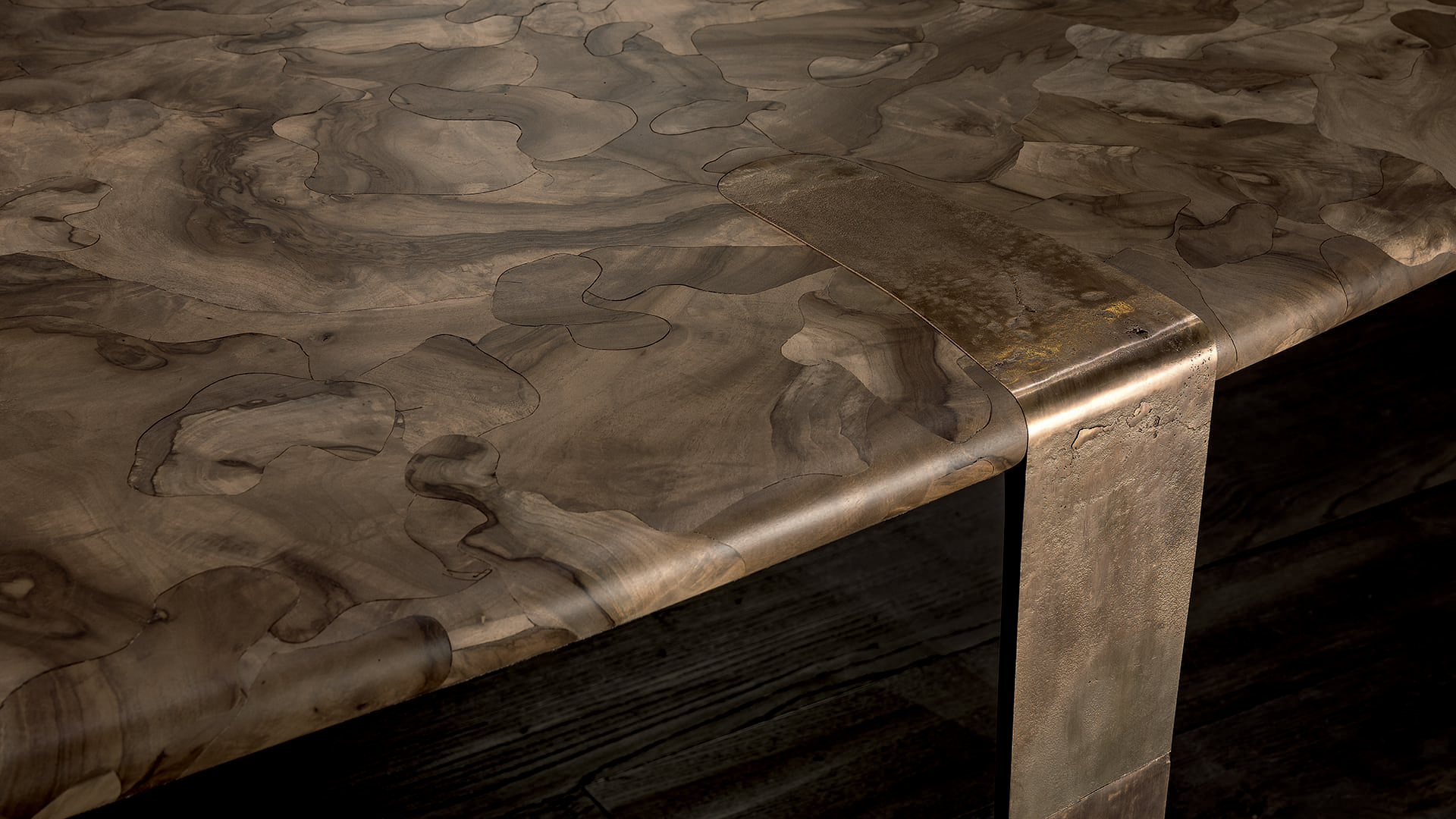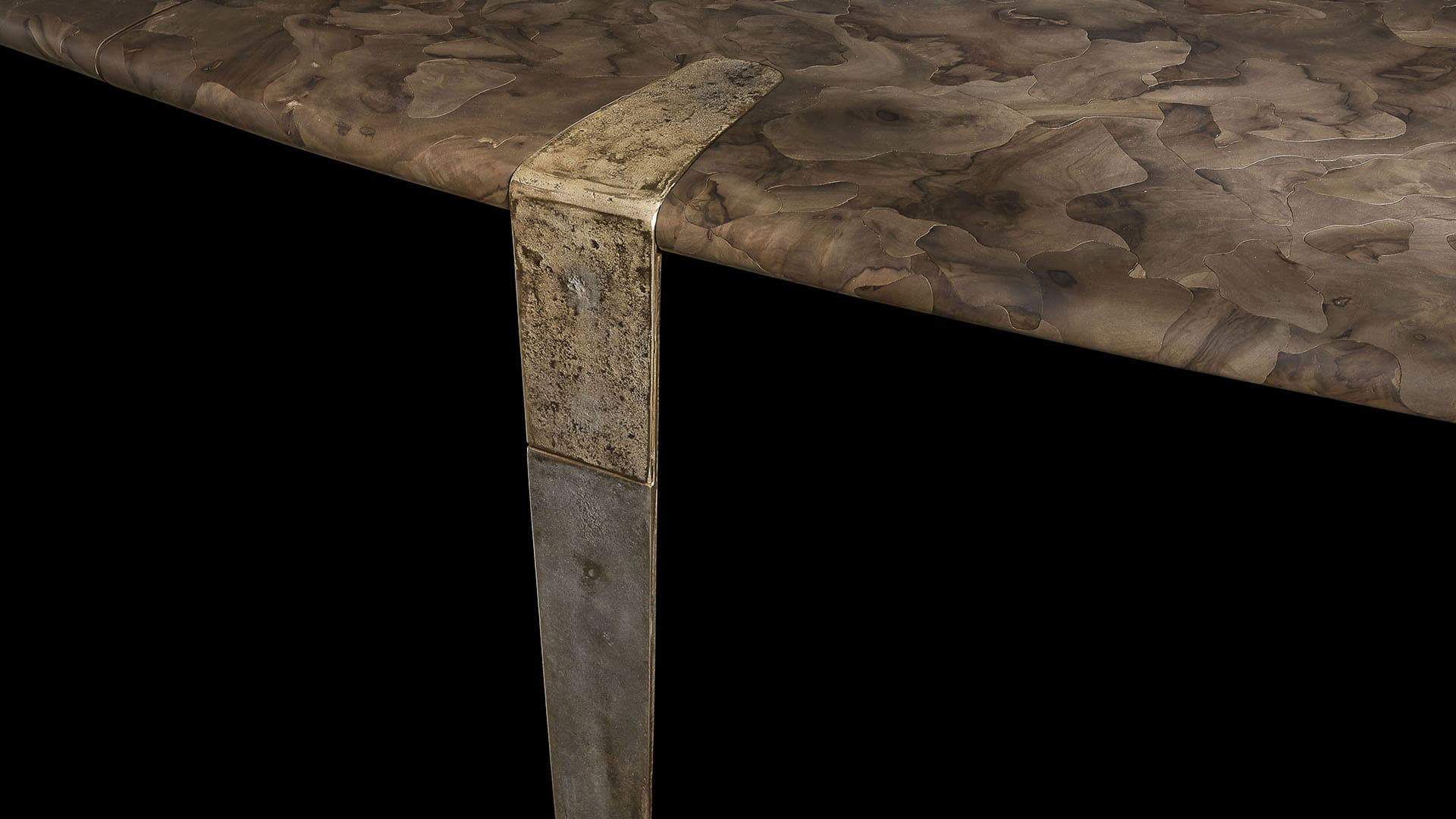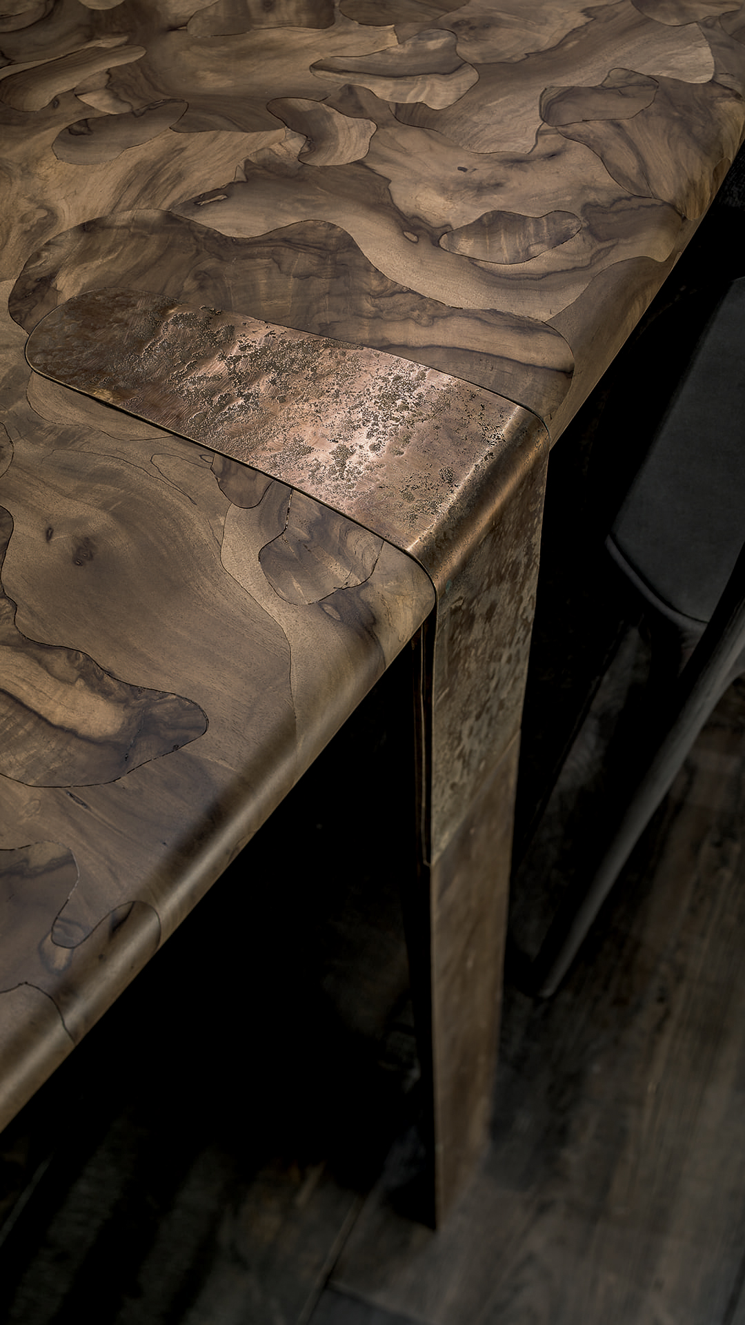 Стол Oxymoron воплощает в себе переосмысление сложного и изящного ремесленного производства. Его уникальная столешница, выполненная из орехового дерева, украшена микромозаичным узором, создающим гармоничное сочетание текстуры и дизайна. Этот узор придаёт поверхности стола особую глубину и изящество, подчёркивая его эстетическую ценность.