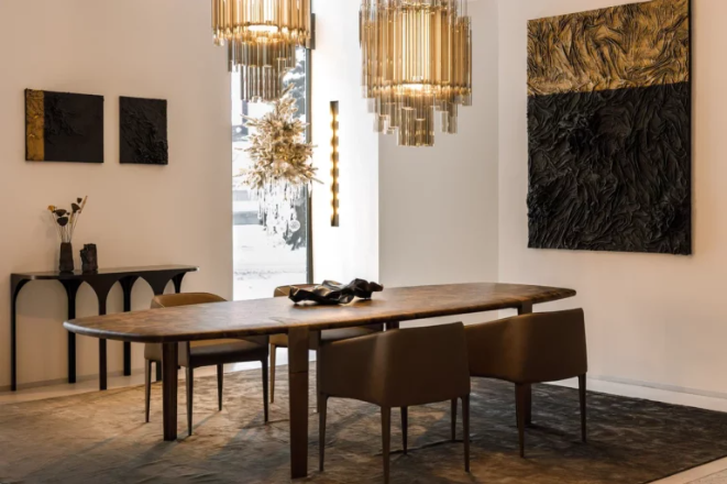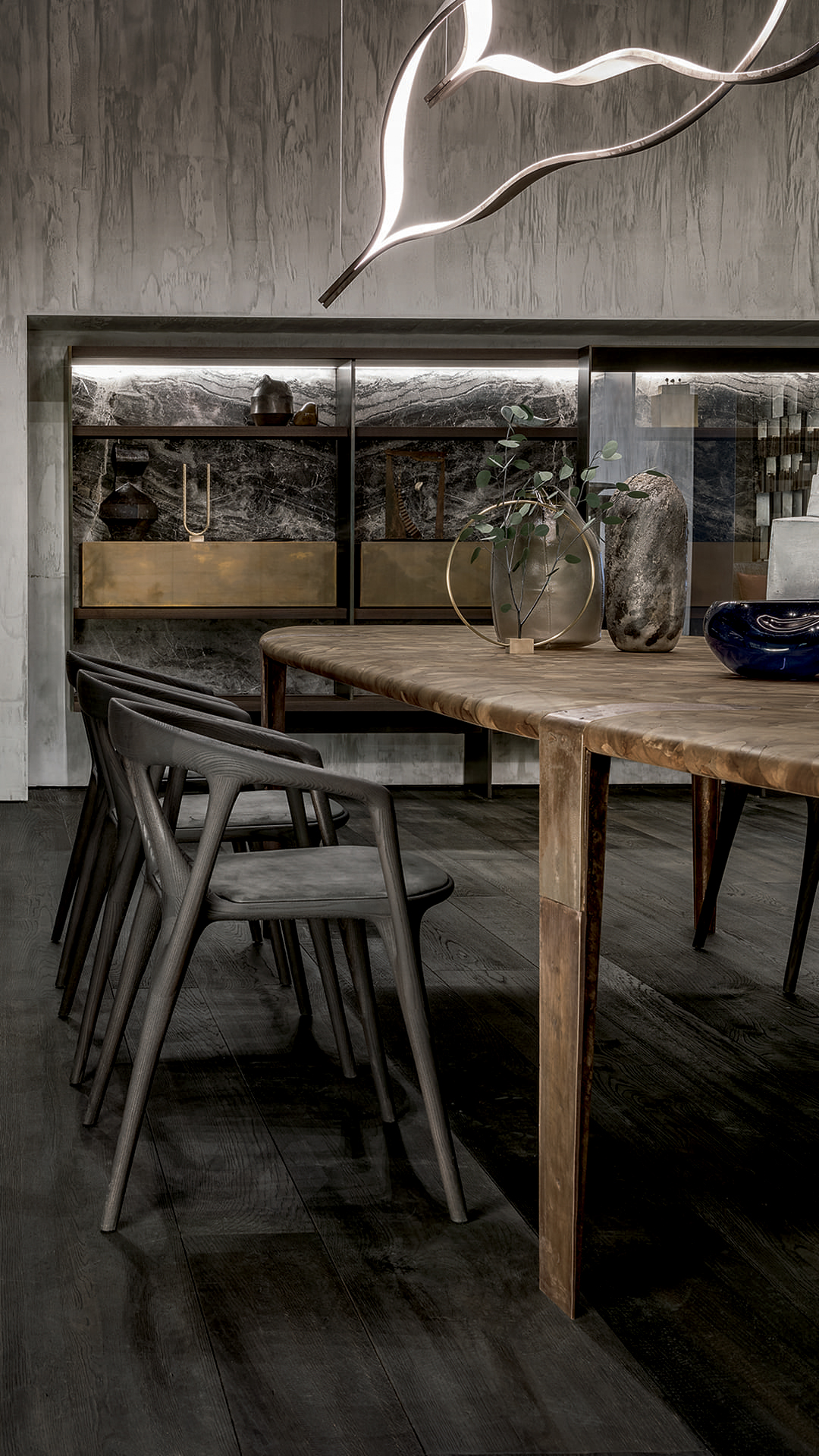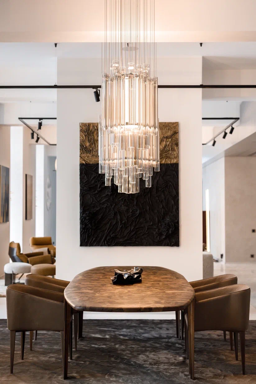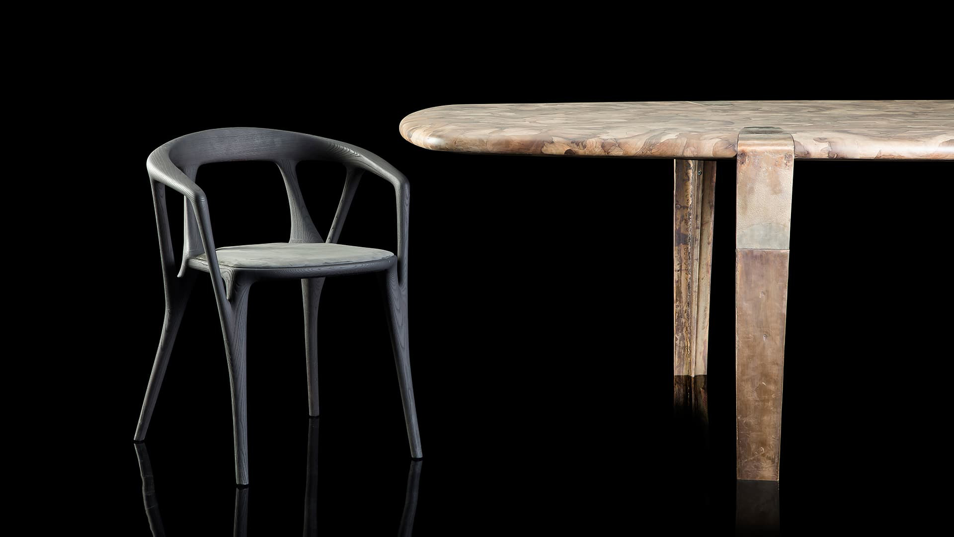Стол Oxymoron воплощает в себе переосмысление сложного и изящного ремесленного производства. Его уникальная столешница, выполненная из орехового дерева, украшена микромозаичным узором, создающим гармоничное сочетание текстуры и дизайна. Этот узор придаёт поверхности стола особую глубину и изящество, подчёркивая его эстетическую ценность.