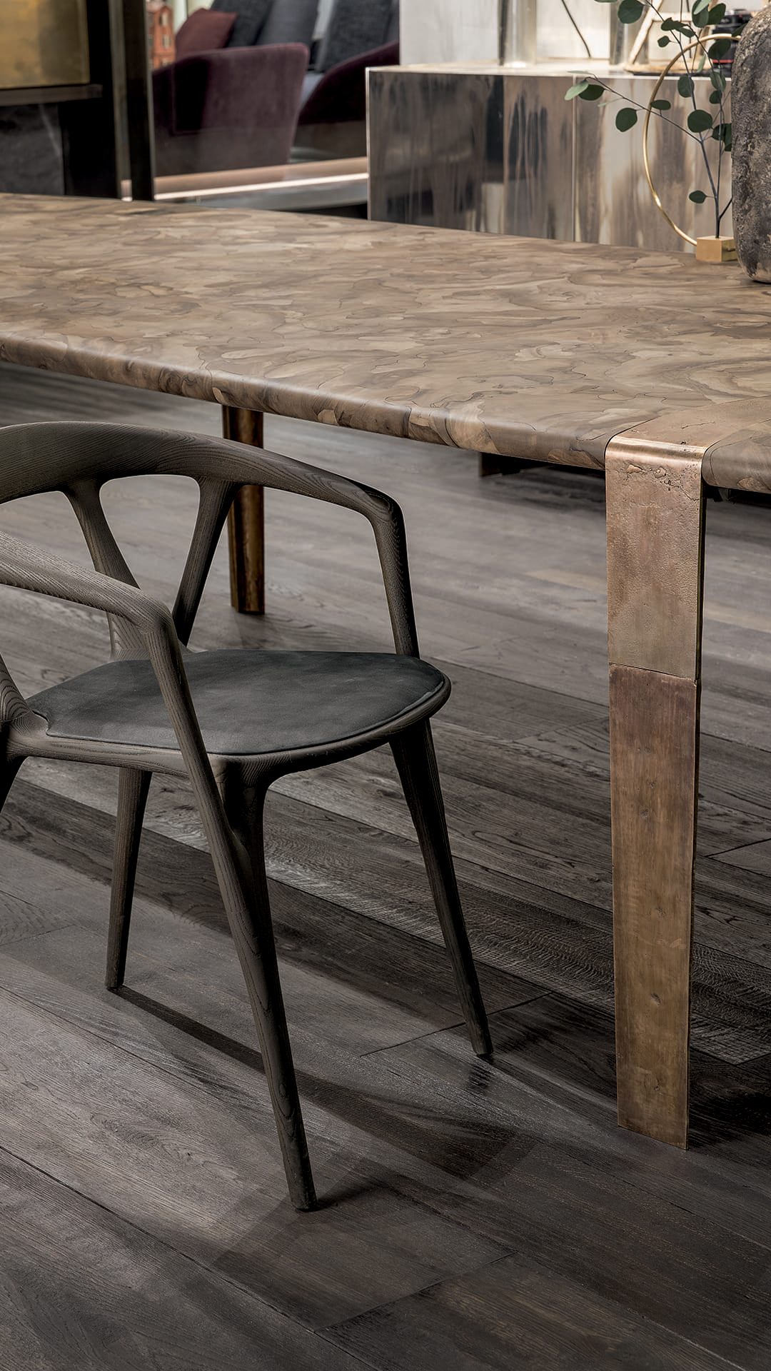 Рамка стола выполненная из высококачественной чёрной стали, добавляет ему прочности и устойчивости. Контраст между матовой сталью и блестящей бронзой создаёт гармоничный баланс между строгостью и утончённостью, подчёркивая продуманность дизайна.