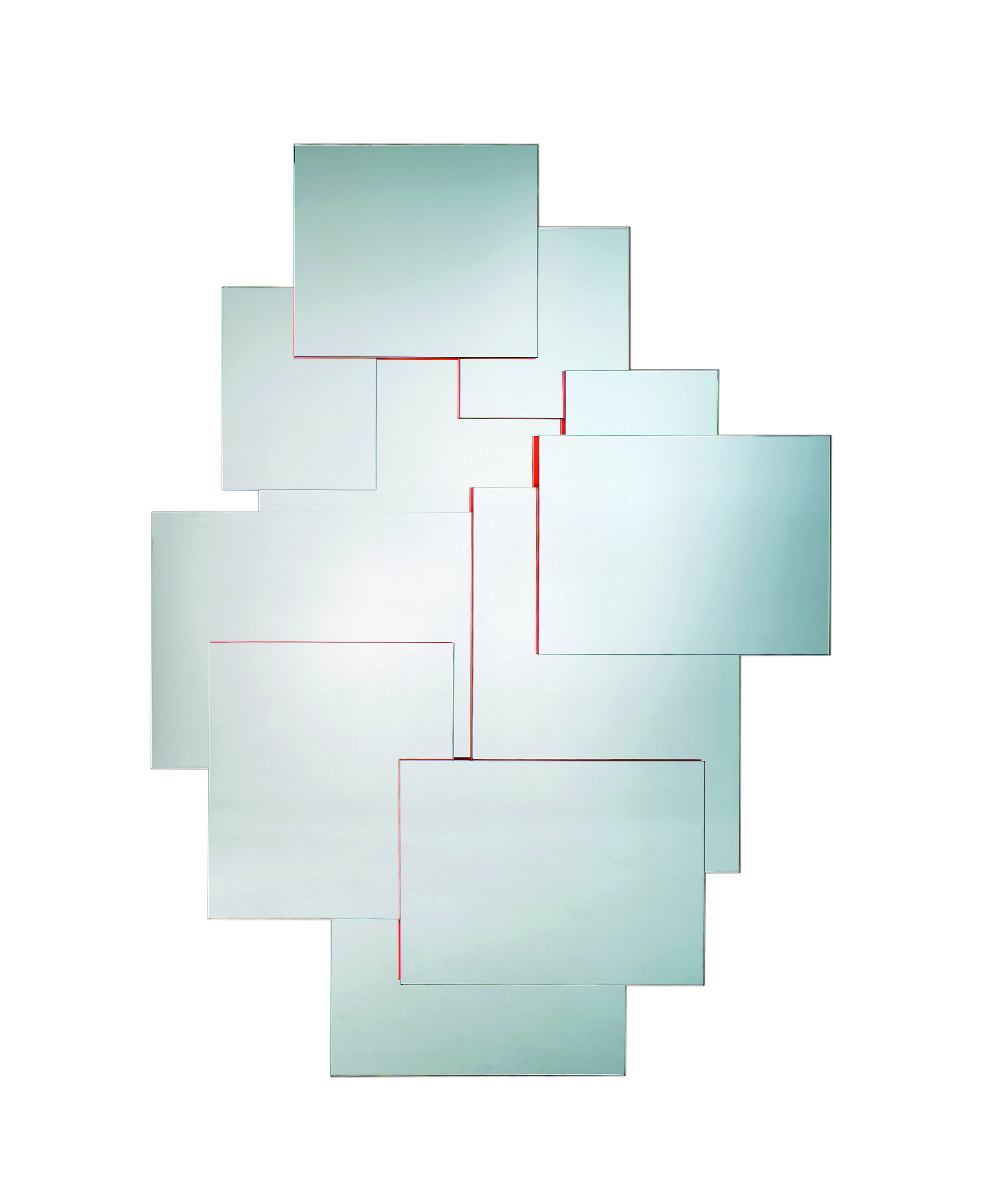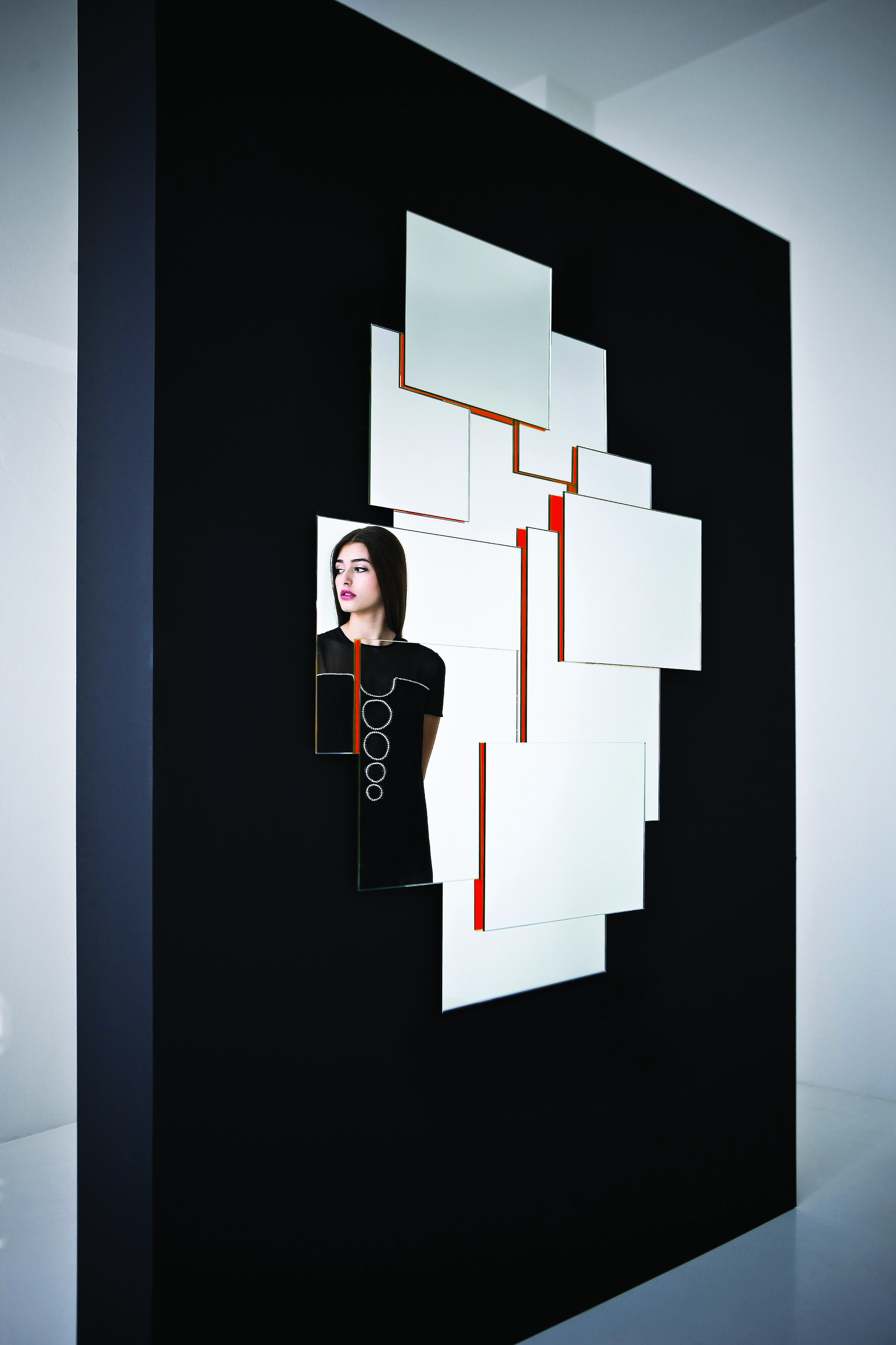 Зеркало Pablo собрано из прямоугольников разных размеров толщиной 5 мм, перекрывающих друг друга. Настенное зеркало монтируется как вертикально, так и горизонтально. Каркас Pablo изготовлен из прочной нержавеющей стали. На стыках отдельных элементов зеркала виден каркас красного цвета.