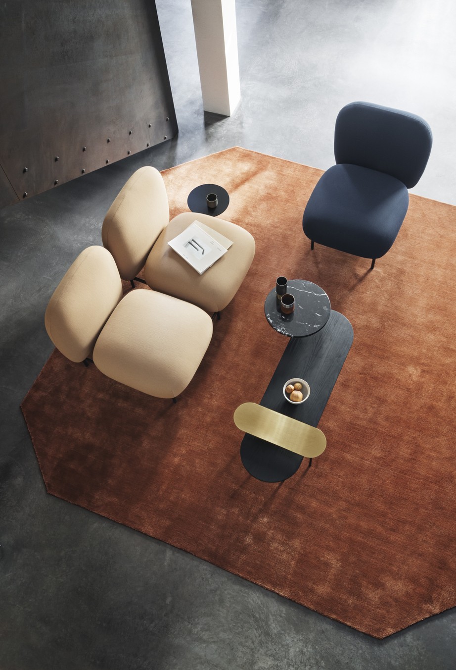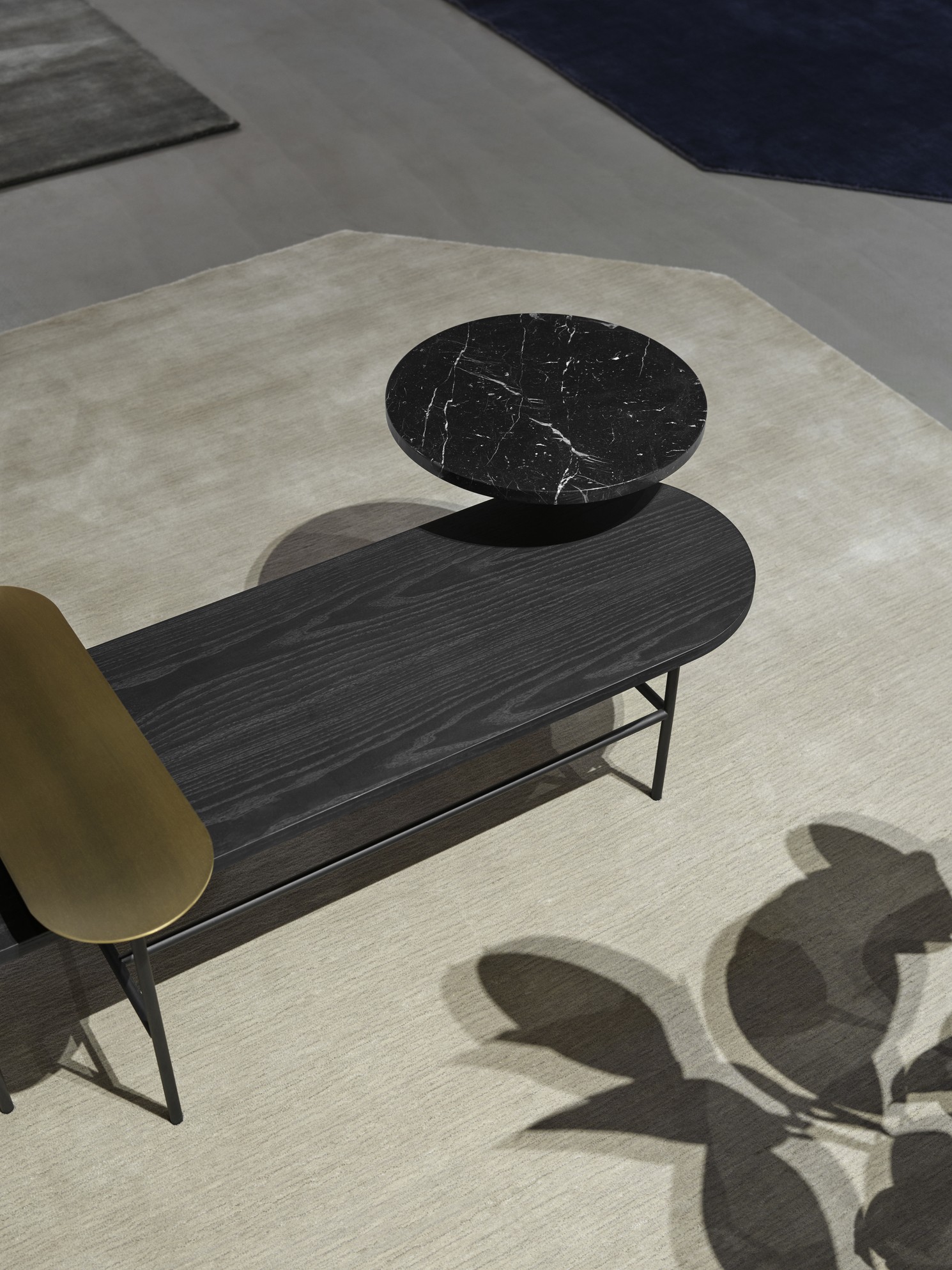 Полочки выполнены из чёрного мрамора и латуни — словно плавающие острова, создавая игру уровней, света и тени.