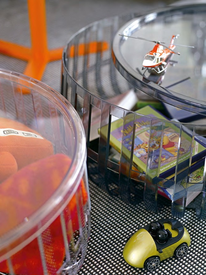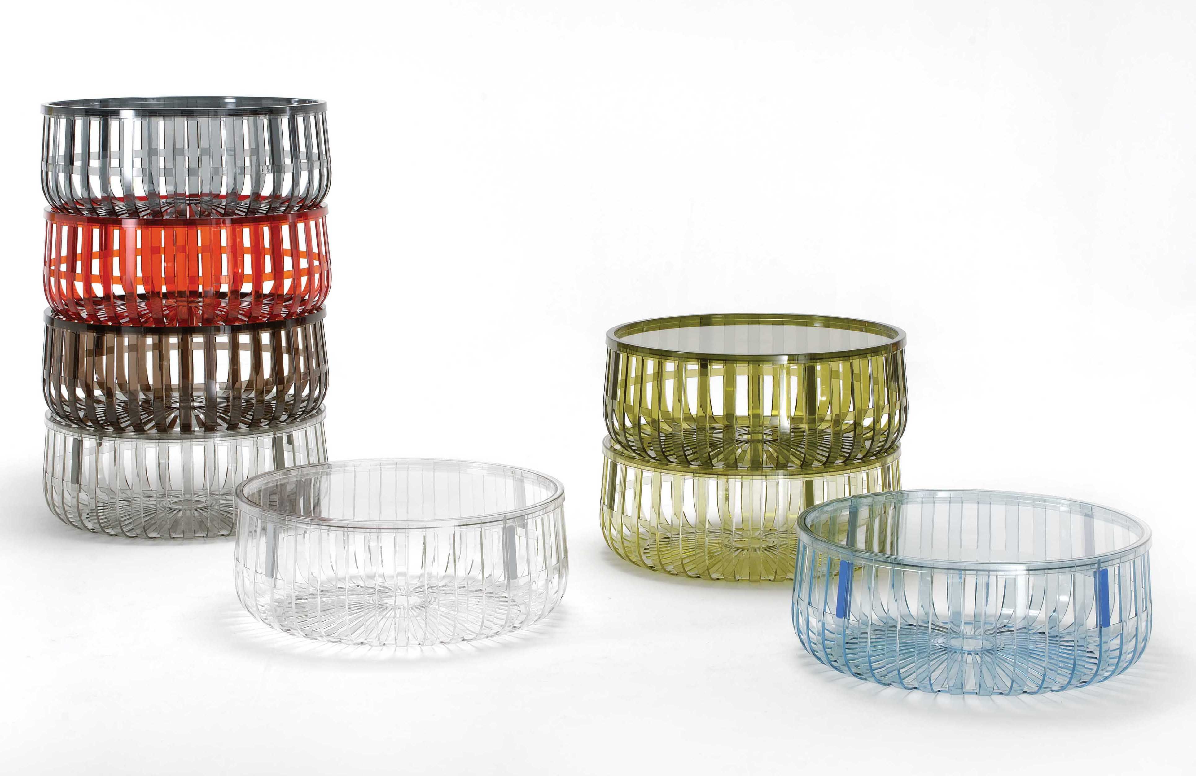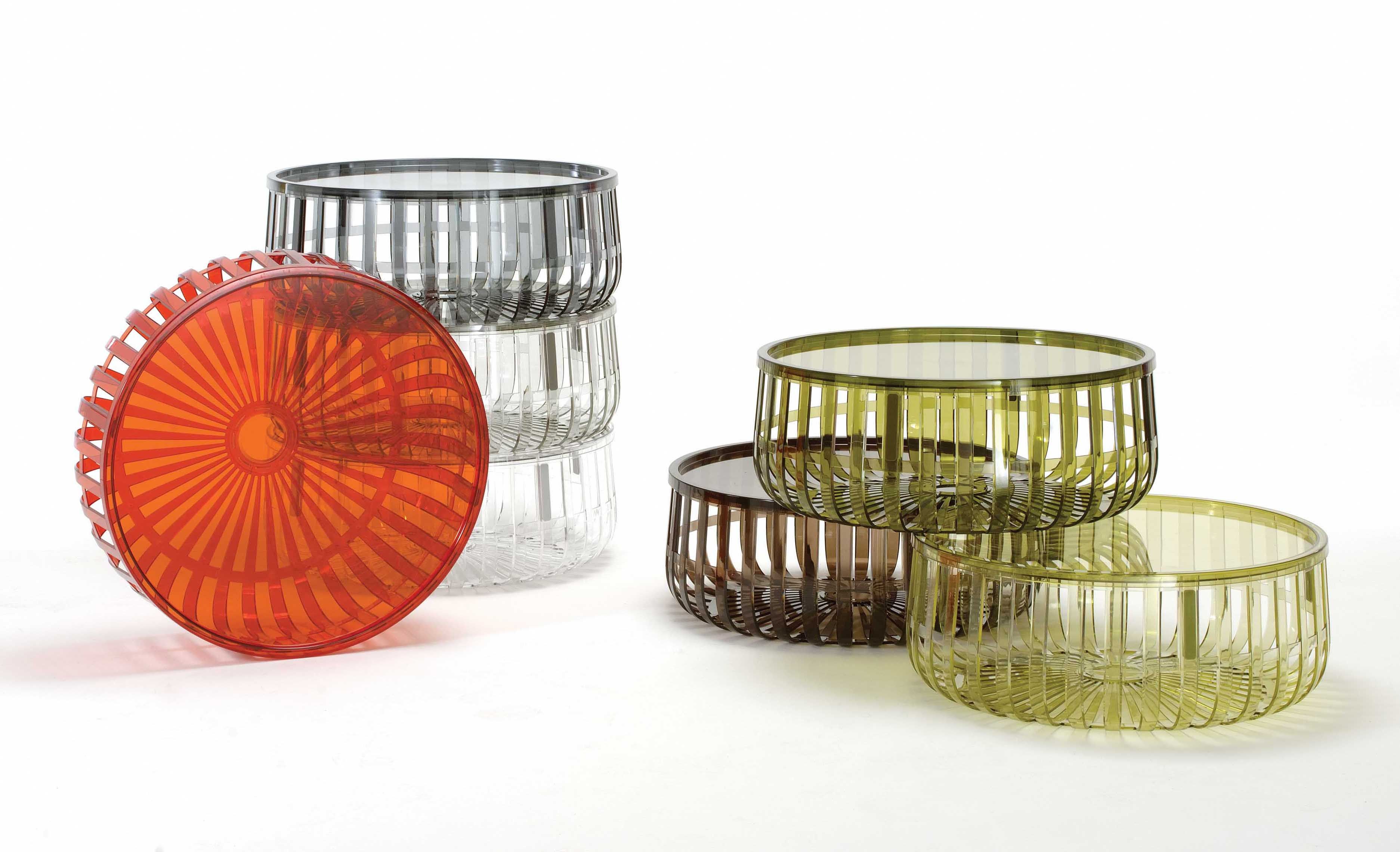 Panier - функциональная и при этом стильная корзина. Состоит из четырех модулей, четырех прозрачных, блестящих сегментов, разделенных по радиусам окружности, связанных между собой посредством непрозрачных соединений, фиксирующих конструкцию простым шпунтовым соединением. В крайней случае всегда можно накрыть Panier прозрачной крышкой из поликарбоната, получив, таким образом, практичный вспомогательный или журнальный столик.