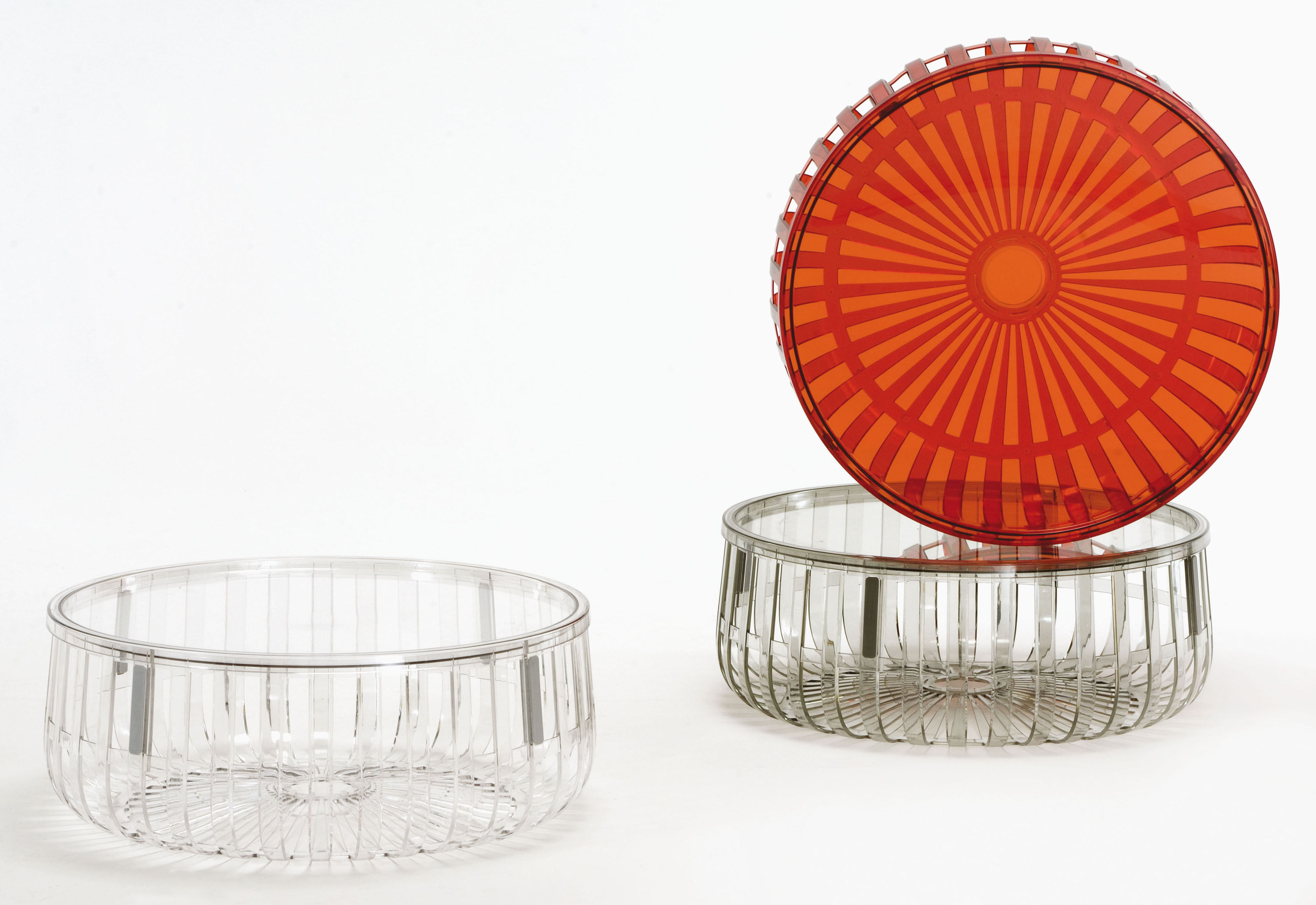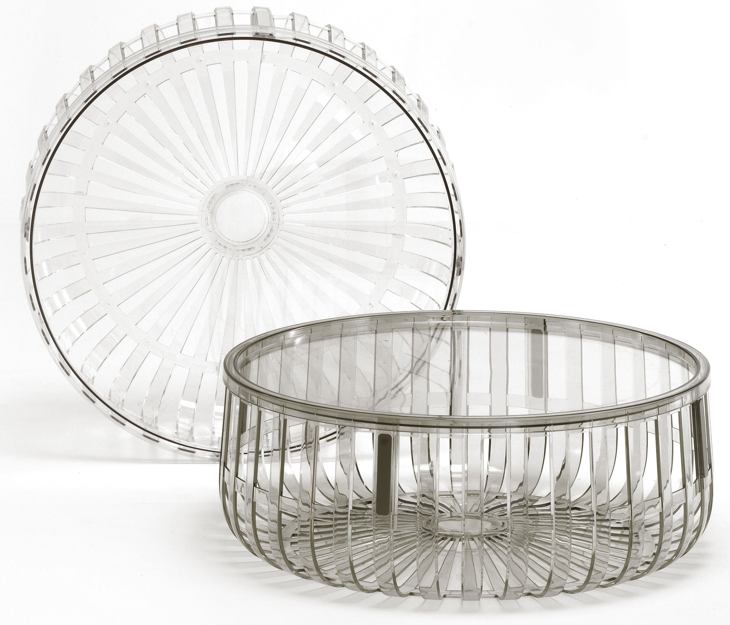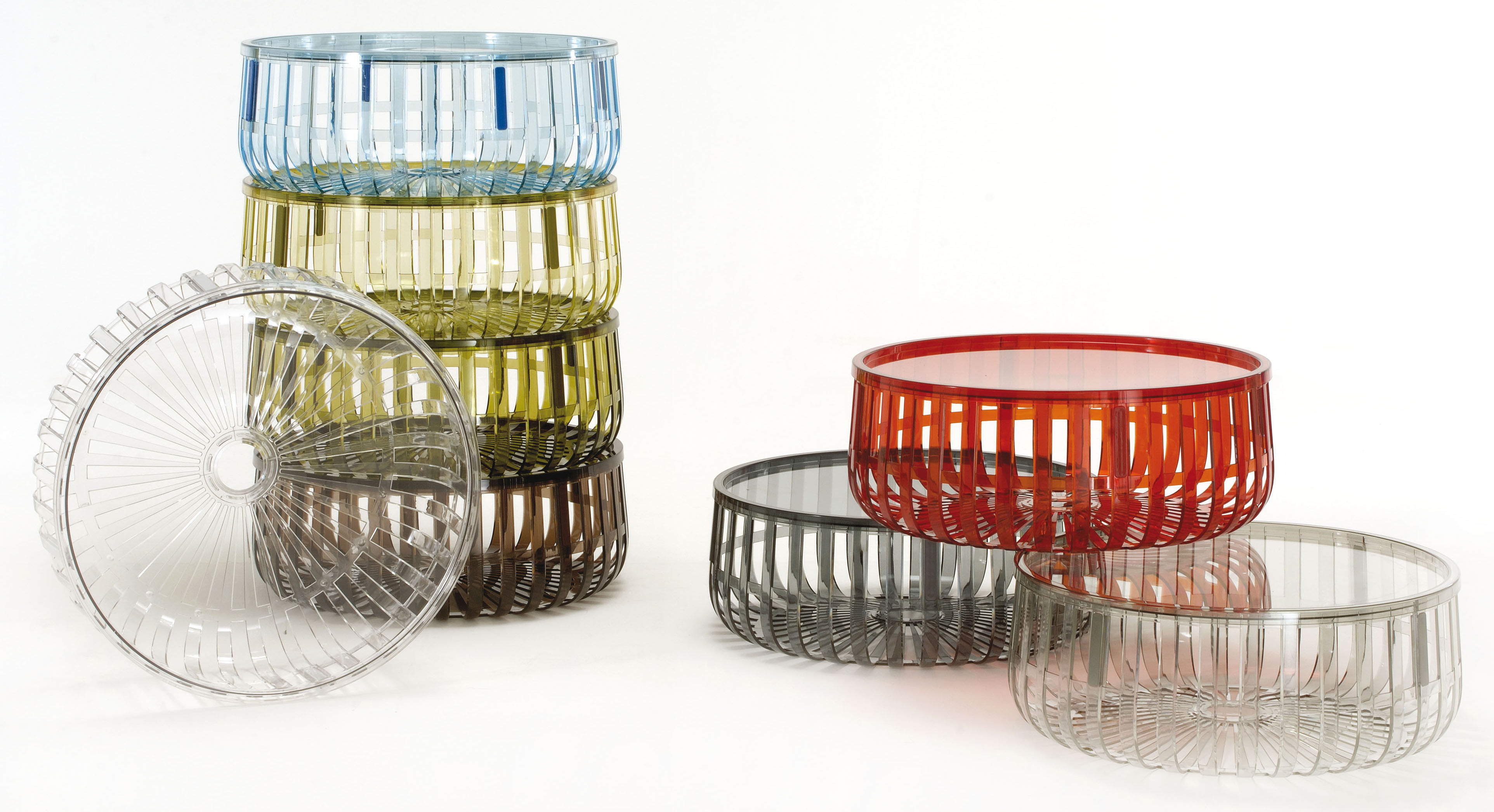 Panier - функциональная и при этом стильная корзина. Состоит из четырех модулей, четырех прозрачных, блестящих сегментов, разделенных по радиусам окружности, связанных между собой посредством непрозрачных соединений, фиксирующих конструкцию простым шпунтовым соединением. В крайней случае всегда можно накрыть Panier прозрачной крышкой из поликарбоната, получив, таким образом, практичный вспомогательный или журнальный столик.