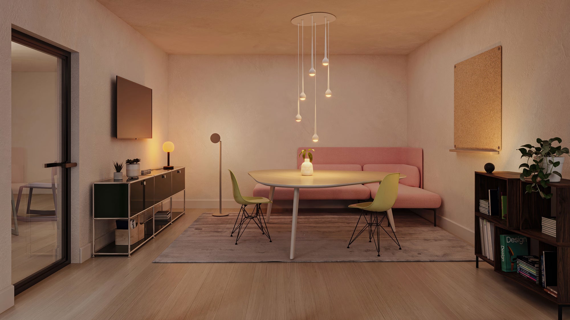 Свет регулируется: есть специальный режим, имитирующий закат. Он убирает синий спектр, поэтому глаза не устают, а в комнате становится уютно.