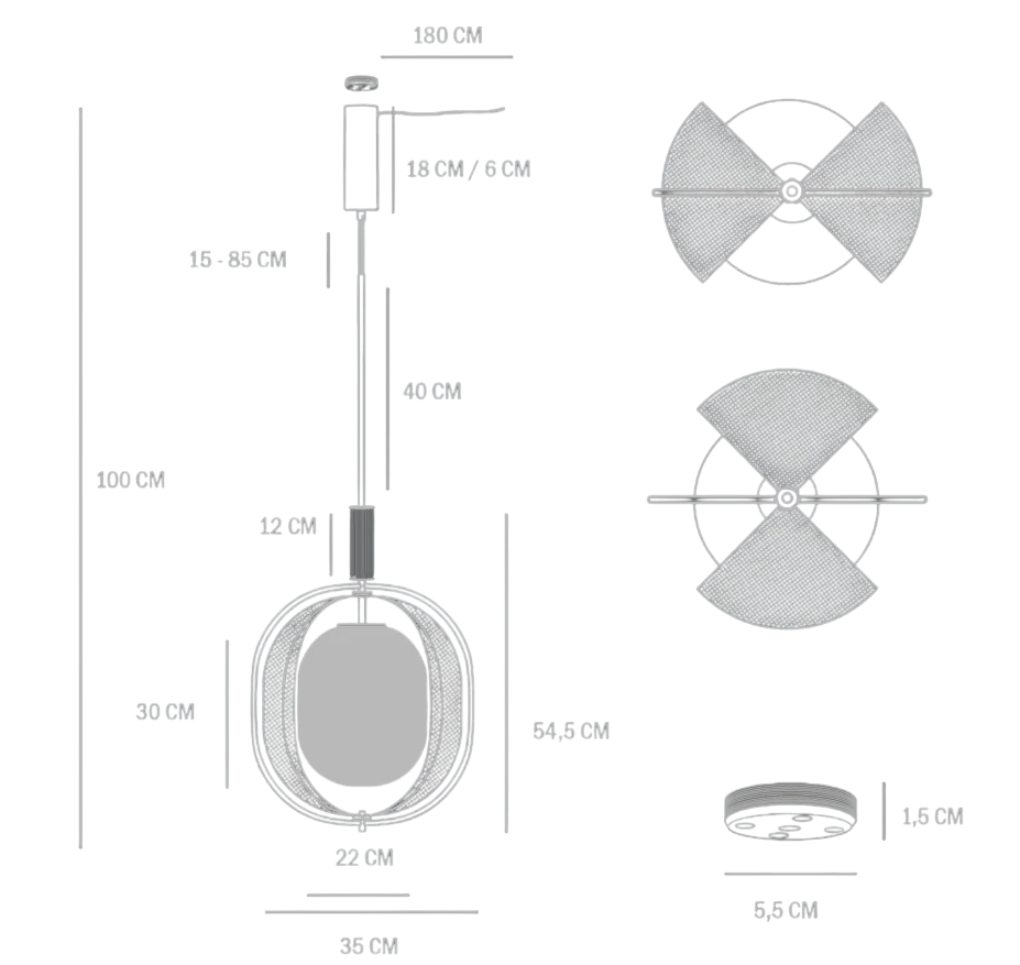 Шар из опалового стекла излучает мягкое, тёплое свечение. Оно мягко рассеивается в пространстве, создавая ощущение комфорта и спокойствия. Шар частично закрыт металлической сеткой с изящной перфорацией. Это оживляет его, играя световыми и теневыми эффектами. Они меняются в зависимости от угла зрения и освещённости. Это превращает окружающую среду в динамичную и живую.
