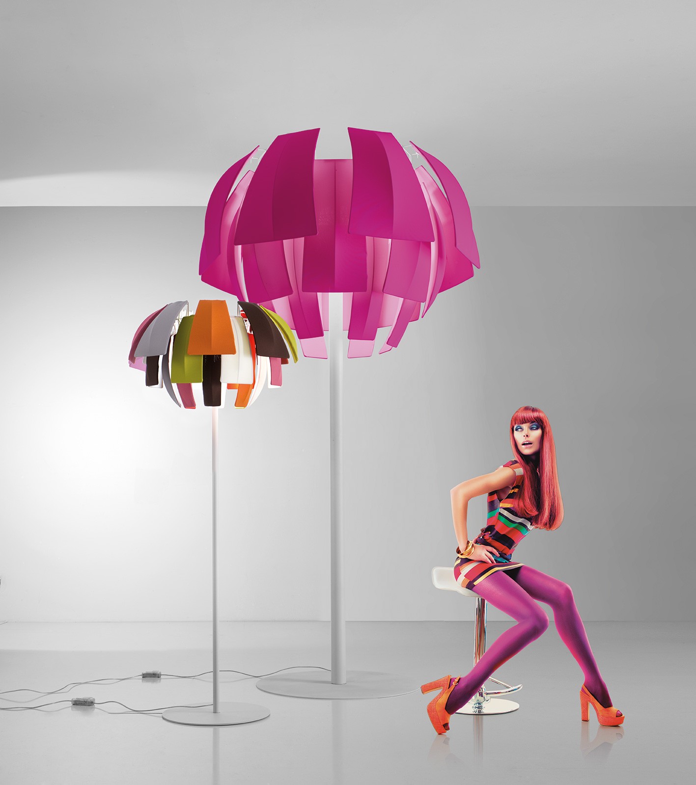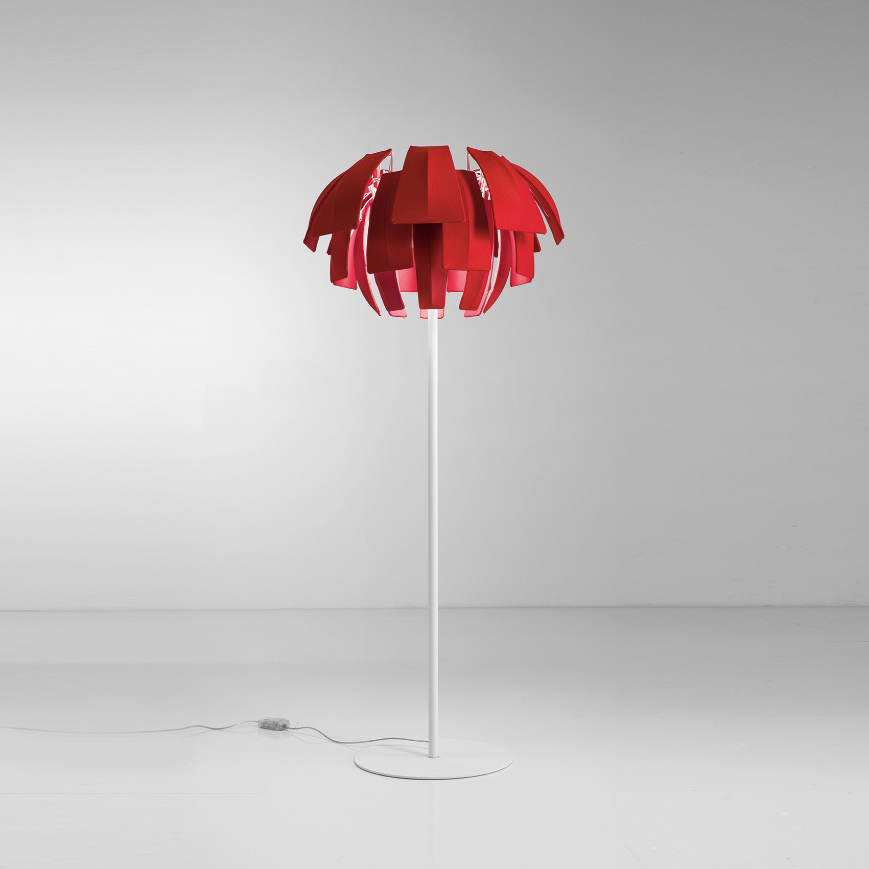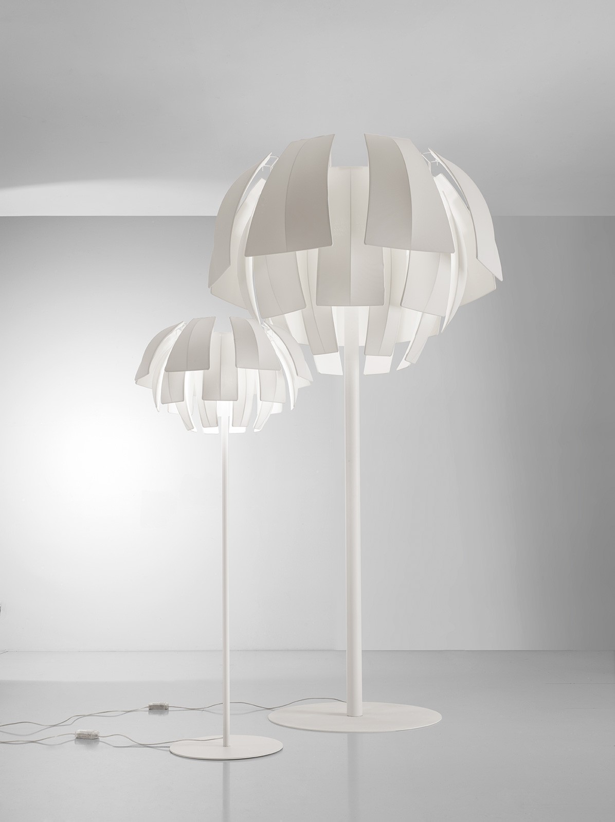 Коллекция подвесных светильников и торшеров Plumage - динамичная и яркая. Модели представлены тремя размерами для подвесных ламп и двумя для напольных версий. Абажур изготовлен из огнестойкой ткани с волокнами Trevira CS и представляет собой цветочный бутон. Благодаря этому светильники создают приятную, красивую и свежую атмосферу и подходят для использования в больших помещениях с высокими потолками.