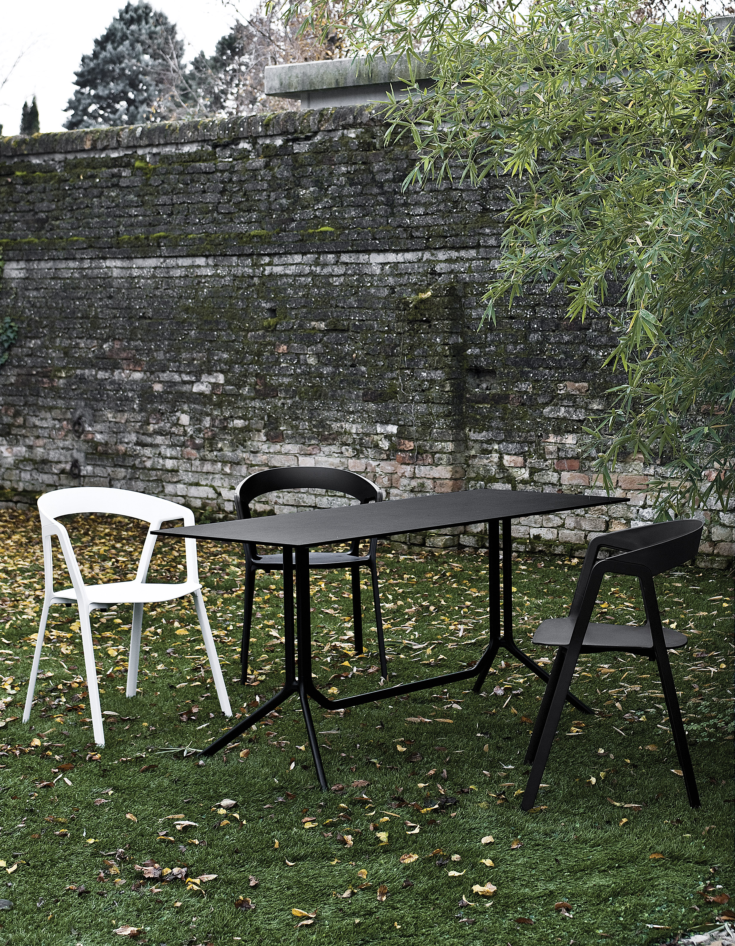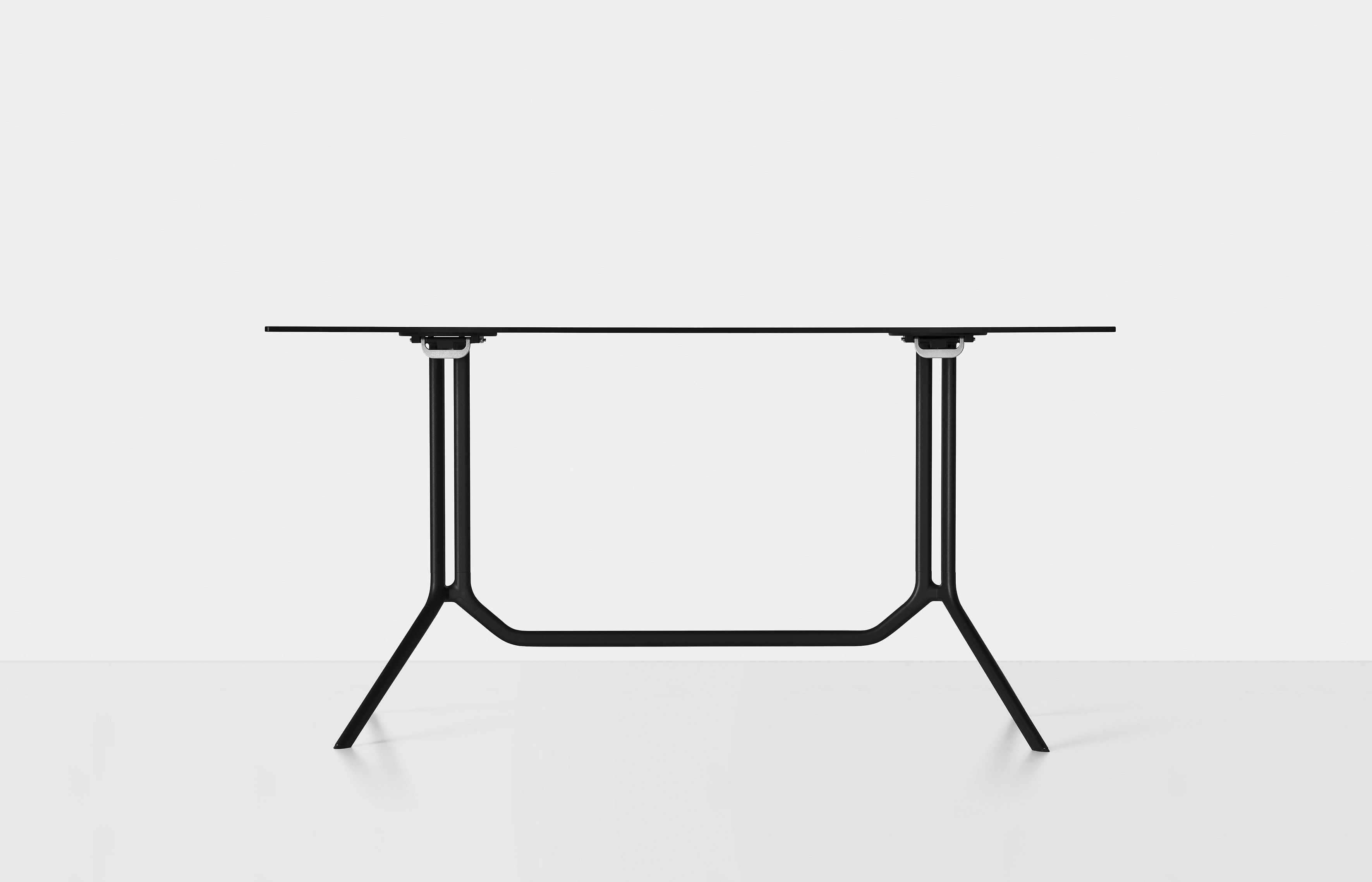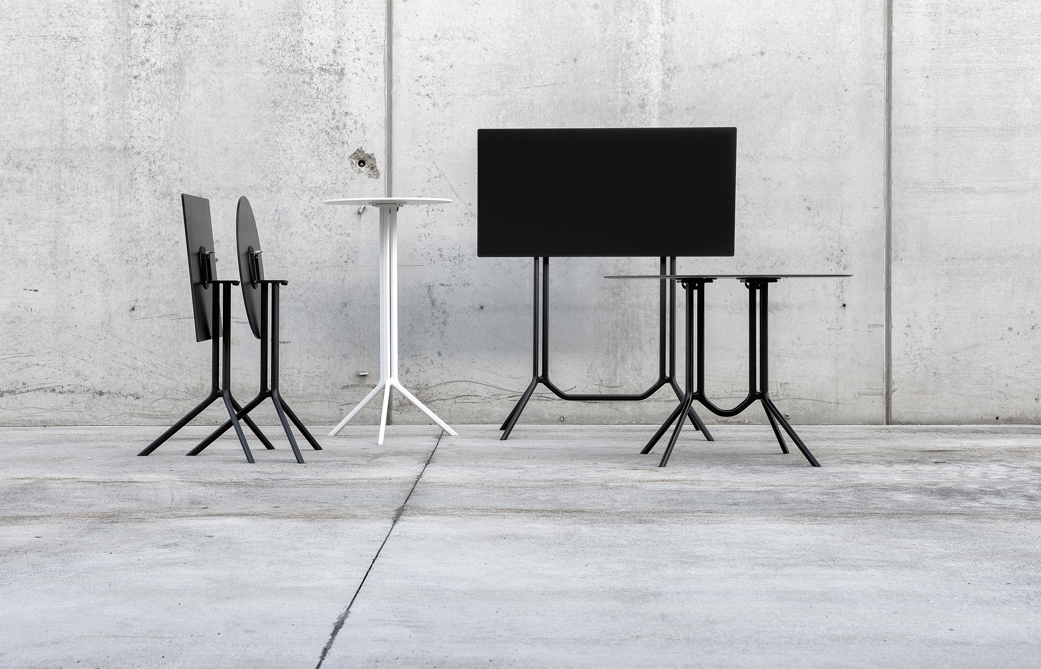Основание стола Poule изготавливается из алюминия. Столешница выполняется из ламината и представлена в круглой или прямоугольной форме. Основание и топ окрашиваются в черный или белый цвет. Доступно множество вариантов размера стола. Есть возможность заказать стол с откидным топом для компактного хранения. Детали о данной модели уточняйте у менеджеров или в PDF инструкции.