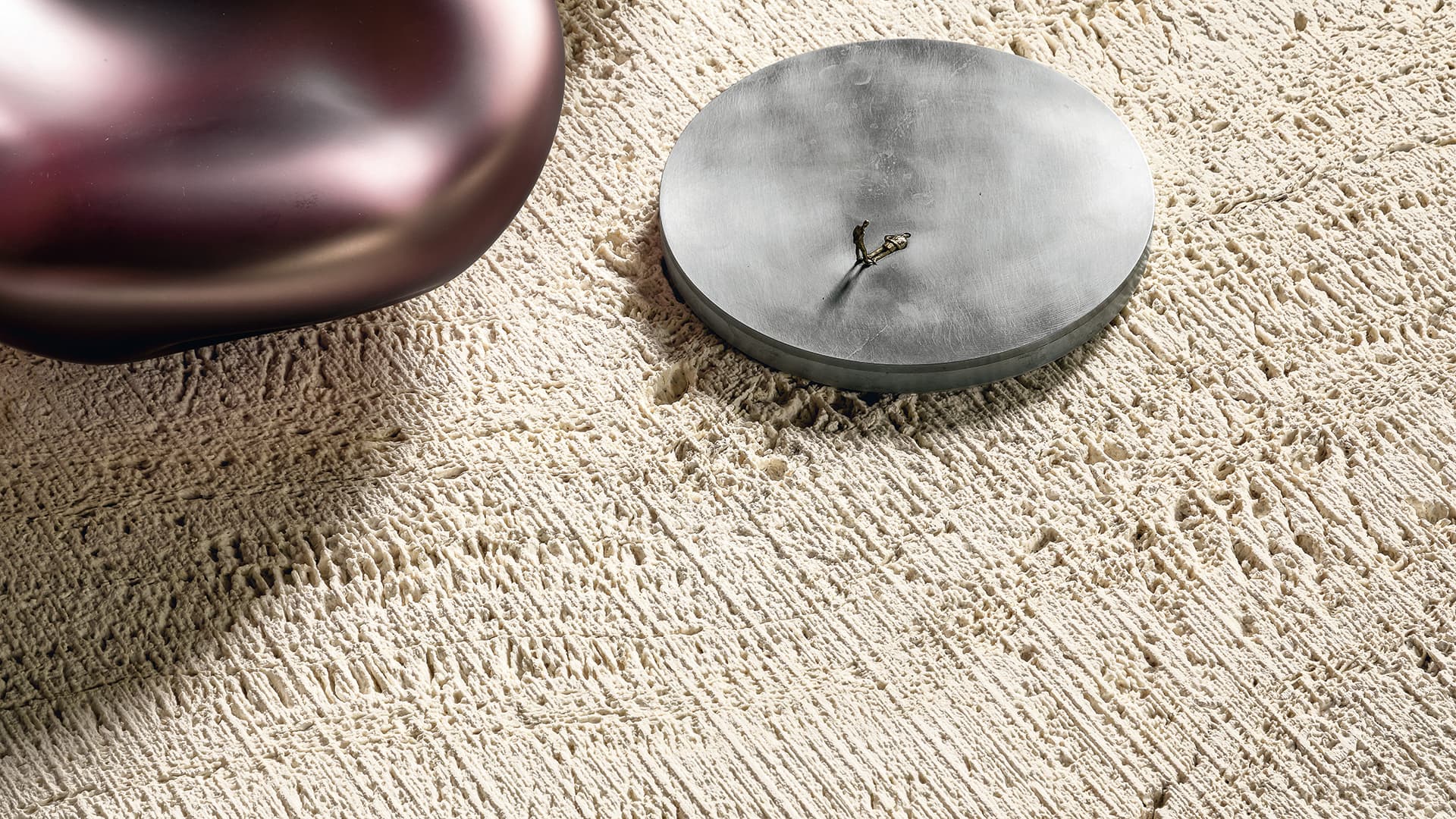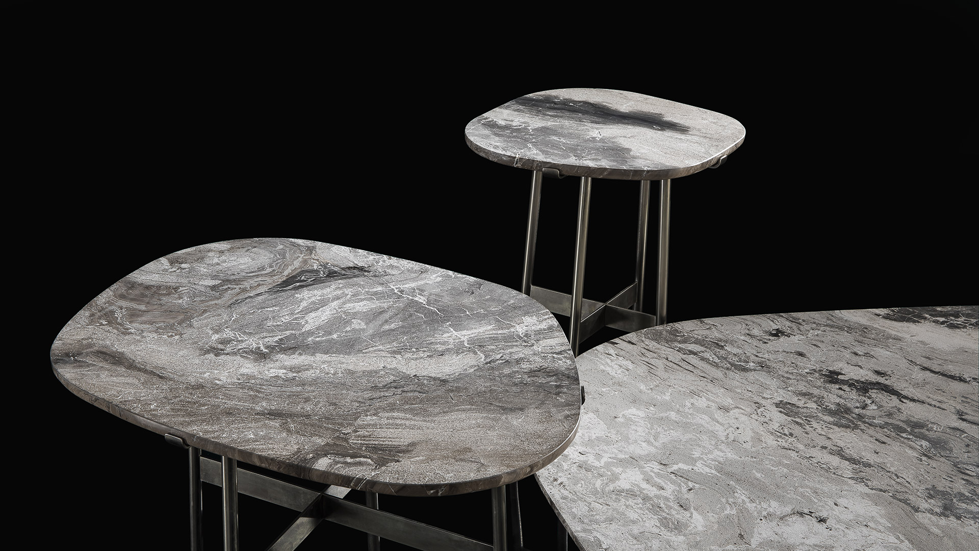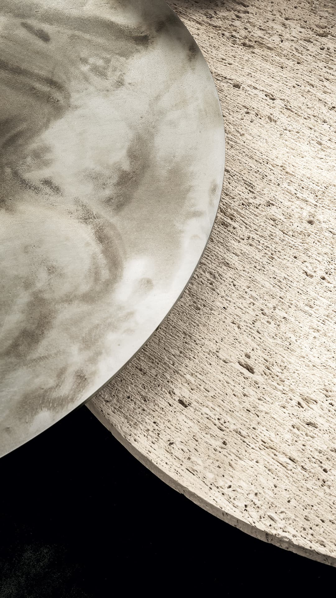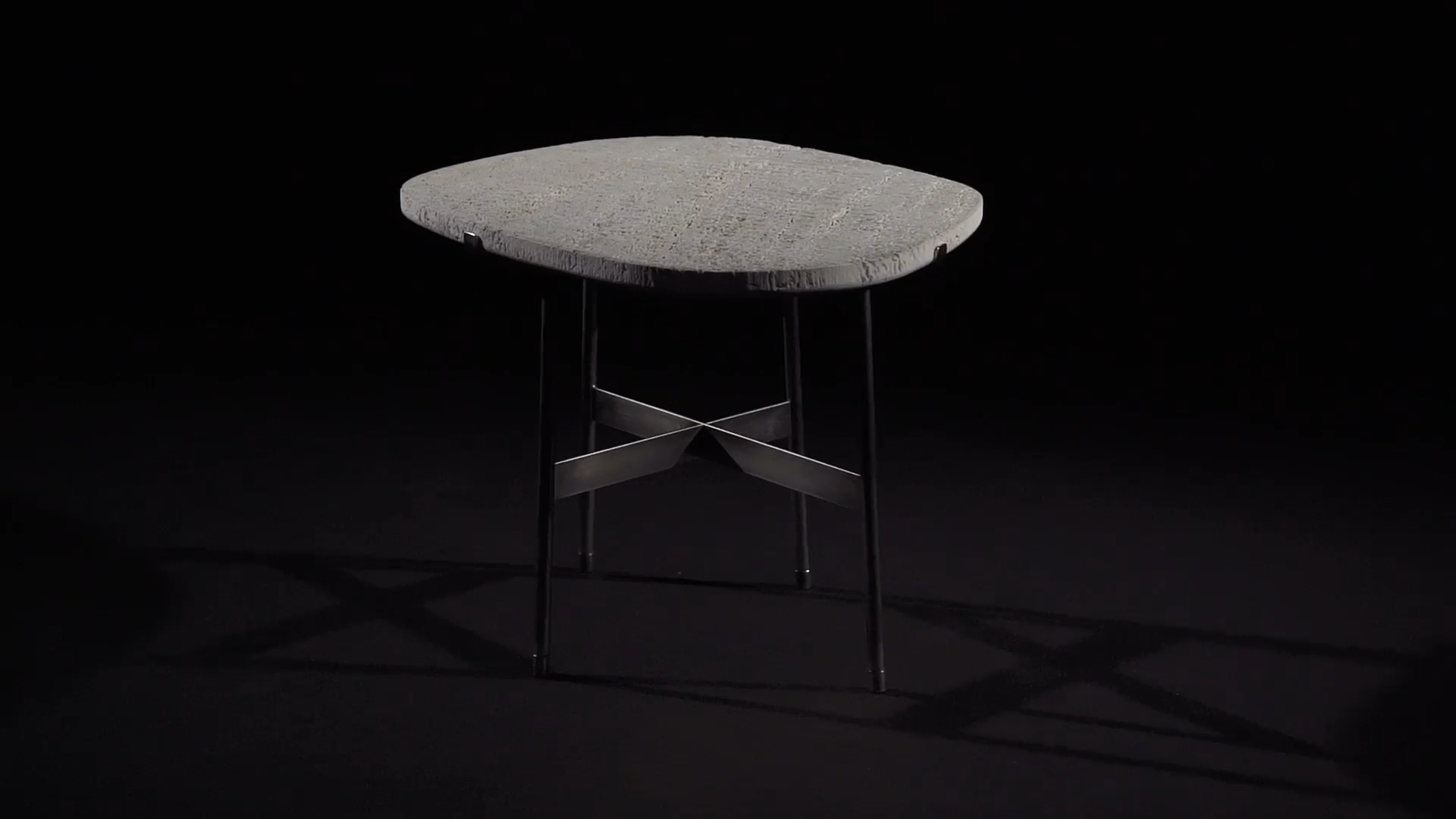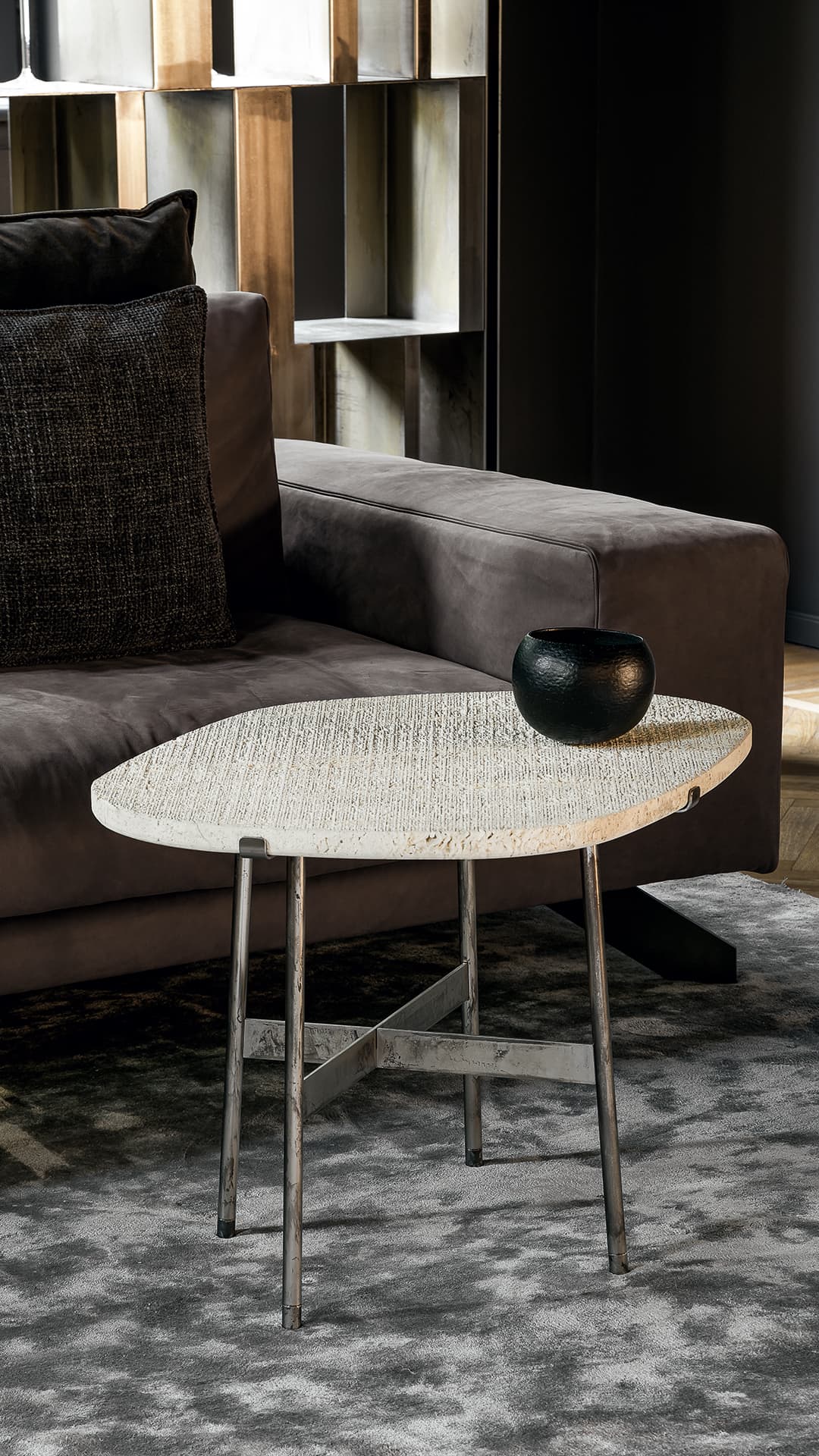 Металлические ножки, диаметром всего 2 сантиметра, соединенные прямоугольными стержнями, придают конструкции лёгкость и невесомость. Они не просто поддерживают столешницу, но и подчёркивают её текстуру, выявляя естественную шероховатость камня. Этот приём напоминает о стремлении раскрыть природную красоту материала, вернуть ему первозданную чистоту и величие.