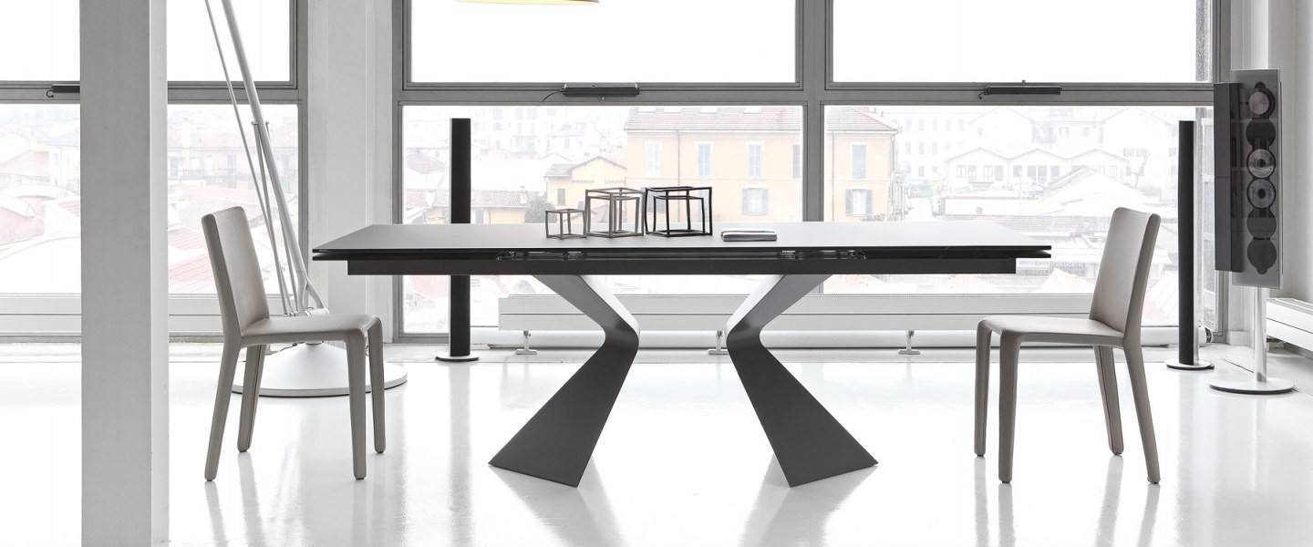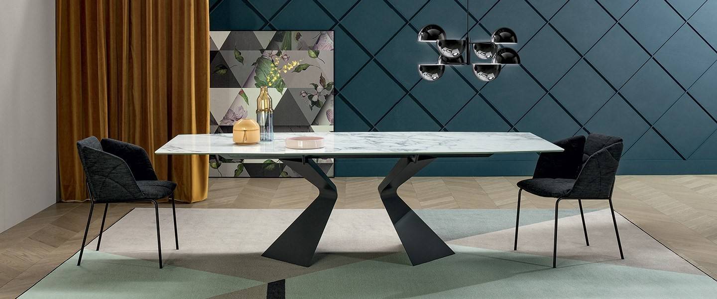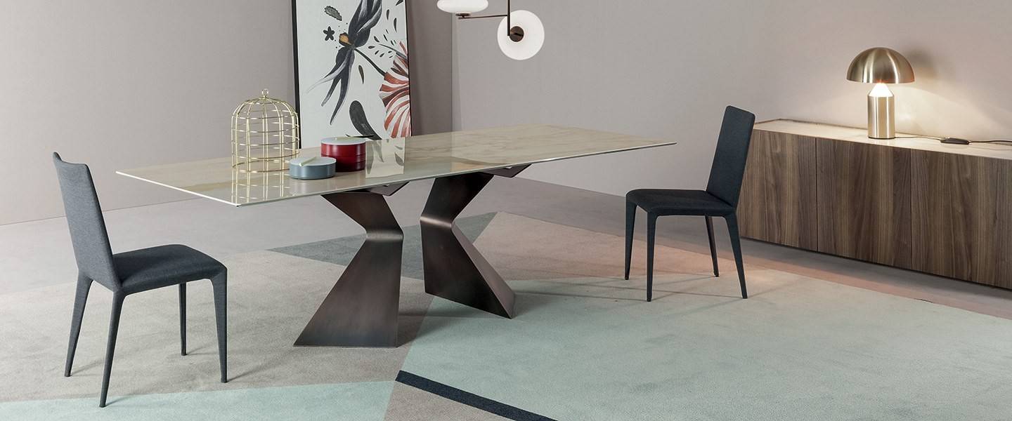 Основание доступно в различных вариантах отделки, что позволяет подчеркнуть художественную ценность стола и адаптировать его под разные стили интерьера. Столешница представлена в нескольких размерах и может быть выполнена как в фиксированном, так и в раздвижном исполнении. Раздвижная модель оснащена двумя независимыми боковыми вставками, которые легко увеличивают длину стола, сохраняя высокую устойчивость и эстетическую целостность.