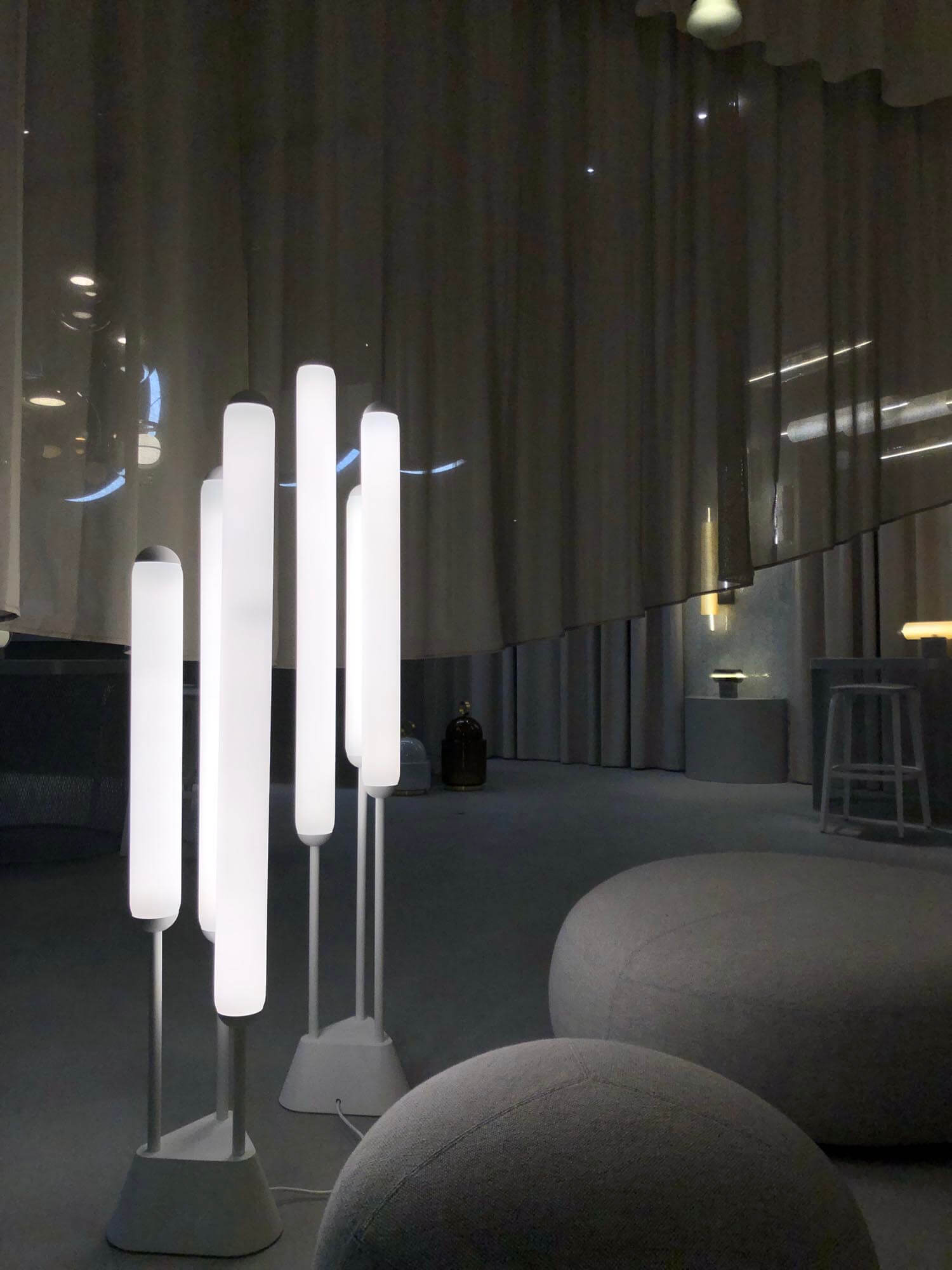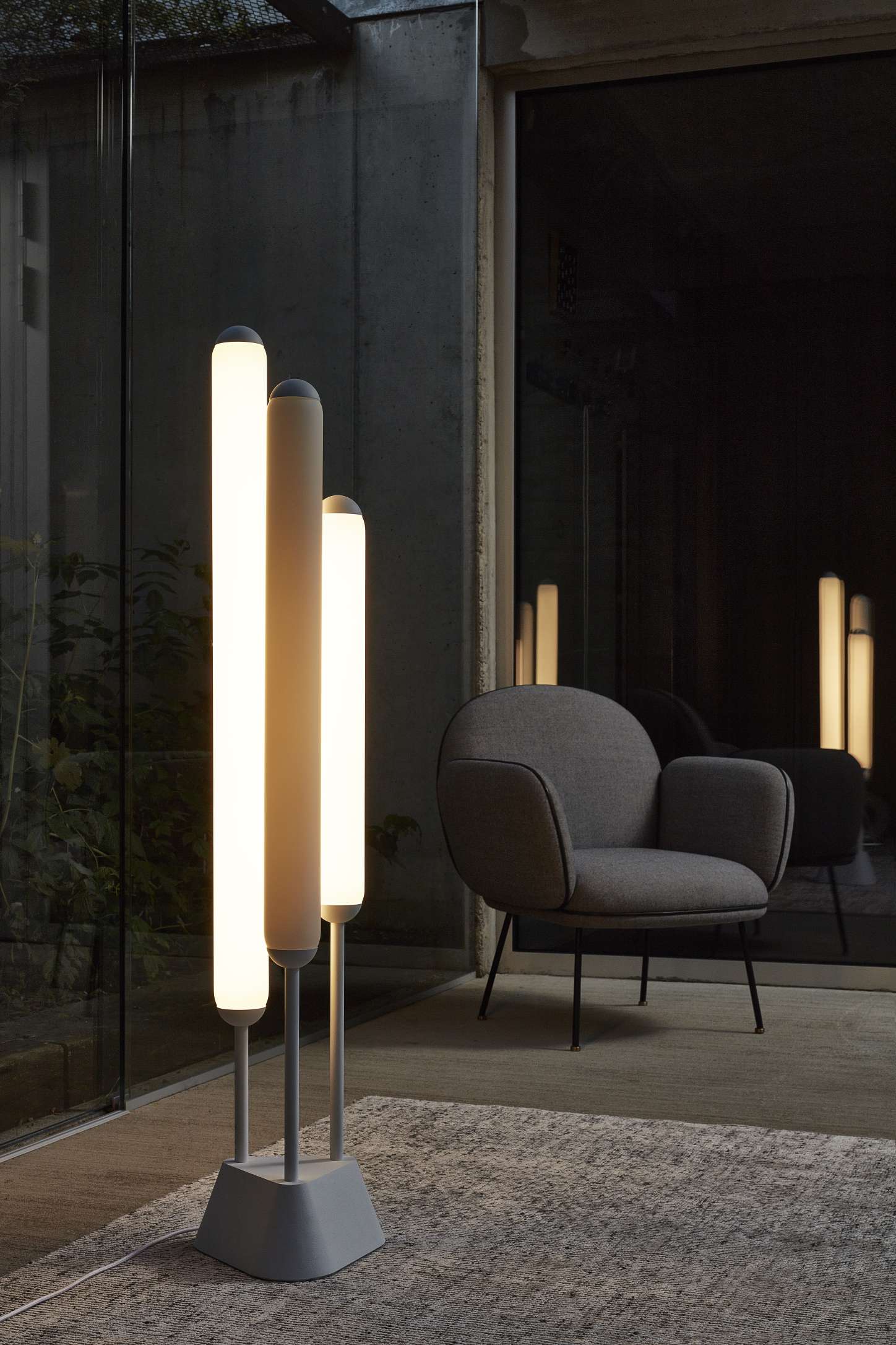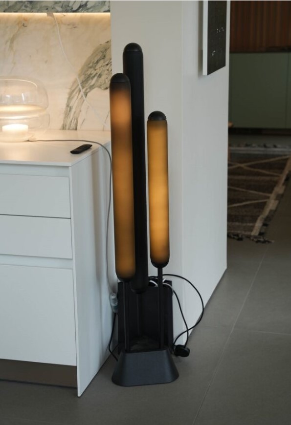 Светильник представлен в двух размерах и может быть выполнен из матового опалового либо дымчато‑серого стекла. Особенность модели — возможность комбинировать световые трубки разных цветов. Их рассеянное свечение формирует динамичную атмосферу, а матовая отделка привносит в облик элемента тонкую провокацию.