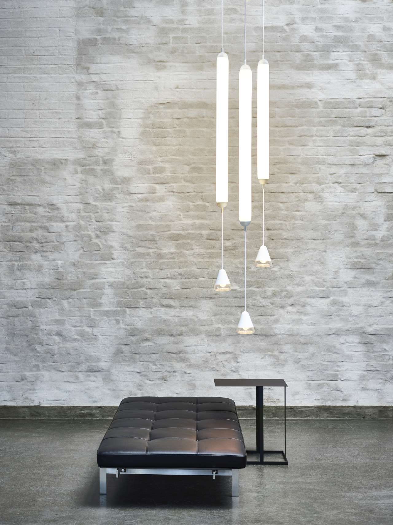 Устроен он просто: стеклянная трубка со светодиодом внутри и заглушки из лёгкого прочного дюралюминия. Крепится к потолку шнуром с разъёмом Brokis. Из отдельных трубок можно создавать удивительные инсталляции, например композицию из трубок, соединенных с экраном, который разделяет пространство и создает интимную атмосферу, граничащую со сценографией.