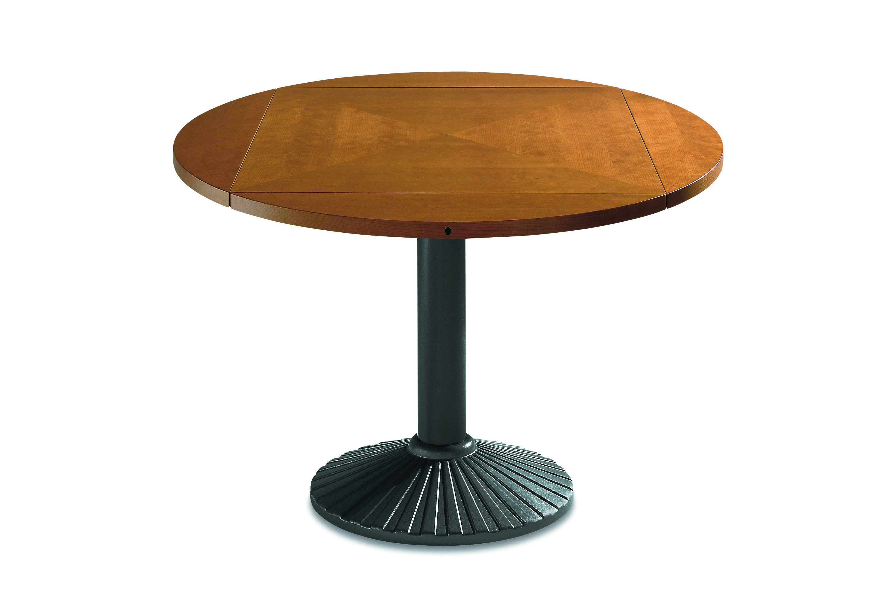Обеденный стол-трансформер Quadritondo имеет крепкое основание из штампованного металла, которое доступно в трех вариантах — черный, графитовый или алюминиевый цвет. Топ выполнен из древесины и покрыт защитным слоем против царапин. Доступны несколько вариантов отделки. Стол раскладывается за счет четырех дополнительных секций, расположенных под столешницей (становится круглым). Детали уточняйте у менеджеров или в PDF инструкции.