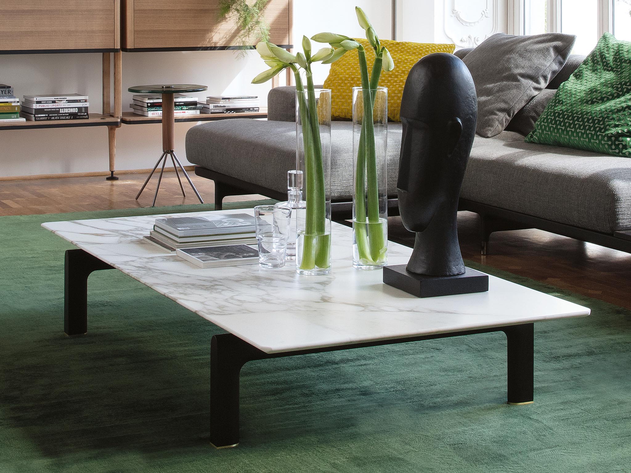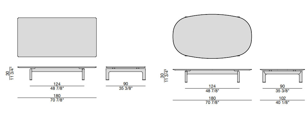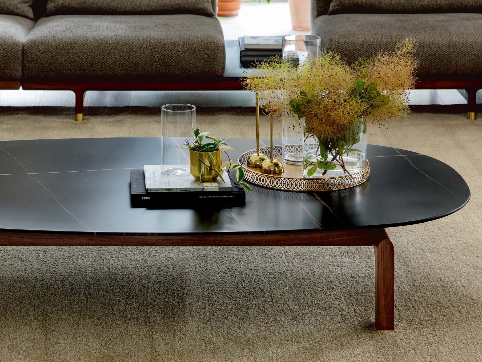 Форма журнального столика Quay может быть как овальной, так и прямоугольной, что делает его универсальным решением для любого пространства. Прямоугольная версия столика с её строгими линиями создаёт чёткий визуальный контраст с округлой столешницей, придавая композиции динамику и выразительность. Овальная форма, напротив, более плавная и мягкая, идеально подходит для создания уютной атмосферы в небольших помещениях.