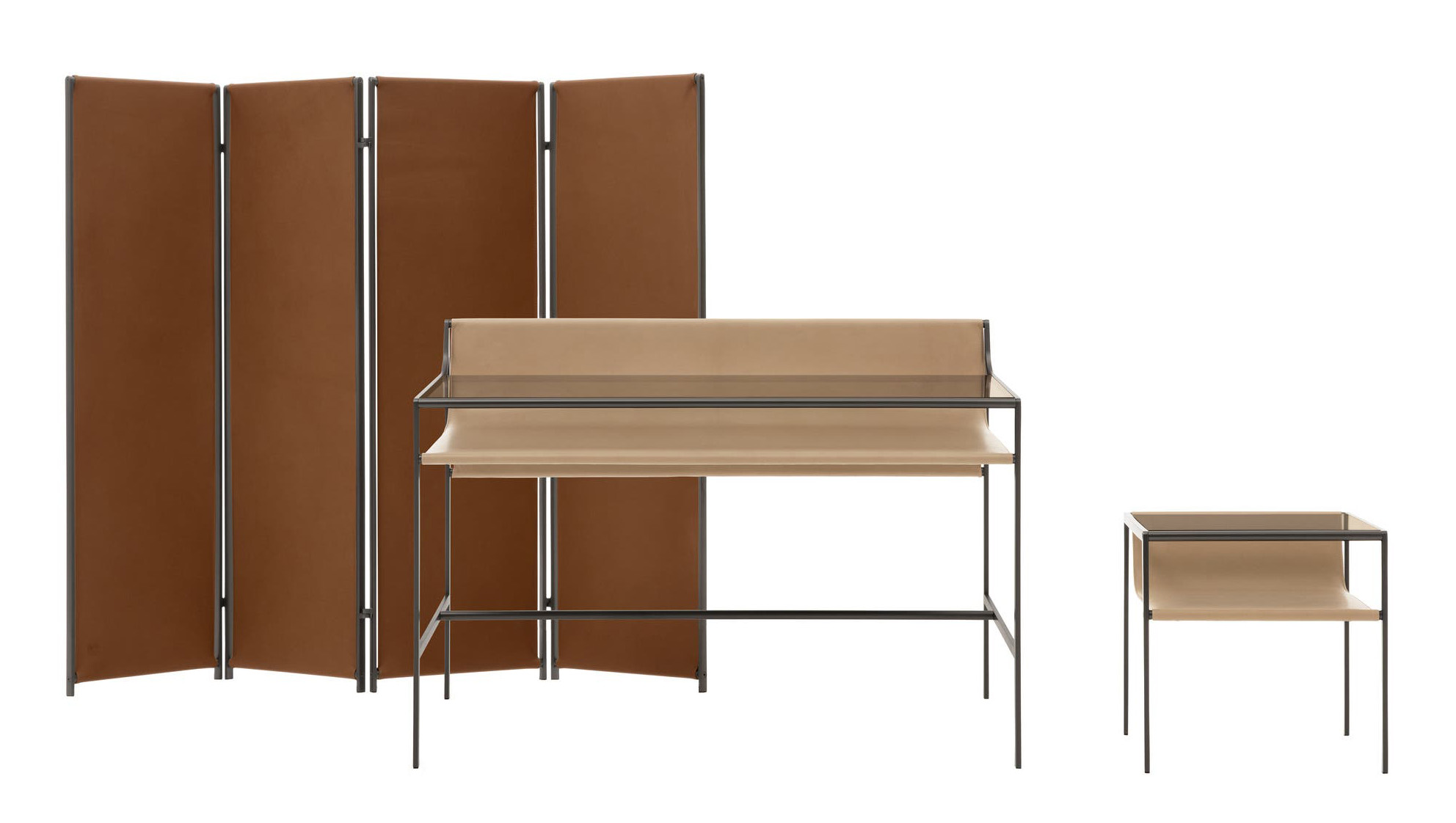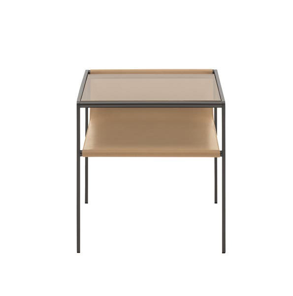 Особое место в коллекции занимает многофункциональная столик-тумбочка. Он представляет собой яркий пример инновационного подхода к дизайну. Столик сочетает в себе кожаную полку для хранения книг, журналов или других предметов и стеклянную столешницу. Такое сочетание материалов придает изделию современный и стильный вид, делает его универсальным элементом интерьера. Стеклянная поверхность добавляет прозрачности и легкости, а кожаная полка придает уют и теплоту. Этот контраст материалов напоминающий стойку дисплея или витрину, визуально обогащает пространство и делая его более элегантным и функциональным.