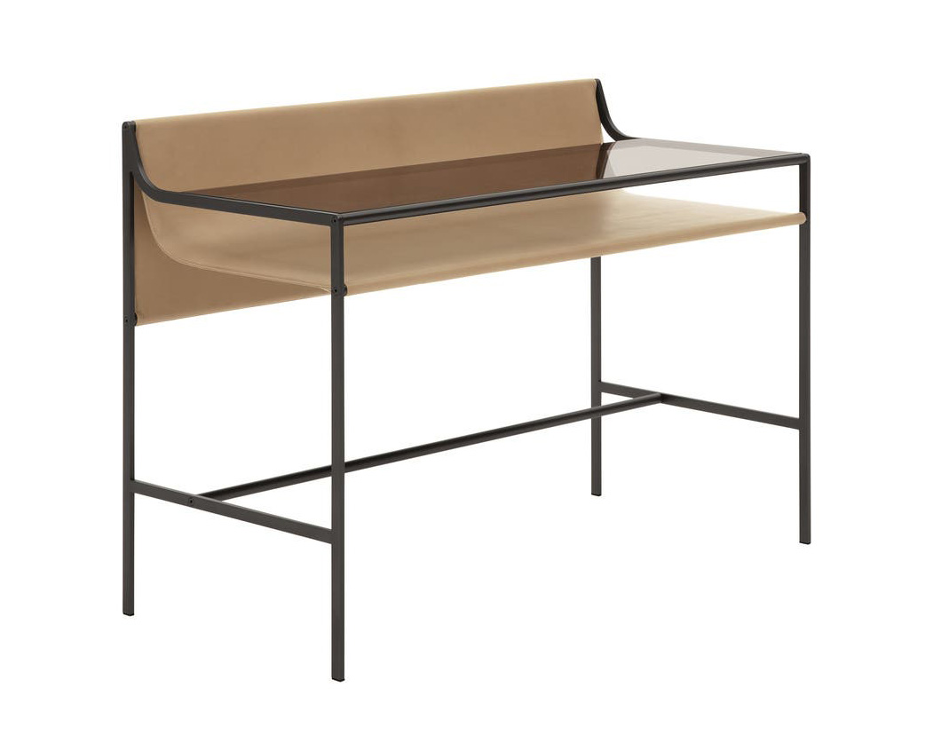 Стеклянная столешница стола — это ключевой элемент его дизайна. Прозрачное и лёгкое стекло придаёт столу лёгкость и визуально расширяет пространство. Этот эффект делает предметы на кожаной полке под столешницей центром внимания. Он создаёт ощущение глубины и многослойности. Кожаная полка не только хранит вещи, но и демонстрирует аксессуары. К ним относятся книги, канцелярские принадлежности или фотографии. Всё это добавляет столу индивидуальности и стиля.