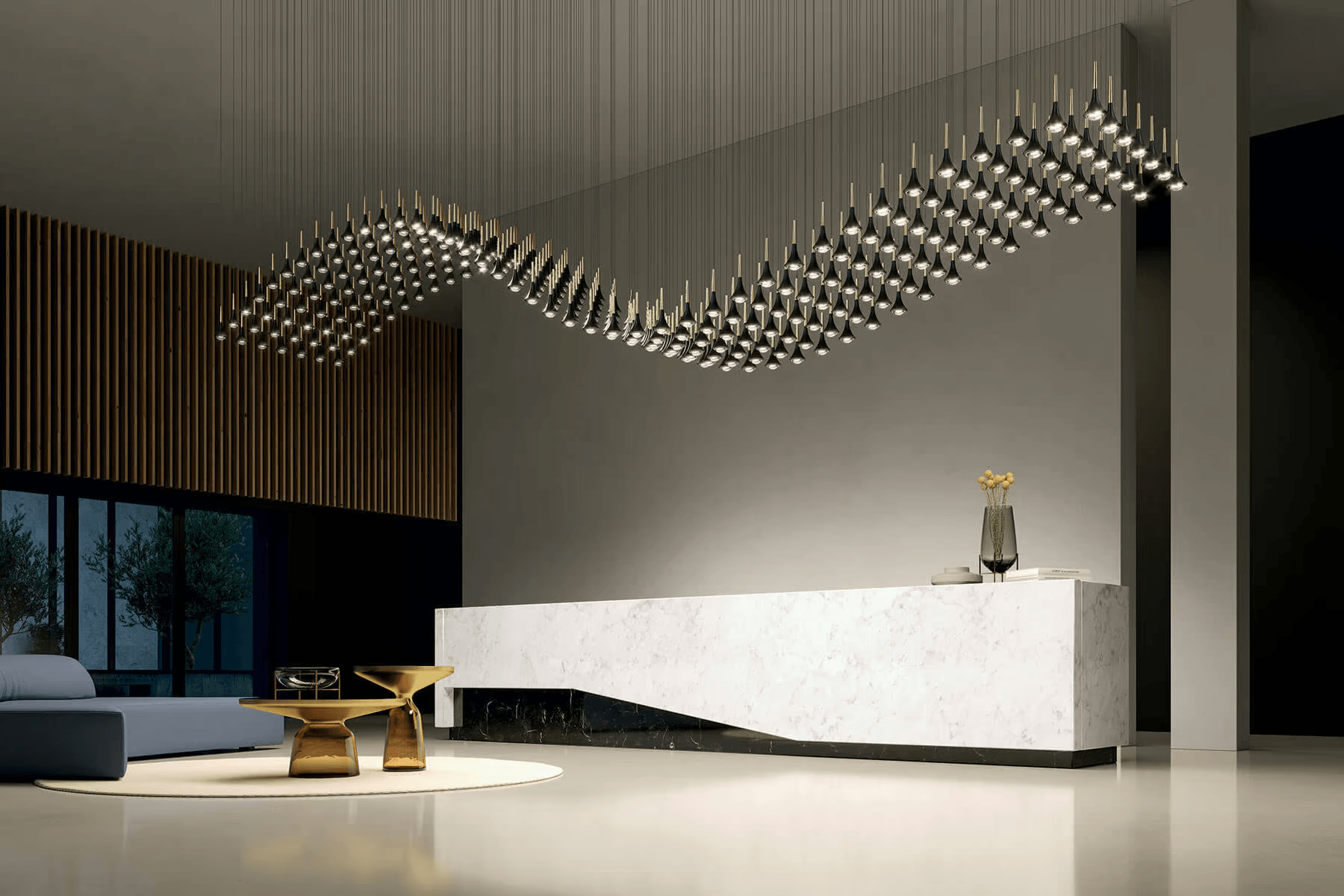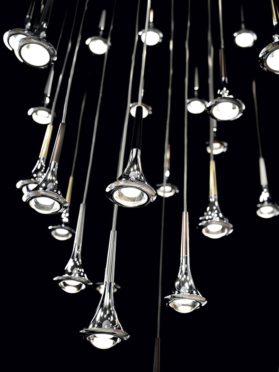 Вдохновлённый лёгкостью весеннего дождя, светильник Rain воплощает движение капли. Она запечатлена в определённый момент, подвешенная в пространстве и во времени.