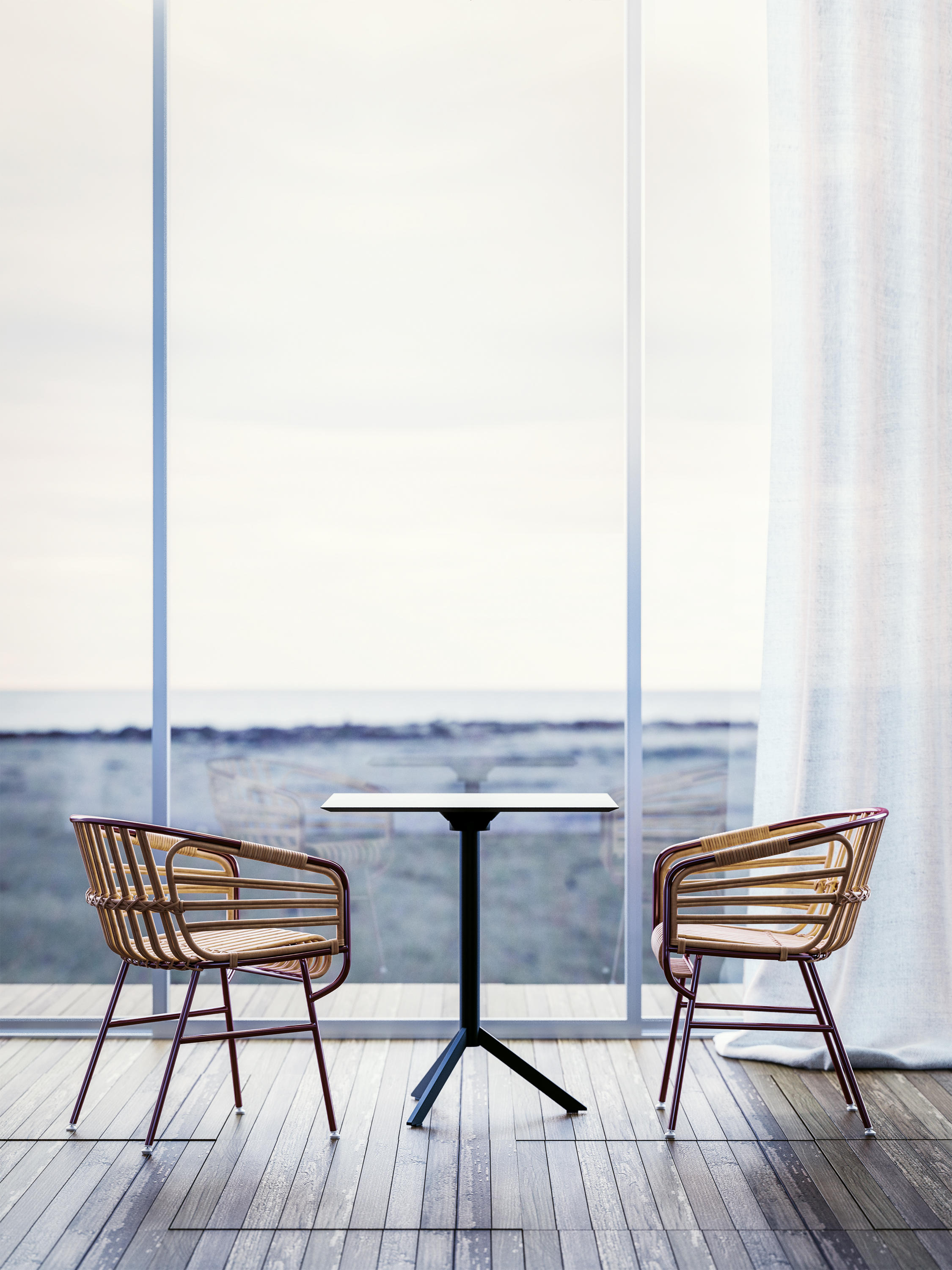 Каркас кресла Raphia изготавливается из металла, который окрашивается в четырех вариантах цвета: белый, черный, зеленый и бордовый. Сиденье, спинка и подлокотники оплетены натуральным ротангом. Стул можно использовать на улице, благодаря использованию специальных влагостойких материалов. Подробности уточняйте у менеджеров.
