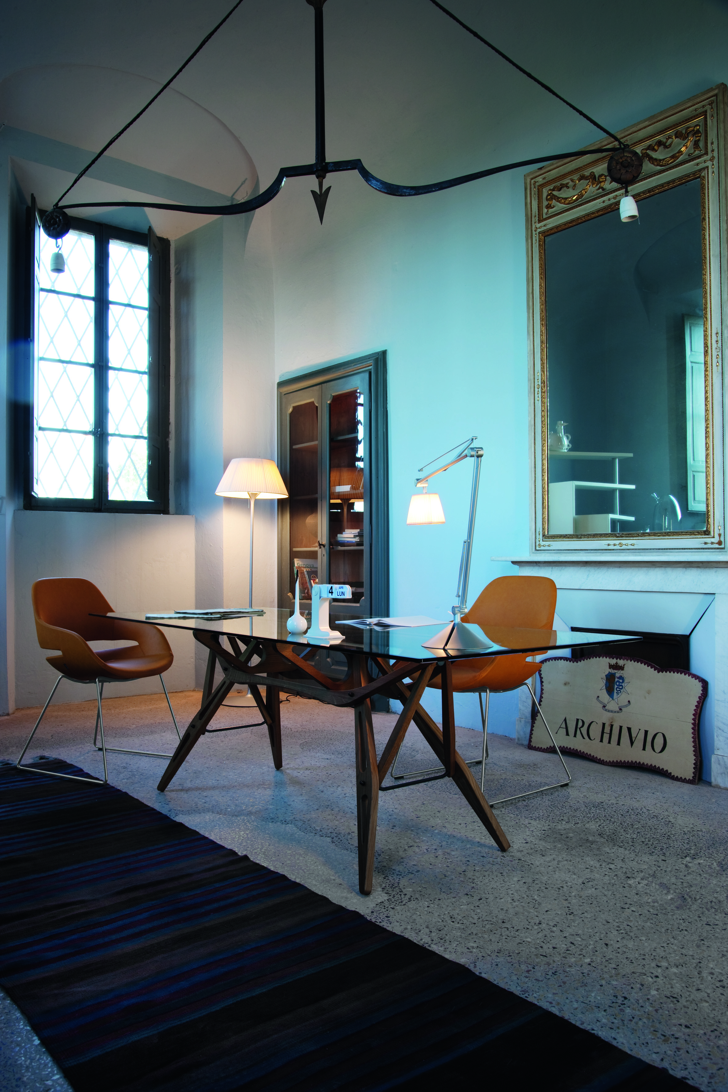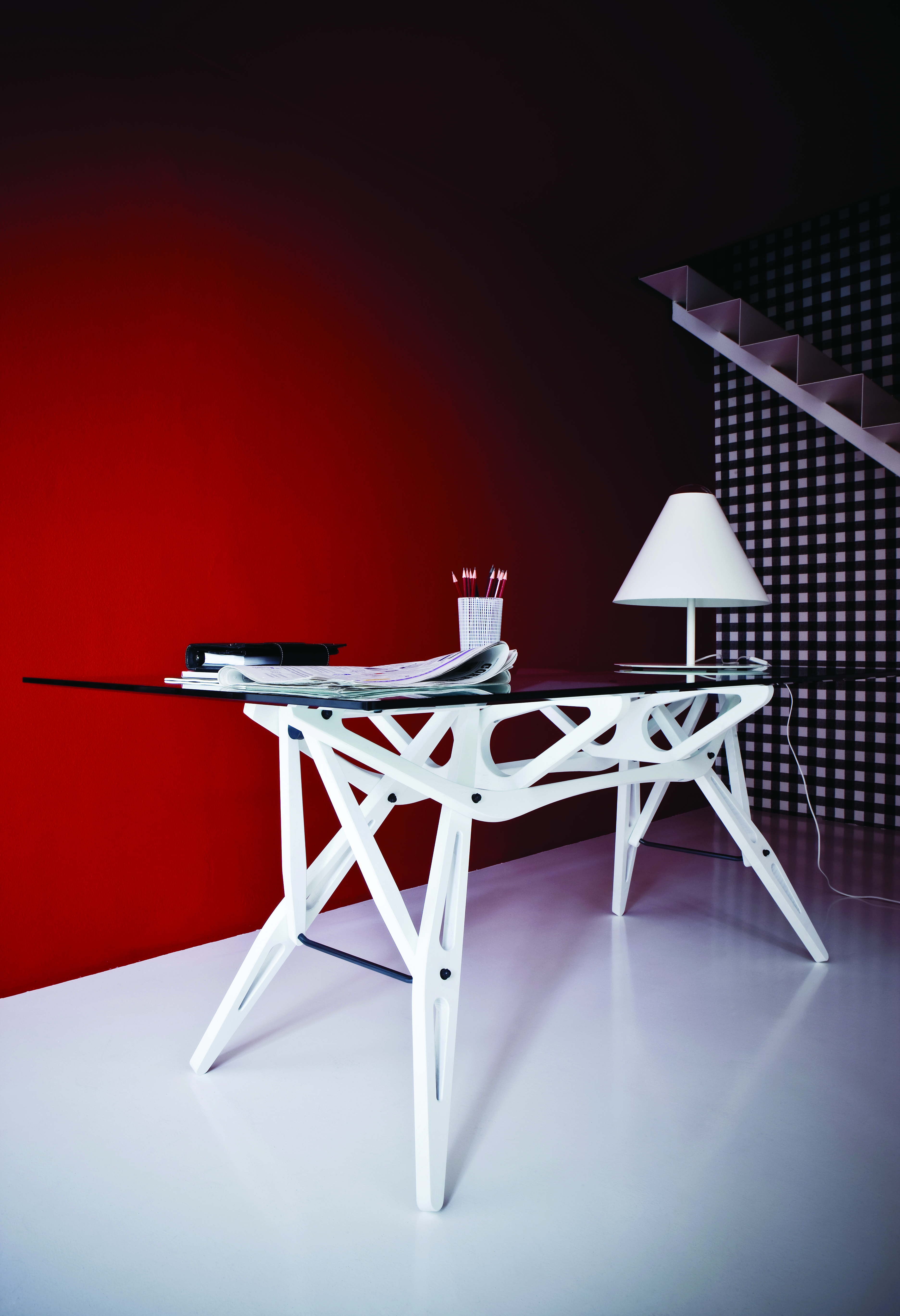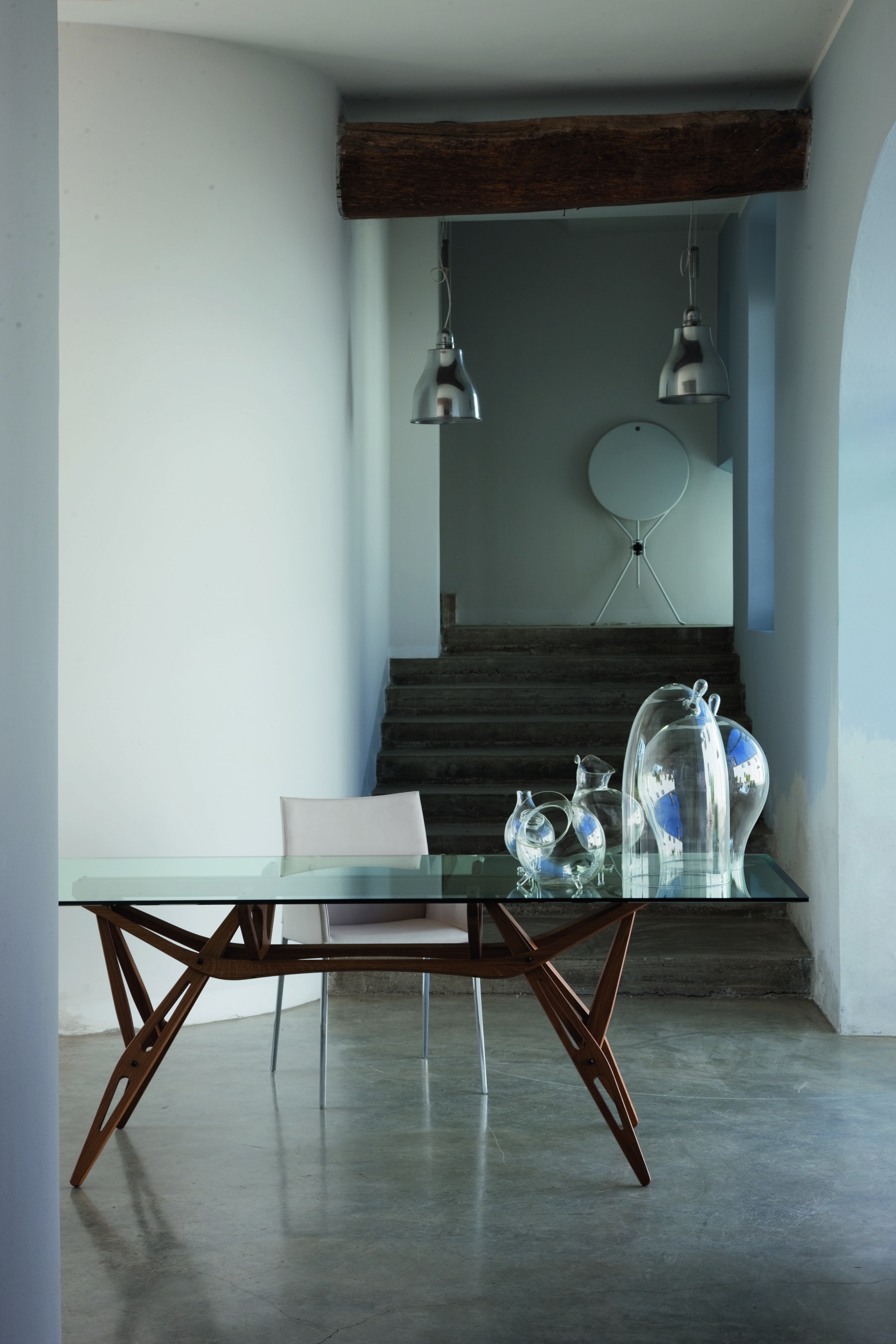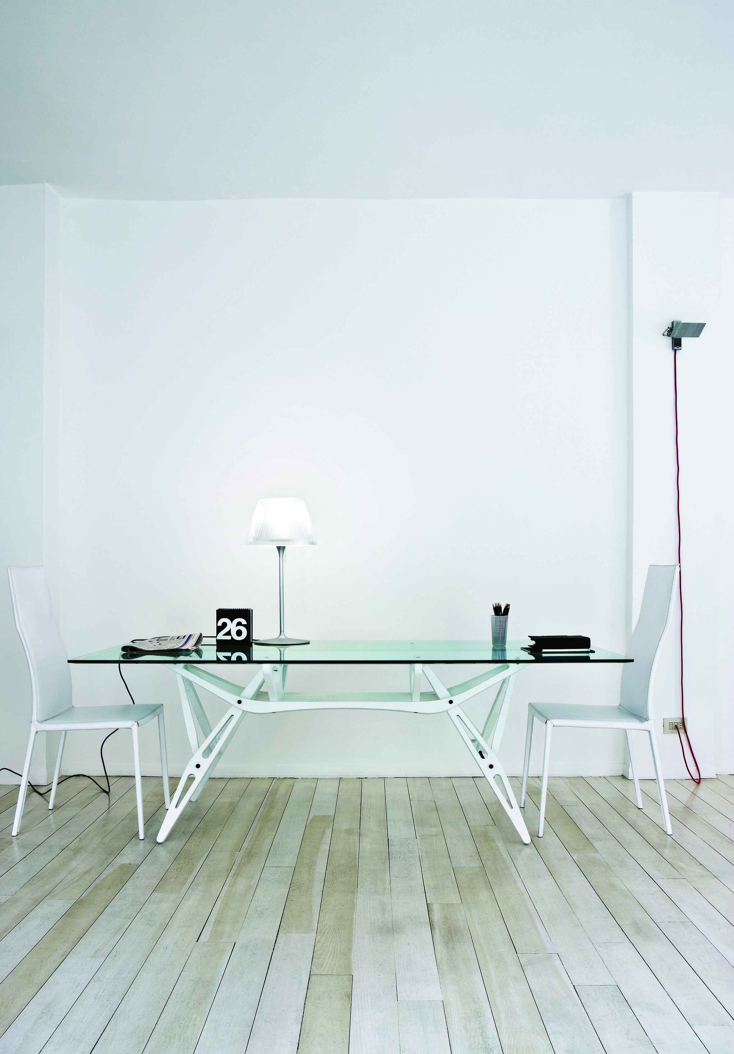 Дизайнерский стол Reale со стеклянной столешницей. Топ имеет толщину 15 мм. Основание выполнено из лакированной вишни либо дуба и тонировано под венге или орех. Предлагается также в обработке черным или белым лаком, не закрывающим поры древесины. Возможны различные варианты отделки. Подробнее уточняйте у менеджеров или в PDF инструкции.
