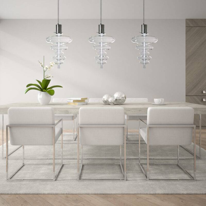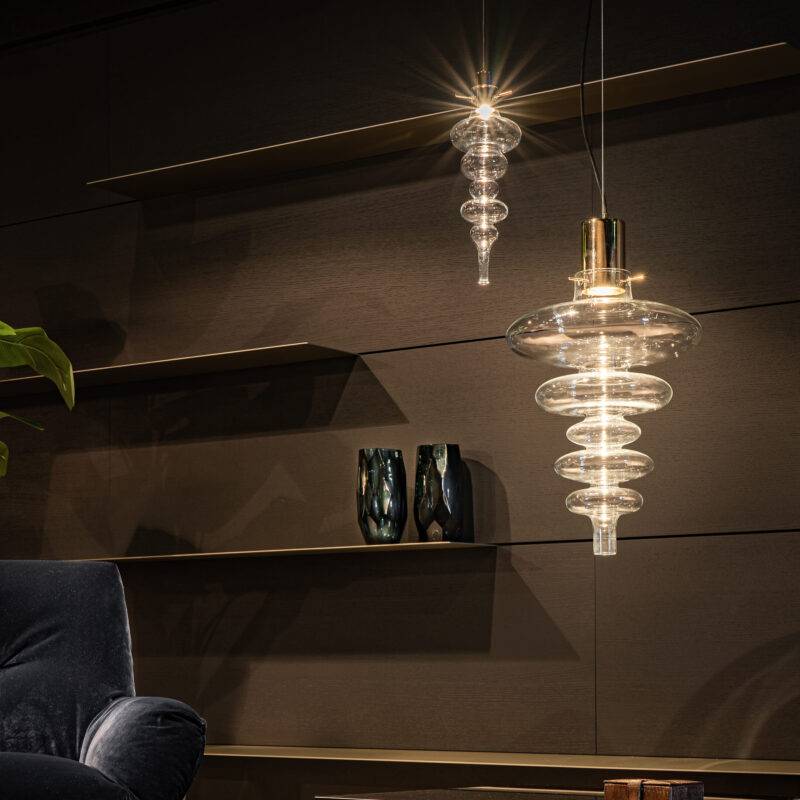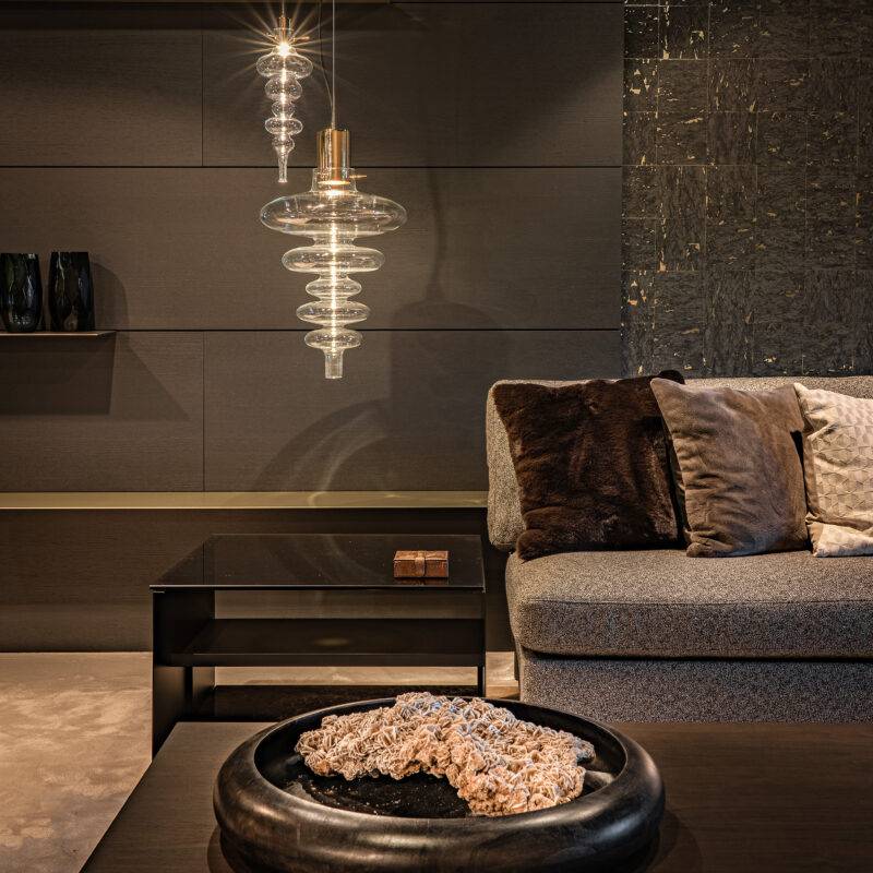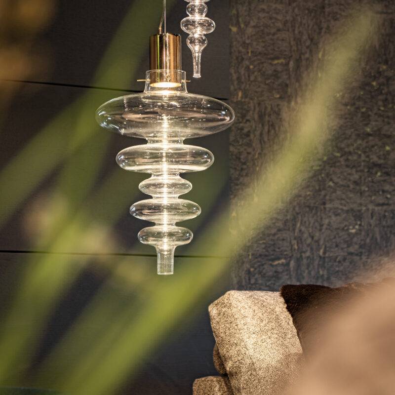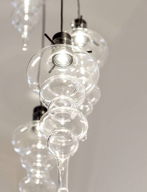 Подвесные светильники серии Reflexx представляют собой уникальные произведения искусства, созданные мастерами с использованием традиционных техник стеклодува. Каждый светильник разработан таким образом, чтобы создать неповторимый световой эффект, формирующийся благодаря особой форме стеклянных элементов, созданных вручную.