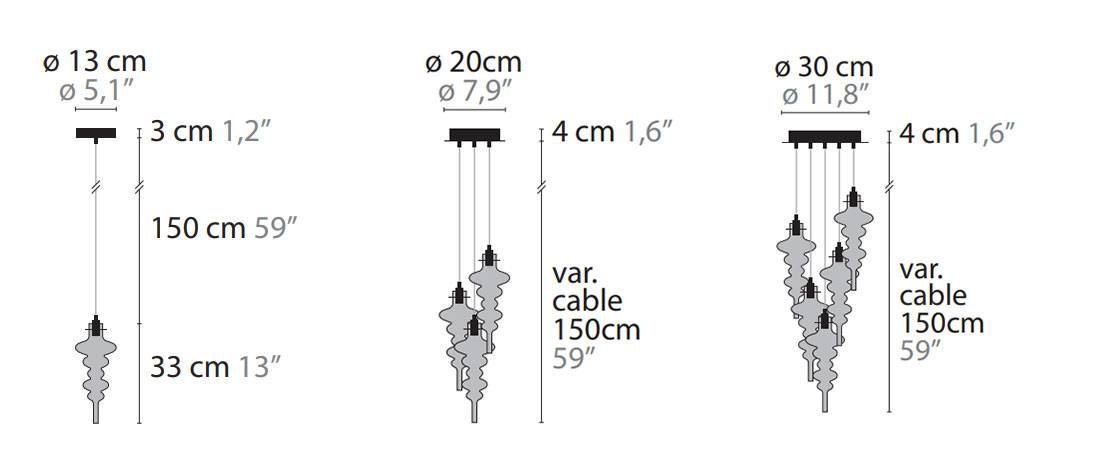 Эти лампы выделяются своей индивидуальностью. Их конструкции разнообразны: от простой одинарной модели — до сложных композиций. В сложных композициях может быть три, пять, восемь и даже шестнадцать источников света. Каждое изделие отличается уникальным дизайном. Этот дизайн подчёркивает мастерство изготовления и внимание к деталям.