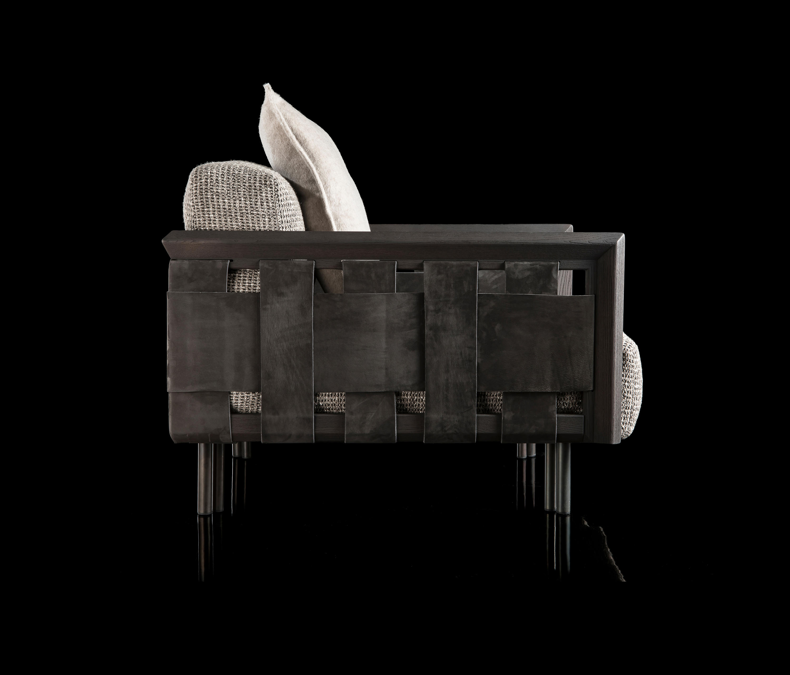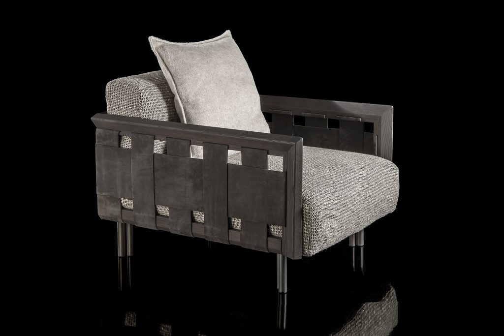 Особое очарование креслу придаёт искусная плетёная кожа. Эта техника, вдохновлённая портновским мастерством Henge, превращает простую мебель в произведение искусства.