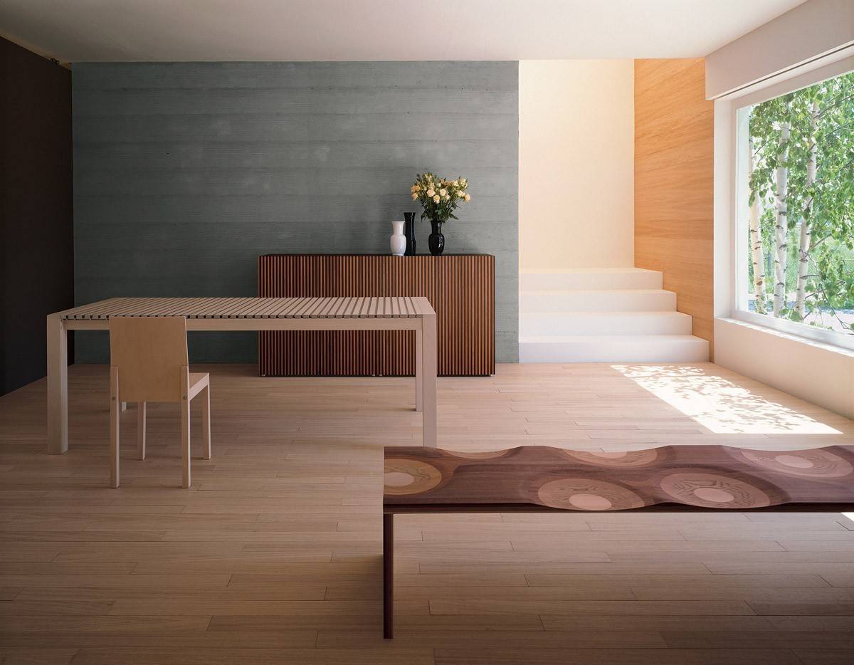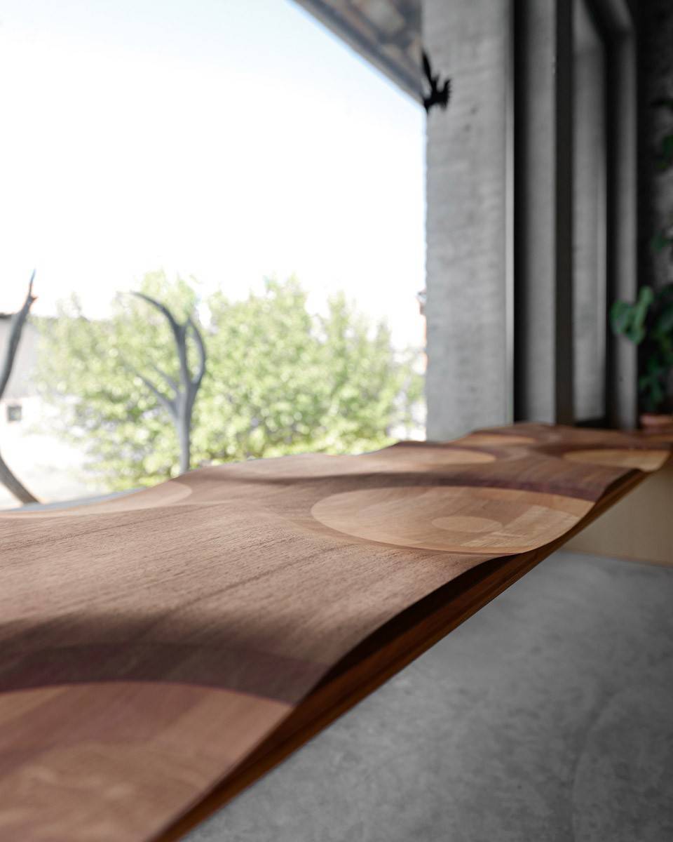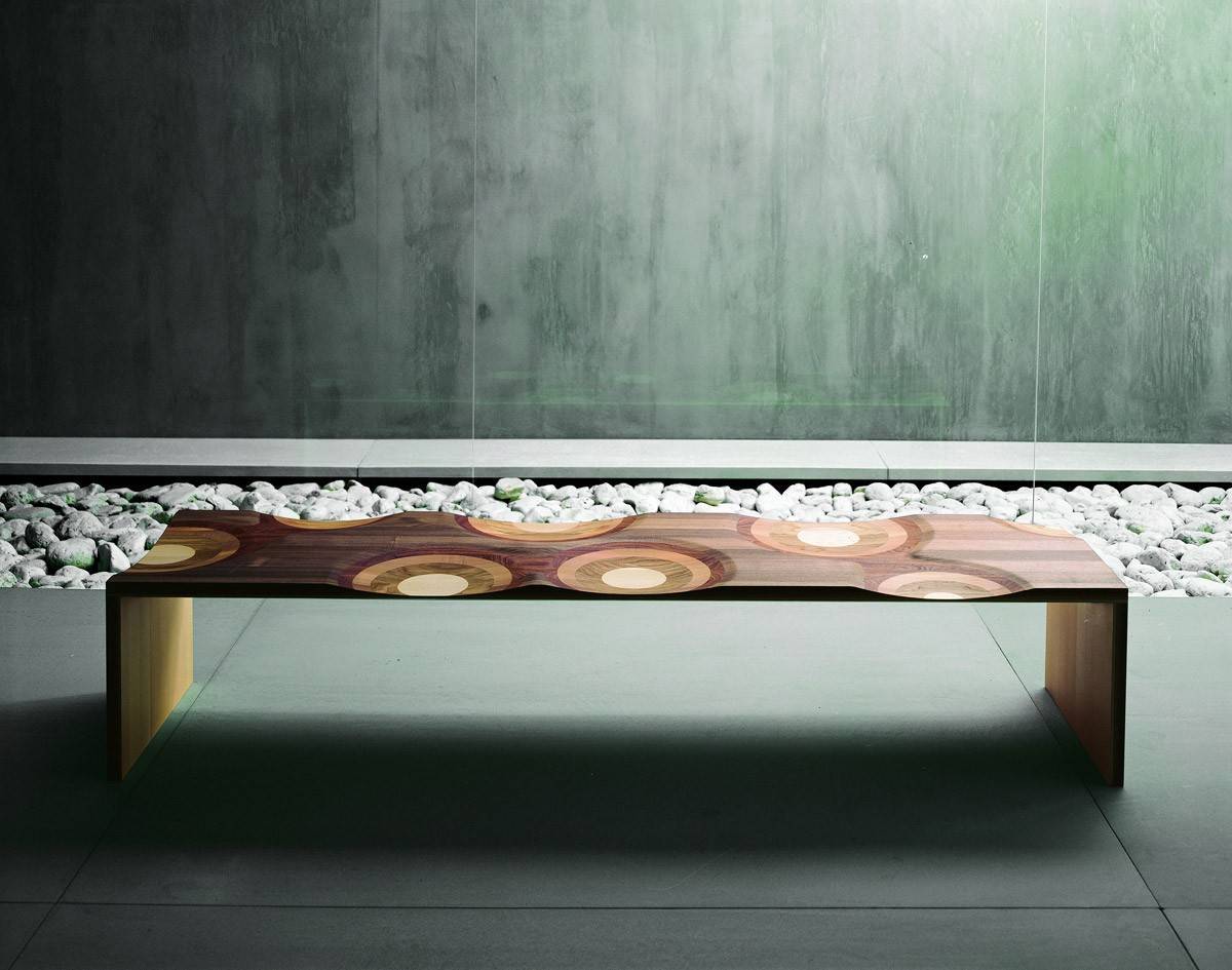 Модель Ripples выполнена из многослойной ламинированной фанеры, из массива пяти разных пород дерева. Проведя рукой по поверхности скамьи нельзя определить, где заканчивается орех и начинается красное дерево, вишня, дуб или ясень. На поверхности скамьи вручную вырезано несколько "сидений", что делает скамью Ripples не только красивой, но и очень удобной.