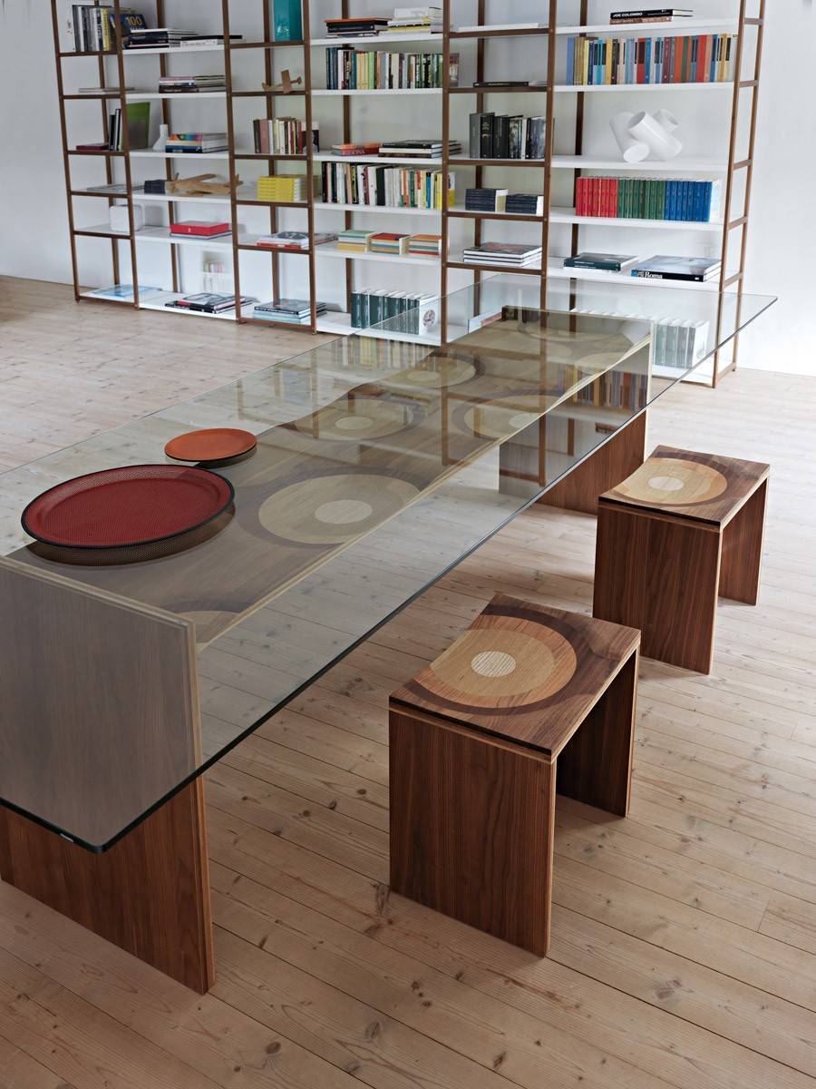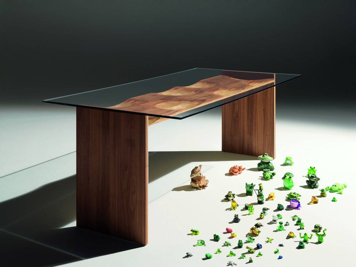 Стеклянная столешница стола Ripples акцентирует внимание на структуре многослойного деревянного основания, состоящего из пяти разных пород. Цвет и направление волокон подобраны таким образом, чтобы создать удивительный, элегантный эффект. Стол Ripples доступен в нескольких размерах, о которых вы можете узнать из ПДФ-инструкции.