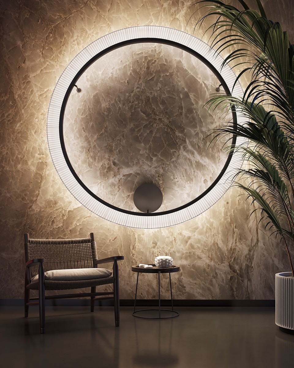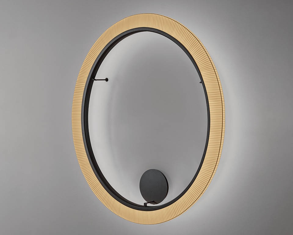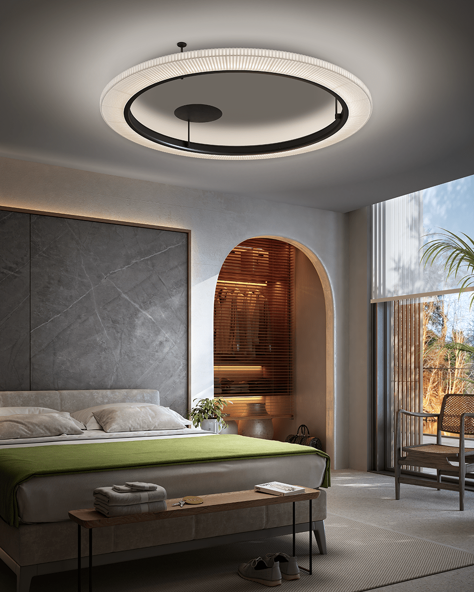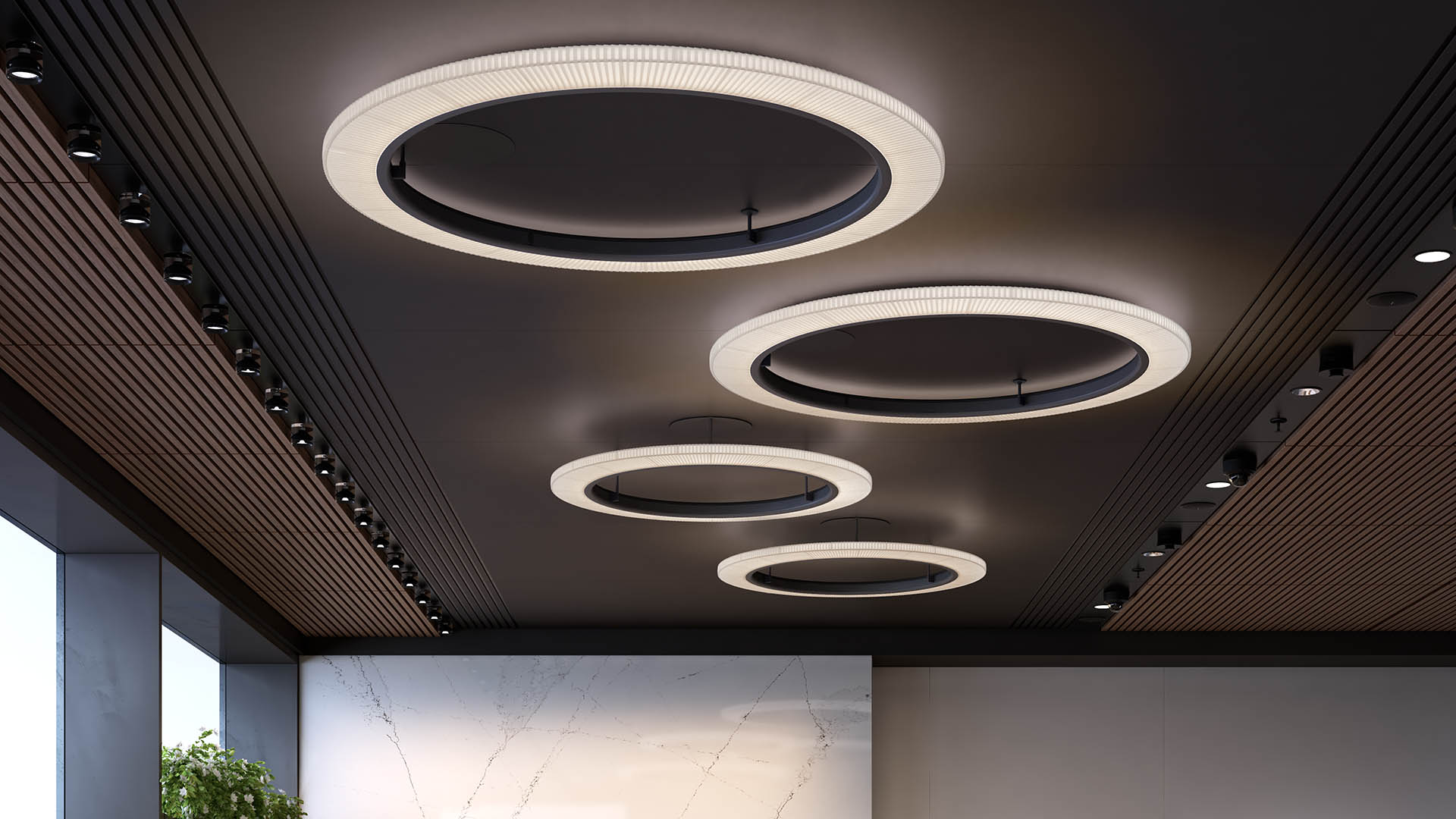 Особенностью этой модели является скрытая светодиодная лента, расположенная по всему периметру кольца. Она излучает мягкий, рассеянный свет, который равномерно наполняет пространство. Теплый оттенок свечения подчеркивается темным обрамлением по краю абажура, создавая эффект глубины и добавляя интерьеру особую теплоту.