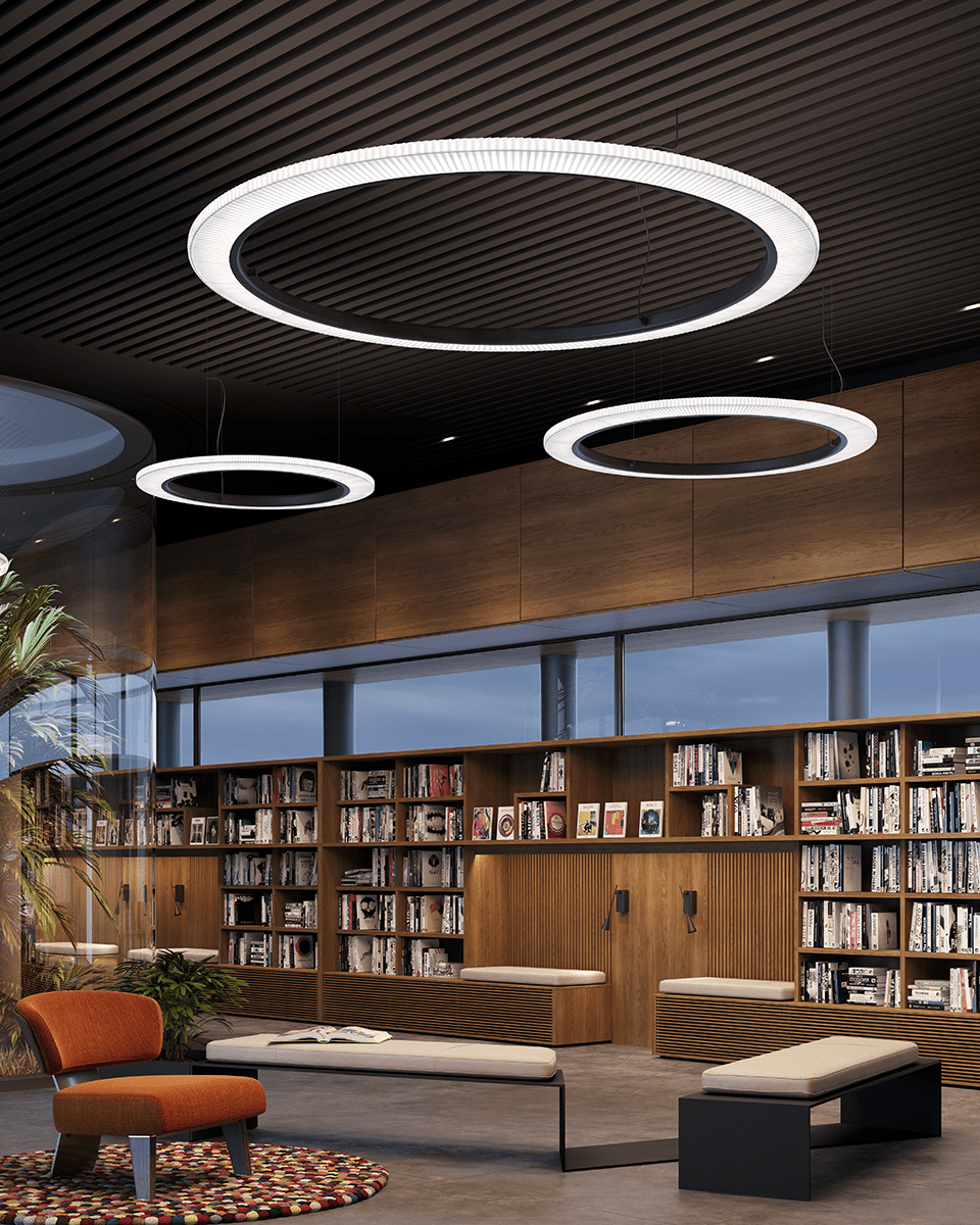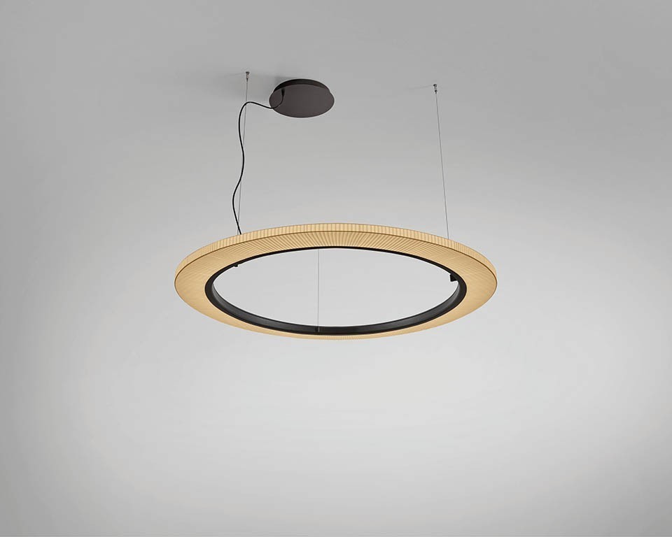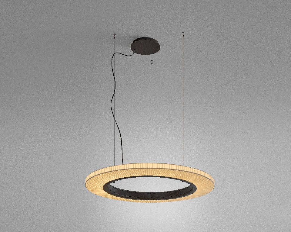 Одной из ключевых особенностей коллекции Roda S является тёмное кольцо по периметру абажура. Оно не только служит декоративным элементом, но и подчёркивает теплоту светодиодной ленты, делая свет более мягким и приятным для глаз. Это кольцо придаёт светильникам особую атмосферность и лёгкость, несмотря на их внушительный объём.