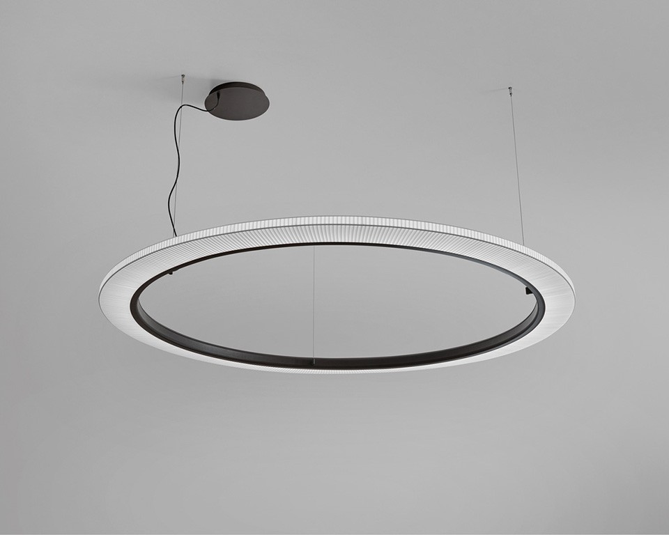 Коллекция Roda S — это серия подвесных светильников с изысканным и уникальным дизайном. В центре каждого светильника находится большой цилиндрический абажур в форме кольца, который мягко рассеивает свет, создавая уютную атмосферу в любом пространстве. Этот абажур выполненный из прозрачного материала, позволяет свету равномерно распределяться, не создавая резких теней. Внутренний контур абажура обрамлён элегантным алюминиевым кольцом, в котором расположен непрерывный круг светодиодов.