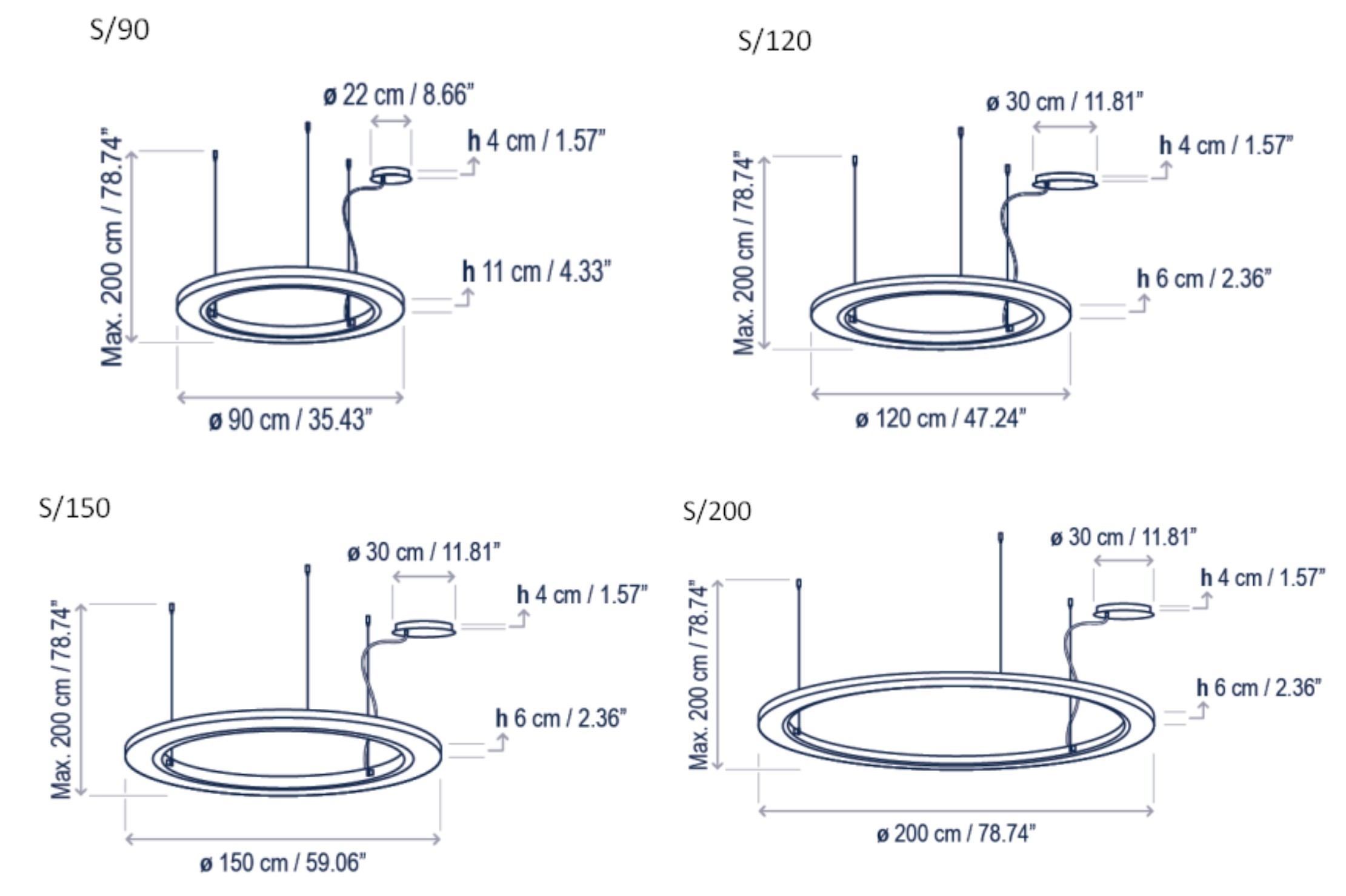 Подвесные светильники Roda S доступны в нескольких размерах: 90, 120, 150 и 200 см в диаметре. Также они представлены в различных вариантах исполнения, что позволяет подобрать идеальный светильник для любого интерьера. Их можно повесить как горизонтально, так и вертикально, создавая разнообразные композиции. Это даёт пользователям свободу выбора и возможность адаптировать светильники под свои предпочтения и стиль помещения.