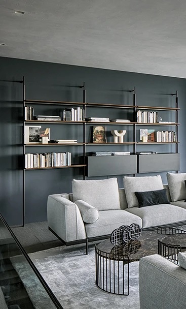 Шкаф фиксируется при помощи металлических трубок в отделке piombo, которые служат не только надёжной опорой, но и частью дизайнерского решения. Эти стойки задают ритм конструкции и подчёркивают её современный характер.