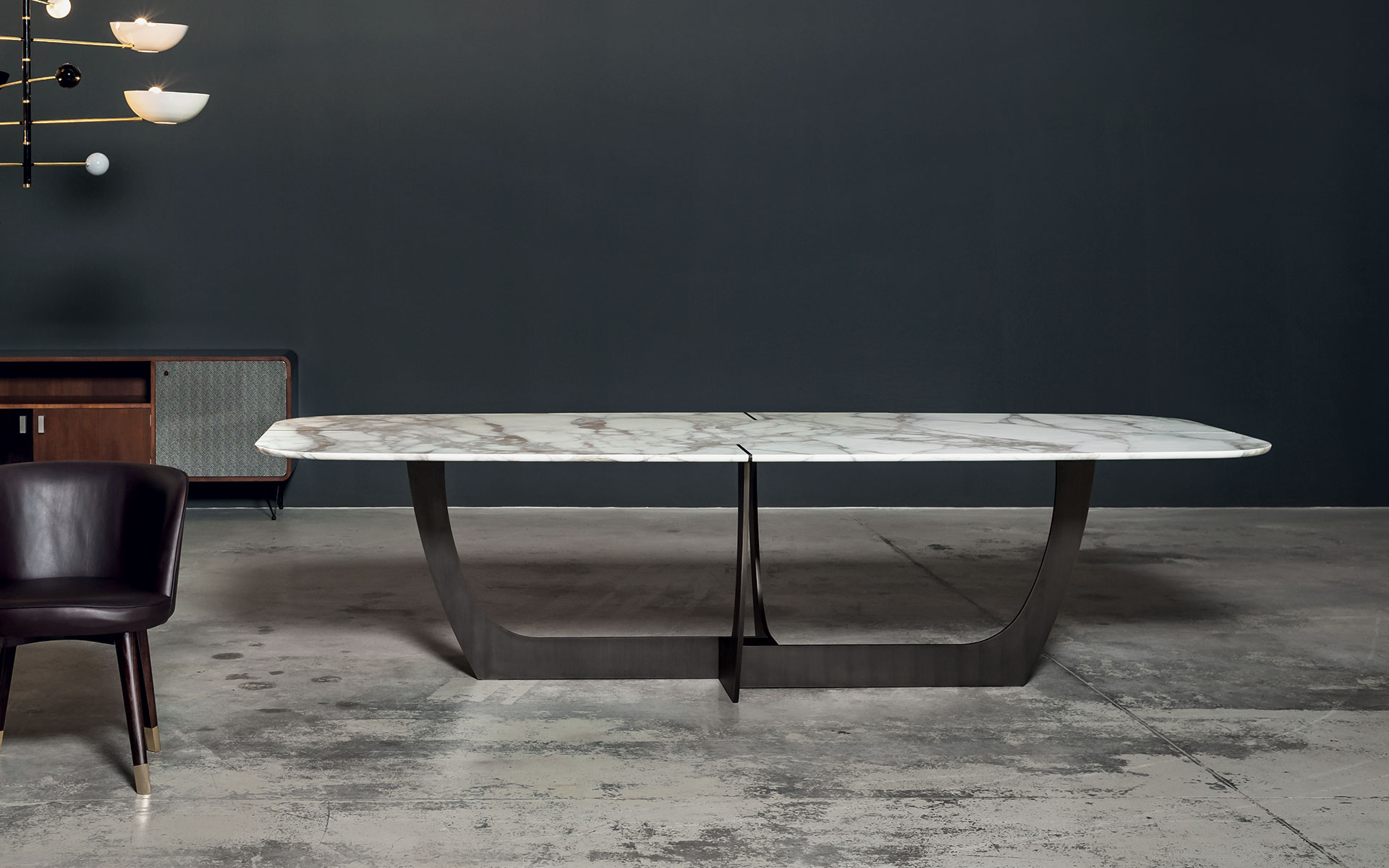 Основание стола Romeo изготавливается из металла, который полируется вручную или покрывается матовым лаком. Столешница с закругленными углами может быть выполнена из мрамора или дерева. В качестве внешней отделки может использоваться кожа, оттенок которой вы выбираете сами. Детали о данной модели уточняйте у менеджеров или в PDF инструкции.n