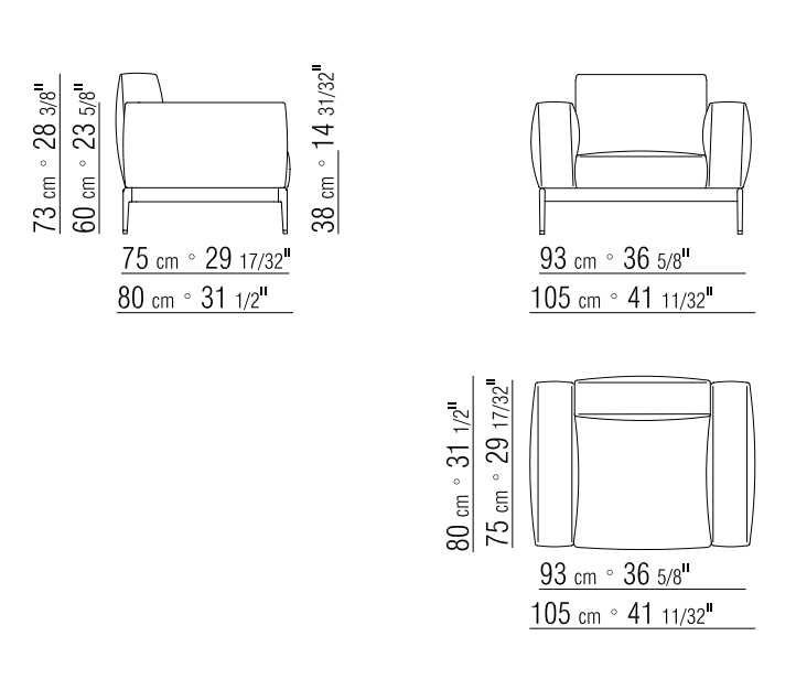 Размеры подлокотников и спинки являются приблизительными. Каталог предлагает большой выбор материалов. Это кожа и ткань разных текстур, цветов и оттенков. Все они сочетаются с современным дизайном кресла.