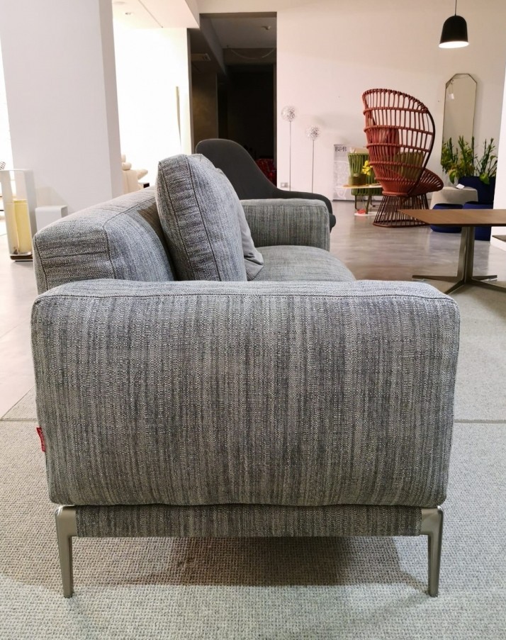 Спинка модели слегка приподнята по сравнению с базовой версией. Это обеспечивает дополнительную поддержку спины даже без валика. Силуэт дивана выглядит утонченно благодаря изящным металлическим ножкам. Они выполнены из литого алюминия.