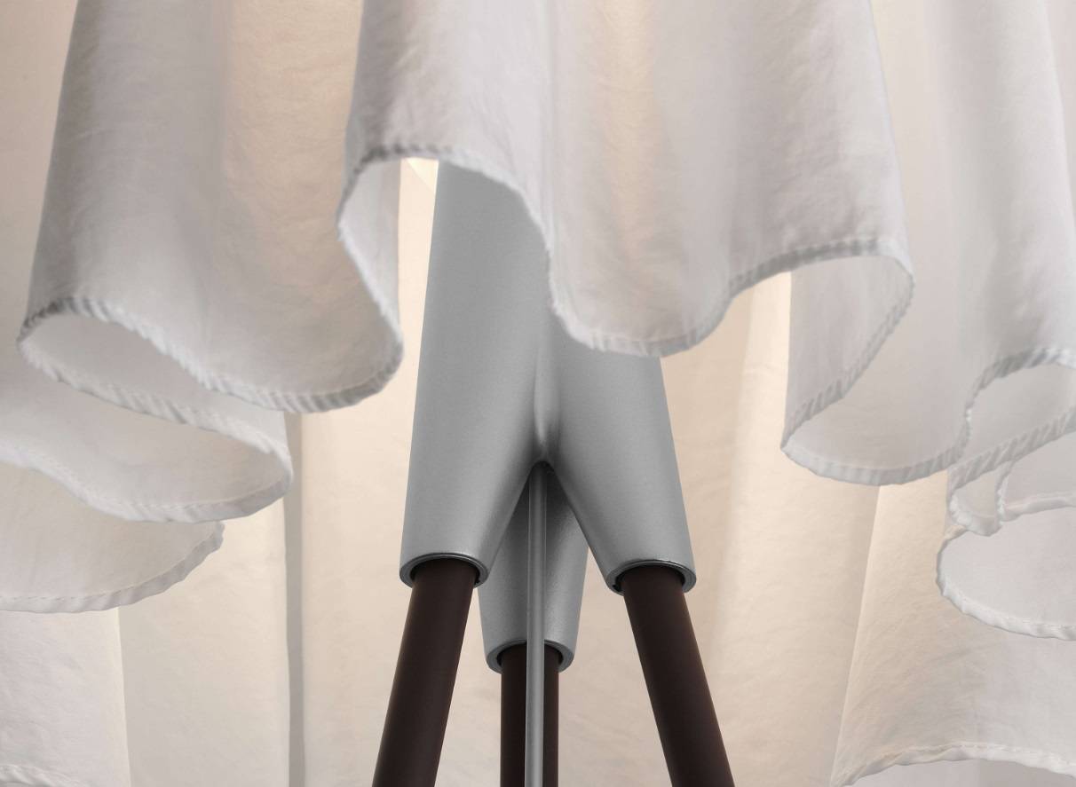 Конструкция сочетает алюминиевый шток — прочный, но изящный — и корпус из поликарбоната, обеспечивающий устойчивость и современный визуальный баланс. Тканевый плафон, натянутый на каркас, придаёт светильнику мягкость и скульптурность, делая его идеальным для гостиных, спален или холлов, где важна атмосфера уюта и визуального комфорта.