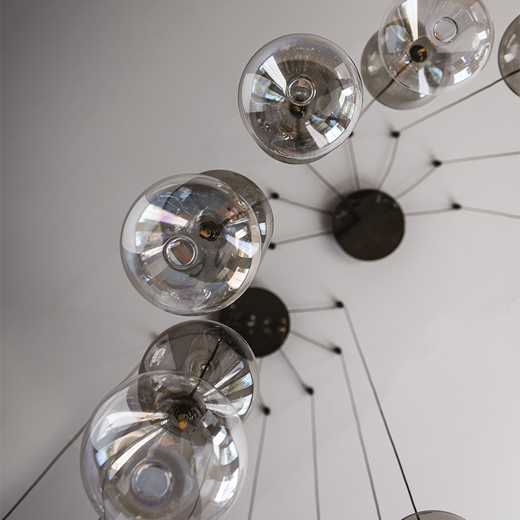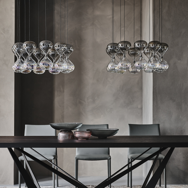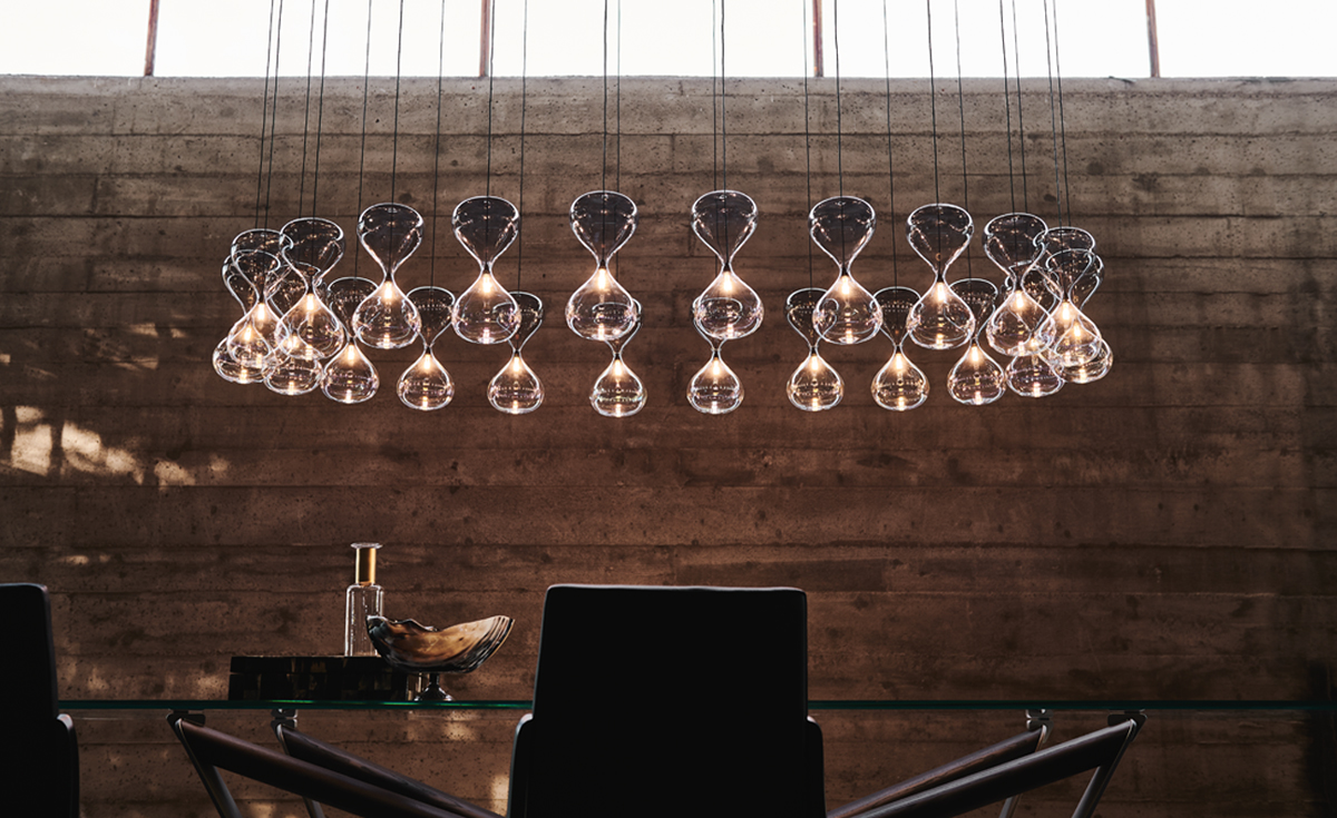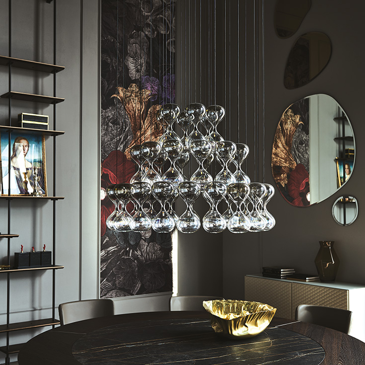 Светильник Sablier предлагает бесконечные возможности для создания композиций из хрустальных плафонов, напоминающих изящные песочные часы. Каждый элемент можно подвесить индивидуально или сгруппировать на круглом каркасе, вмещающем от 2 до 24 плафонов с регулировкой высоты и расстояния. Хрустальные детали, размещенные на разной высоте, создают гармоничный и элегантный акцент, идеально подчеркивающий современные жилые пространства. Гибкость конструкции позволяет адаптировать светильник под помещения любого размера и стиля, делая его универсальным решением для создания атмосферного освещения с эффектом мерцания.