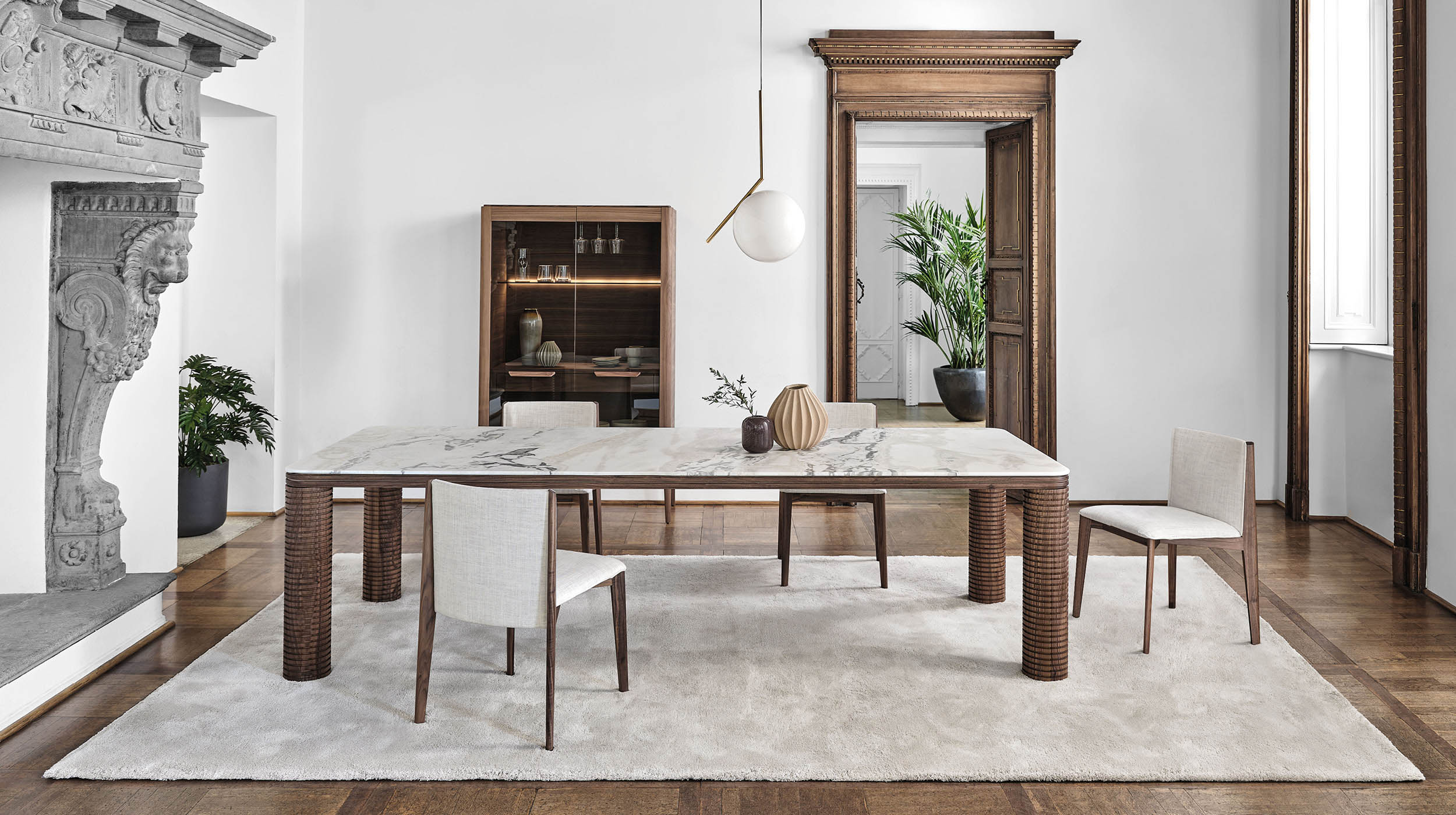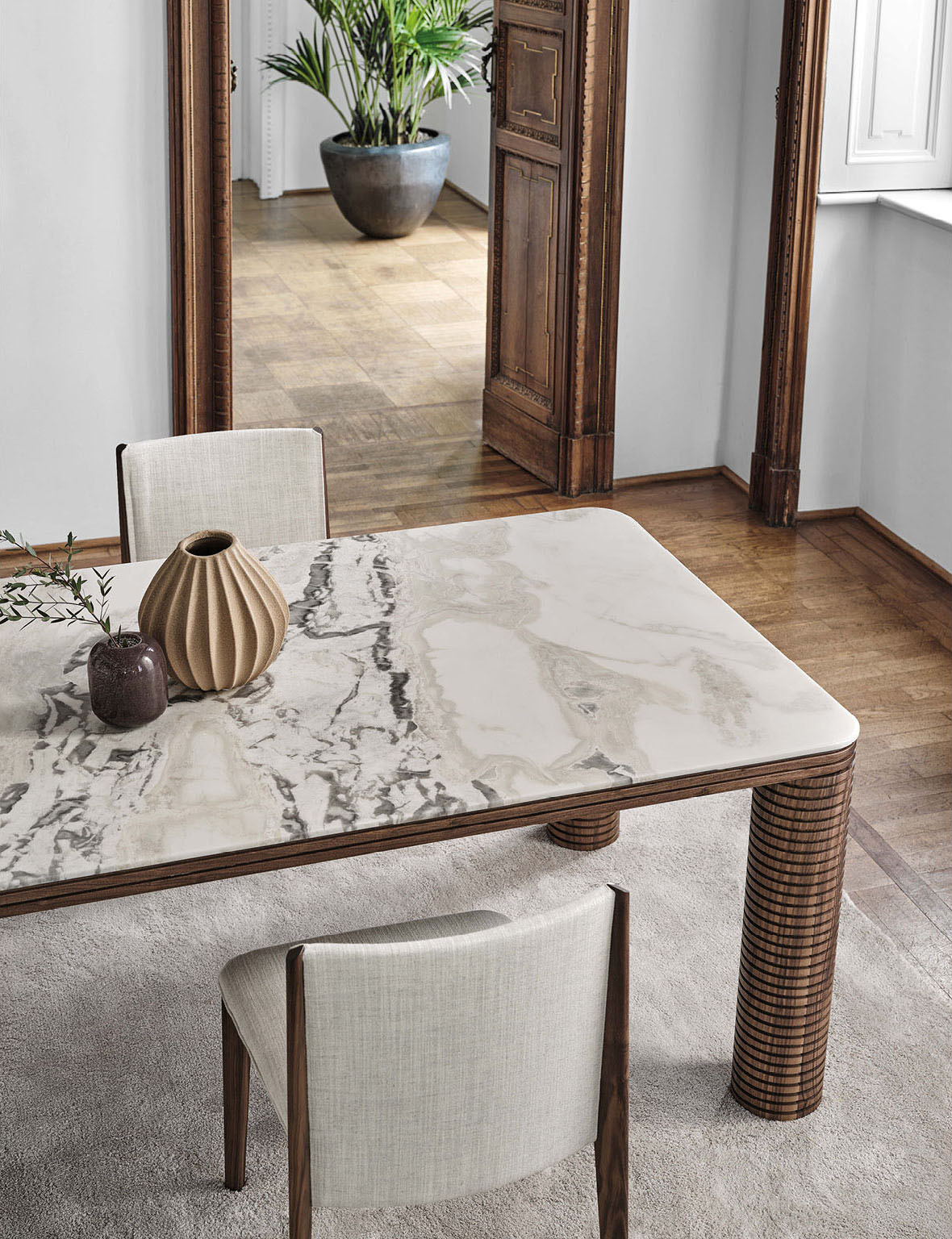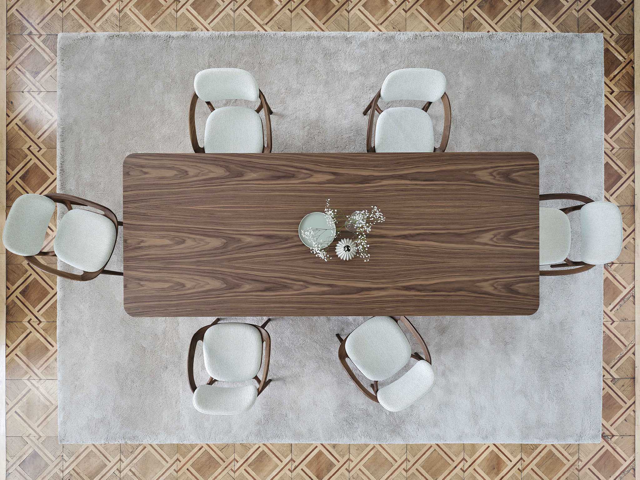 Особое внимание в конструкции столов уделено материалам. Каркас изготовленный из массива ореха каналетто, известен своей прочностью и долговечностью. Этот натуральный материал придаёт столам естественный и тёплый оттенок, подчёркивая их премиальность. Столешницы выполнены из высококачественных материалов. У модели L они сделаны из древесины, создавая уютную и домашнюю атмосферу. У Rock — из камня, добавляя столу строгости и солидности. А у M — из мрамора, придавая изделию роскошный и утончённый вид.