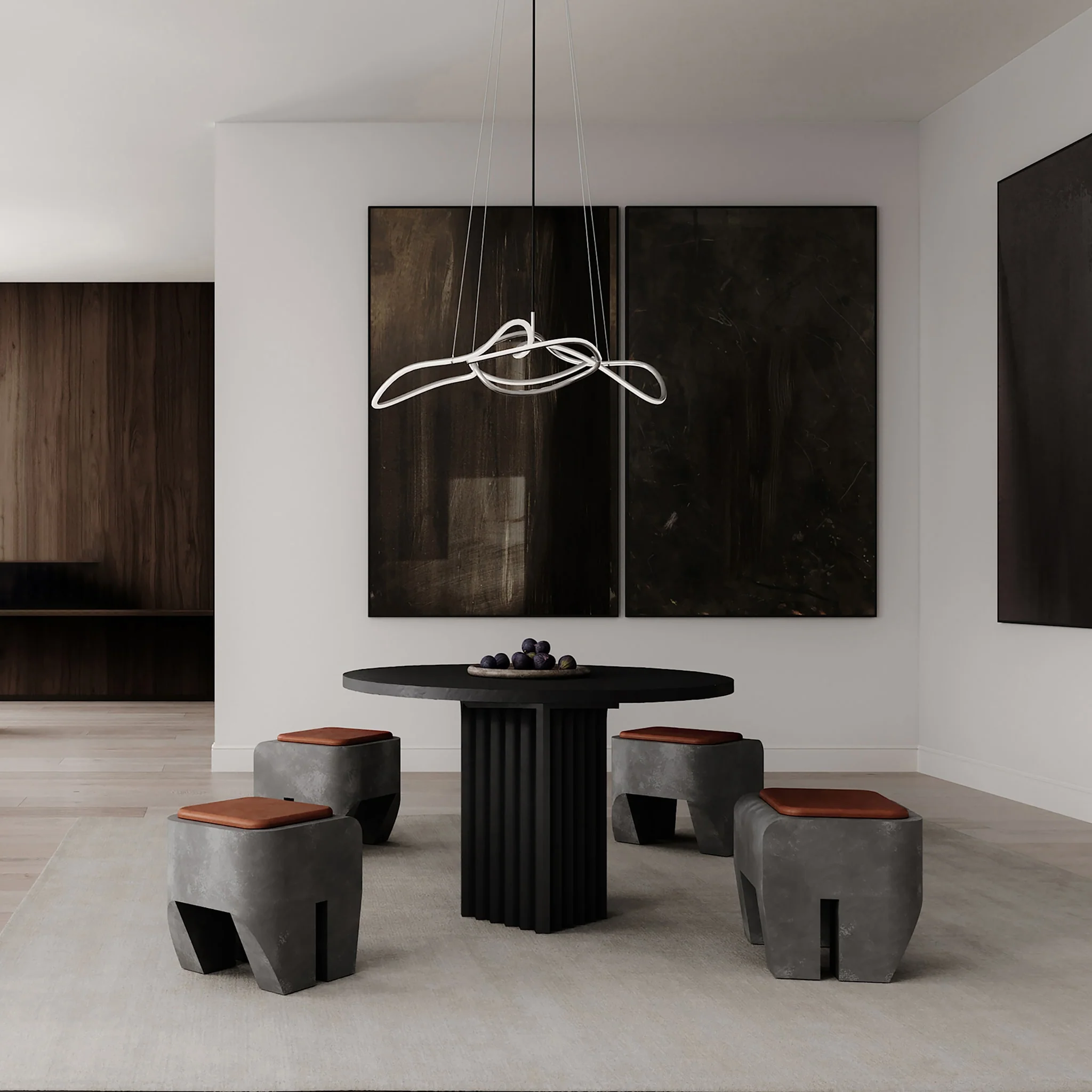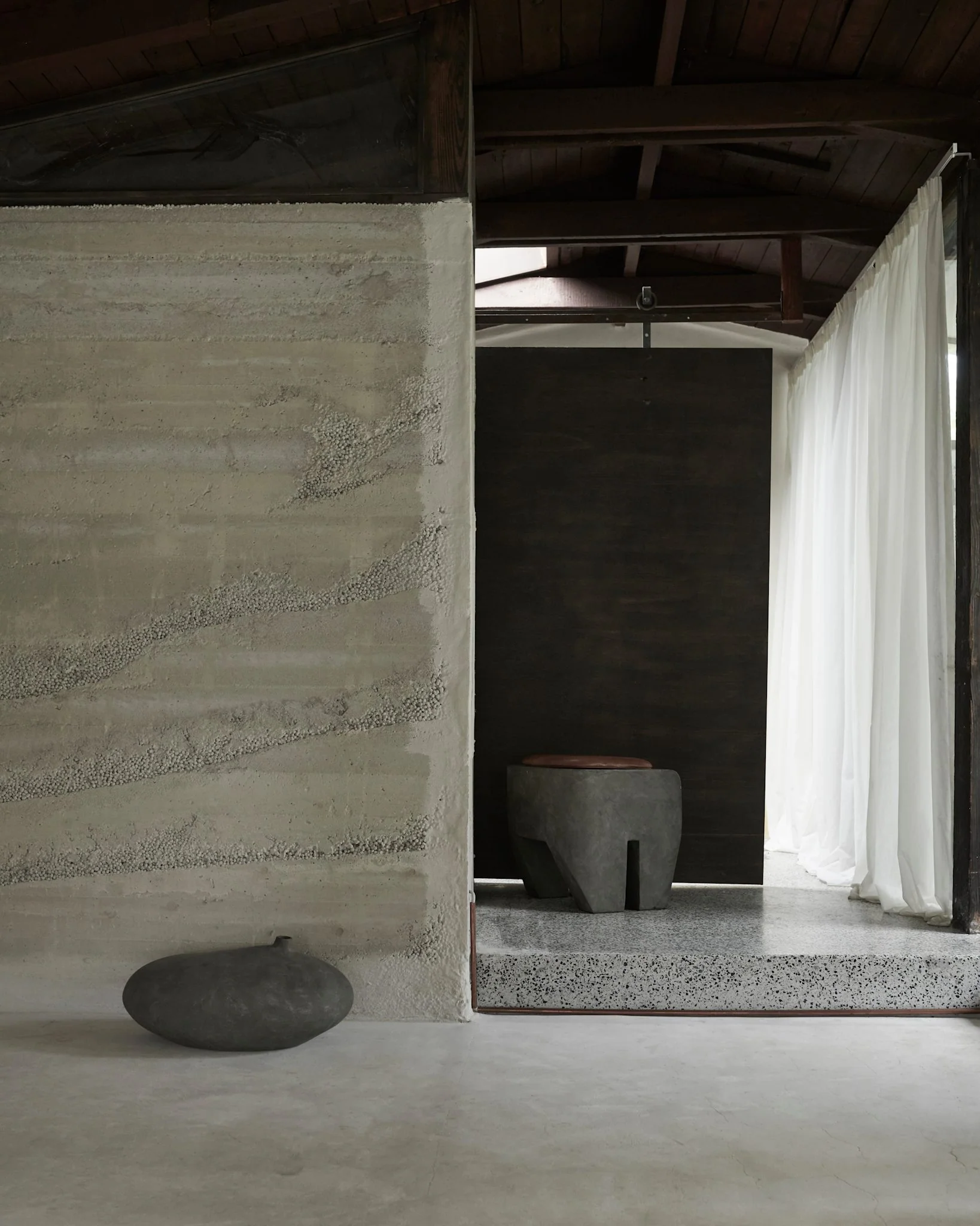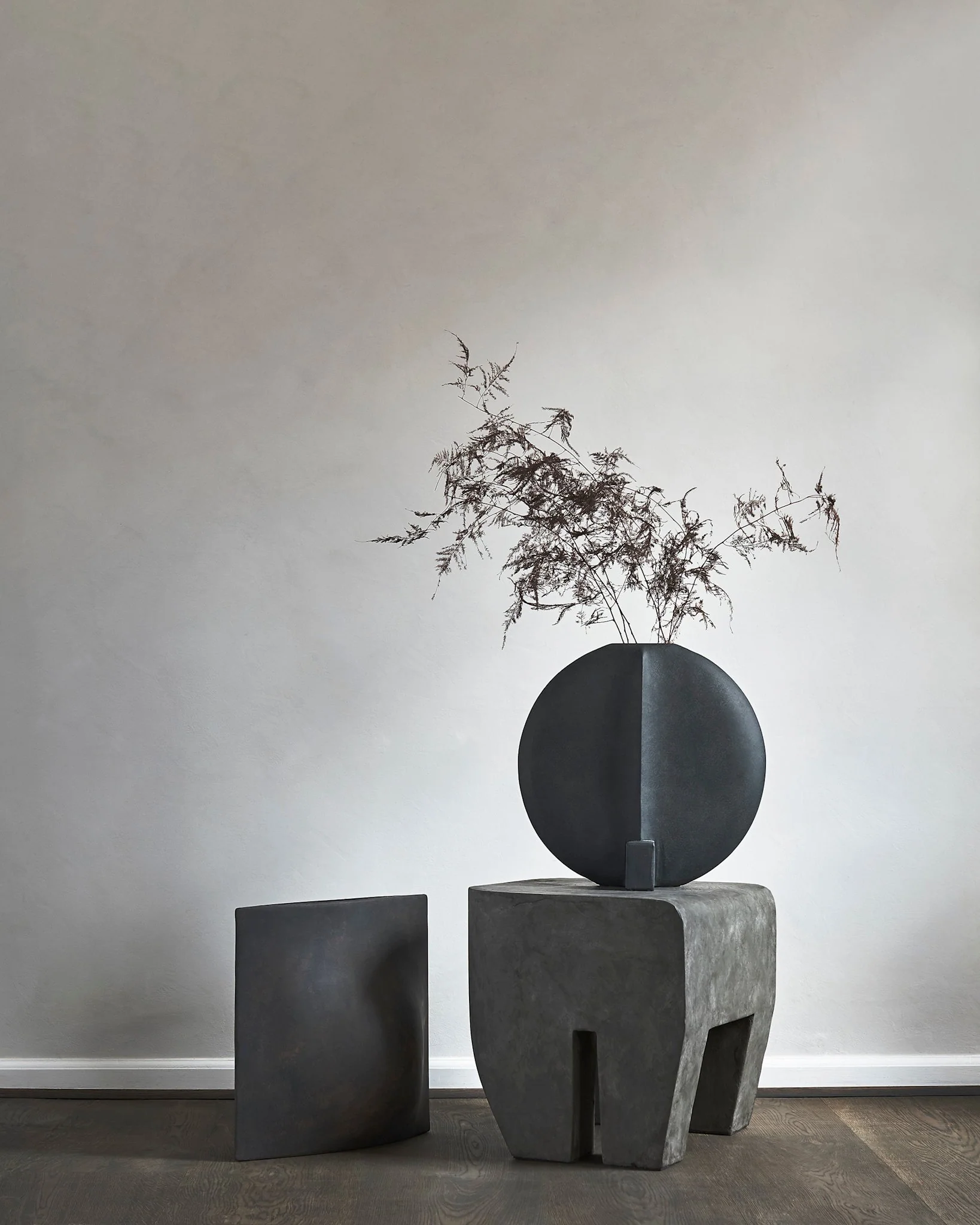 Материалом для Sculpt Stool служит легкий фибробетон, сочетающий прочность и пластичность. Каждый экземпляр вручную покрывается краской, что придает поверхности уникальную, слегка неравномерную текстуру, подчеркивая рукотворность и связь с архитектурными прототипами. Воплощая дух брутализма, табурет сохраняет функциональность, оставаясь лаконичным предметом мебели с выразительным характером.