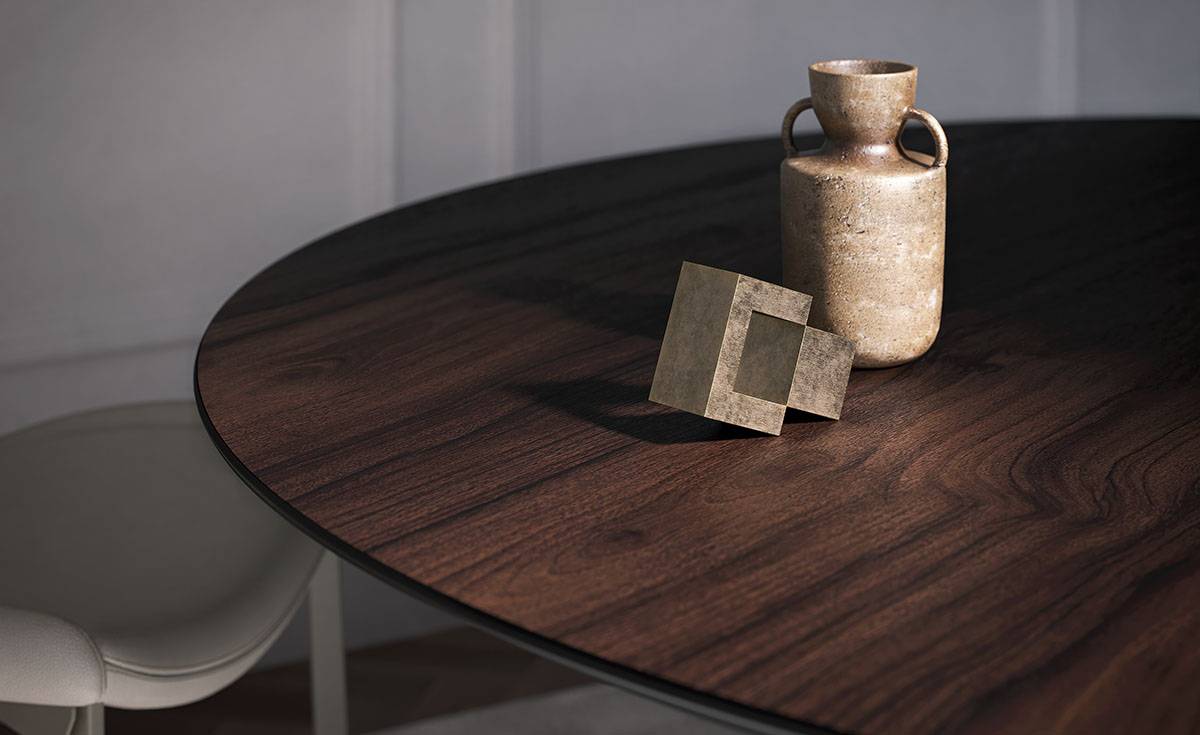 Версии с прямоугольной столешницей отличаются сложной работой с материалами: модель из дерева демонстрирует искусно обыгранные стыки и соединения, в то время как версия Ker-Wood объединяет массив дерева с керамической вставкой, позволяя комбинировать широкую палитру ценных пород древесины, керамики различных оттенков и металлических элементов. Круглые столы коллекции обладают ярким скульптурным характером благодаря стальным ножкам асимметричной формы, создающим динамичный визуальный ритм.