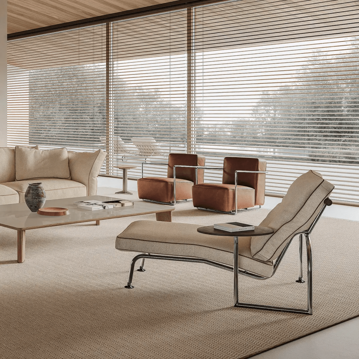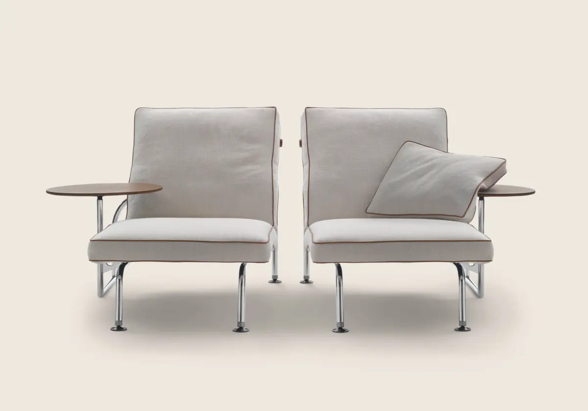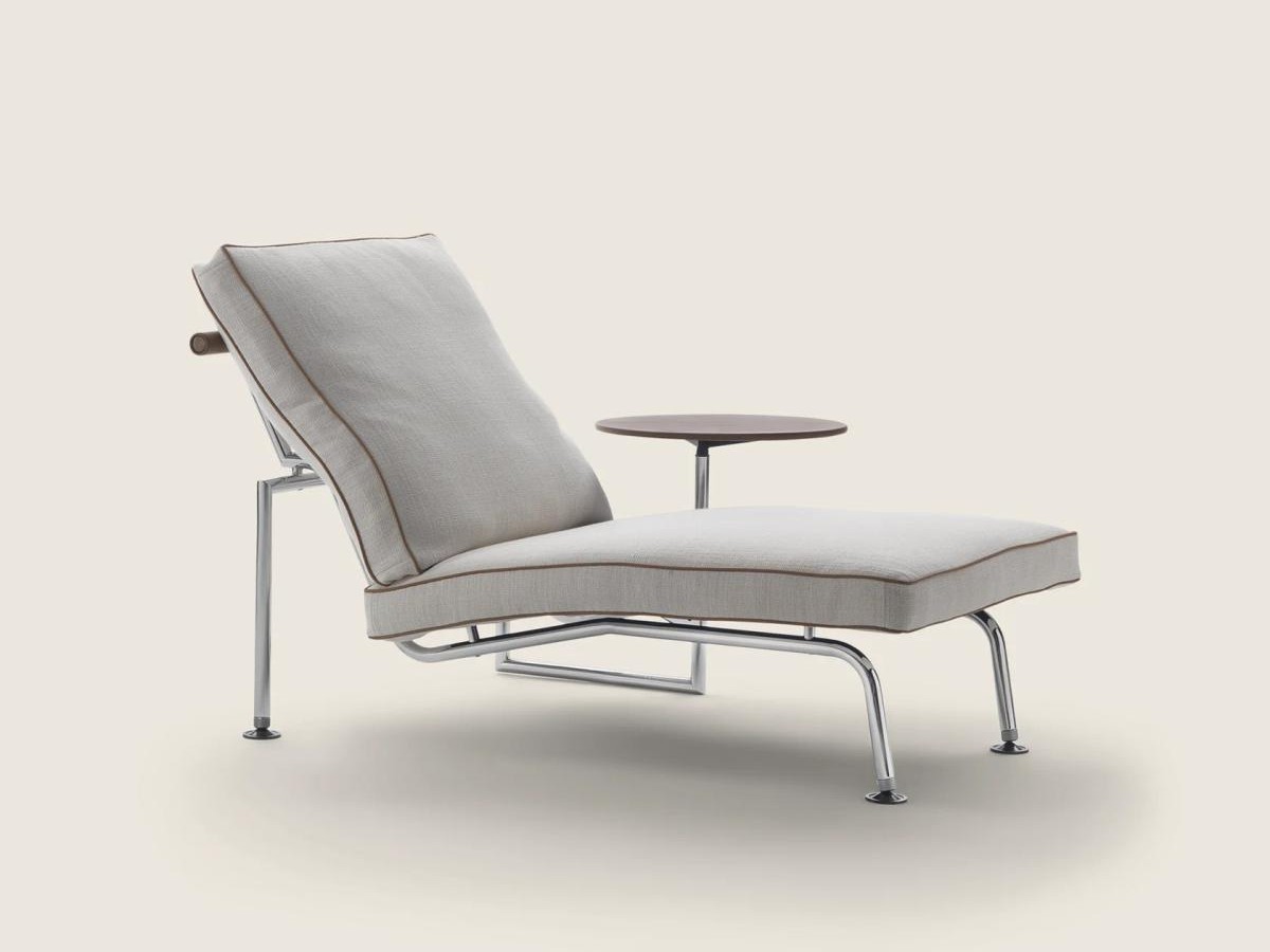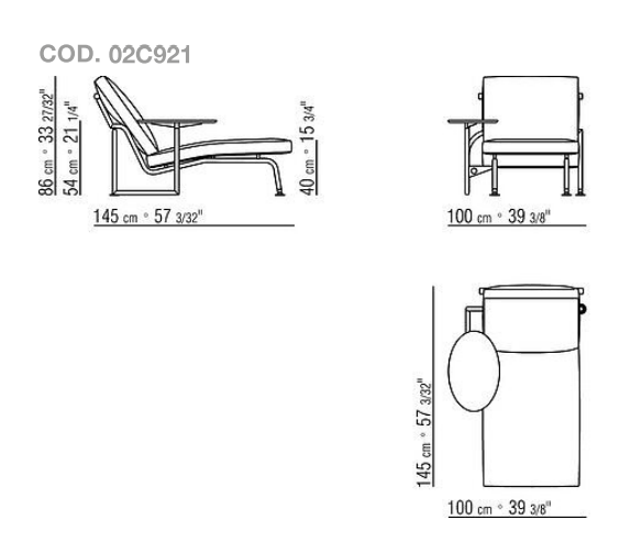 Вращающийся столик изготовленный из дерева с кожаной обивкой, предусмотрен с обеих сторон кушетки. Обивка соответствует цвету перекладины спинки. Столик имеет металлический каркас с чёрной окраской.