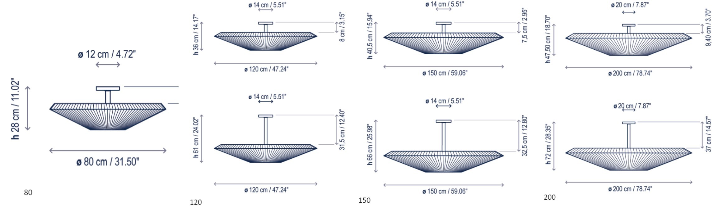 SIAM доступен в четырёх диаметрах. Это позволяет подобрать идеальный вариант для разных помещений. Меньшие размеры органично впишутся в камерные пространства. Крупные модели станут эффектным акцентом в просторных интерьерах.