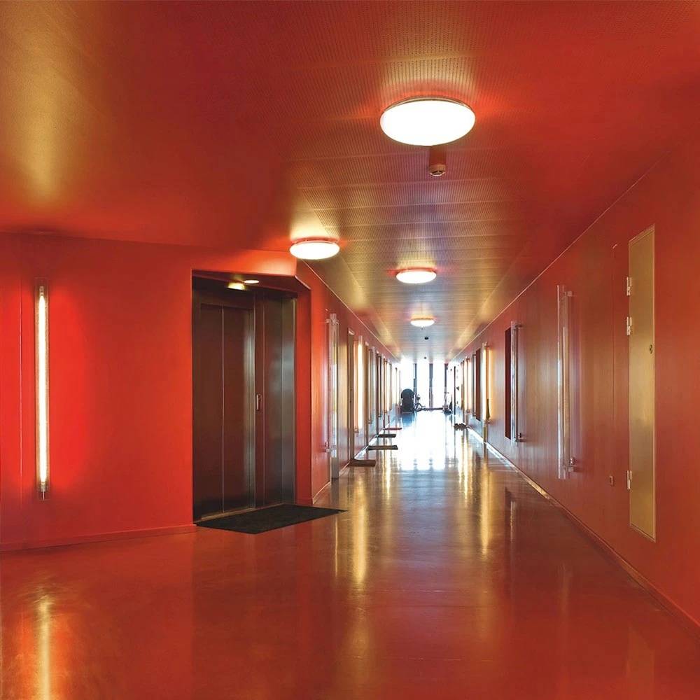 Модель доступна в двух размерах: Ø295 мм и Ø440 мм. Она подходит как для потолочного, так и для настенного монтажа. Уникальная конструкция обеспечивает плавный переход между корпусом и рассеивателем без видимых стыков. Передняя часть выполнена из матового белого опалового акрила, задняя — из полупрозрачного металлизированного поликарбоната. Такое сочетание материалов создаёт эффект лёгкости и визуального снижения контраста между светильником и стеной или потолком.