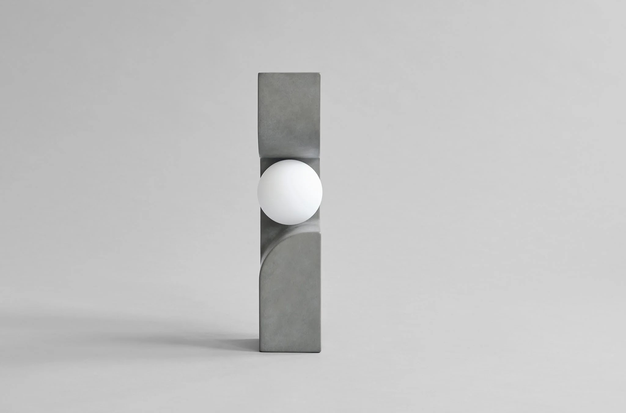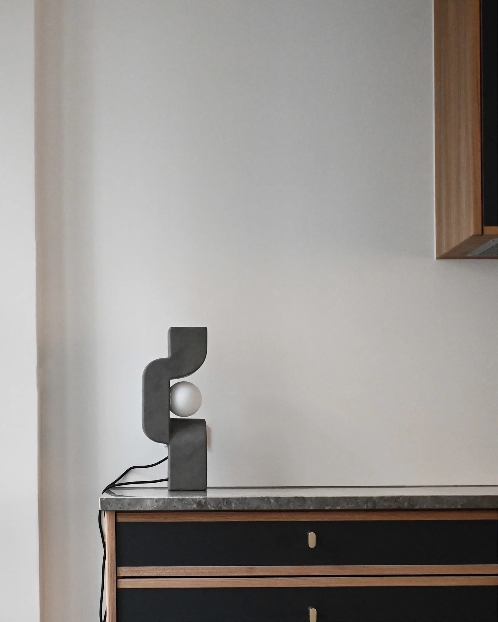 Светильник представляет собой светящуюся скульптуру, предназначенную для интерьера. Его основу составляет стеклянная сфера, излучающая мягкий и тёплый свет. Эта сфера заключена в изящную спиральную конструкцию из керамики. Спираль с её хрупким и невесомым видом создаёт ощущение лёгкости и устойчивости, словно паря в воздухе. Её форма бросает вызов законам физики, придавая композиции визуальную утончённость и динамичность.