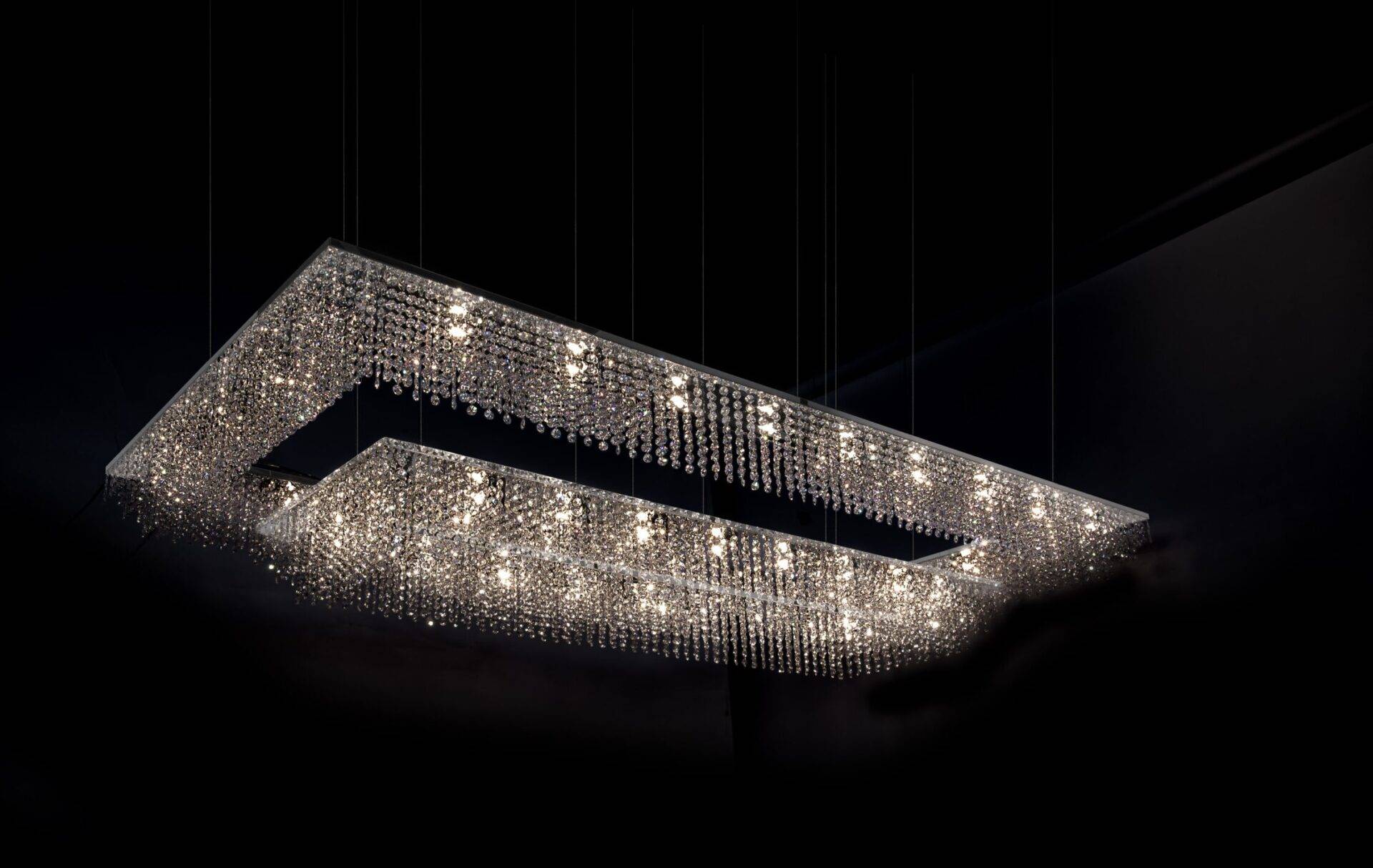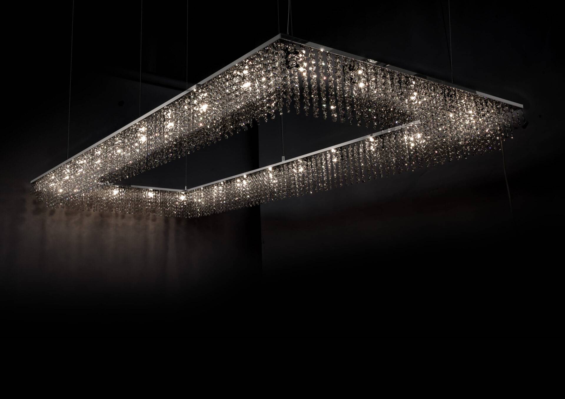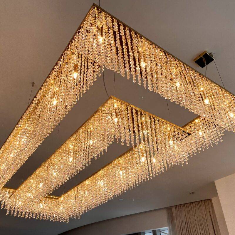 Люстра Sky Cycles Rectangular представляет собой изысканное сочетание элегантности и утончённости в мире осветительных приборов. Её дизайн излучает спокойствие и гармонию, несмотря на внешнюю эффектность. Тонкие кристаллы, искусно вплетённые в минималистичный корпус светильника, создают атмосферу лёгкости и изящества, которая не бросается в глаза, а мягко и ненавязчиво наполняет пространство мягким светом и утончённым великолепием.