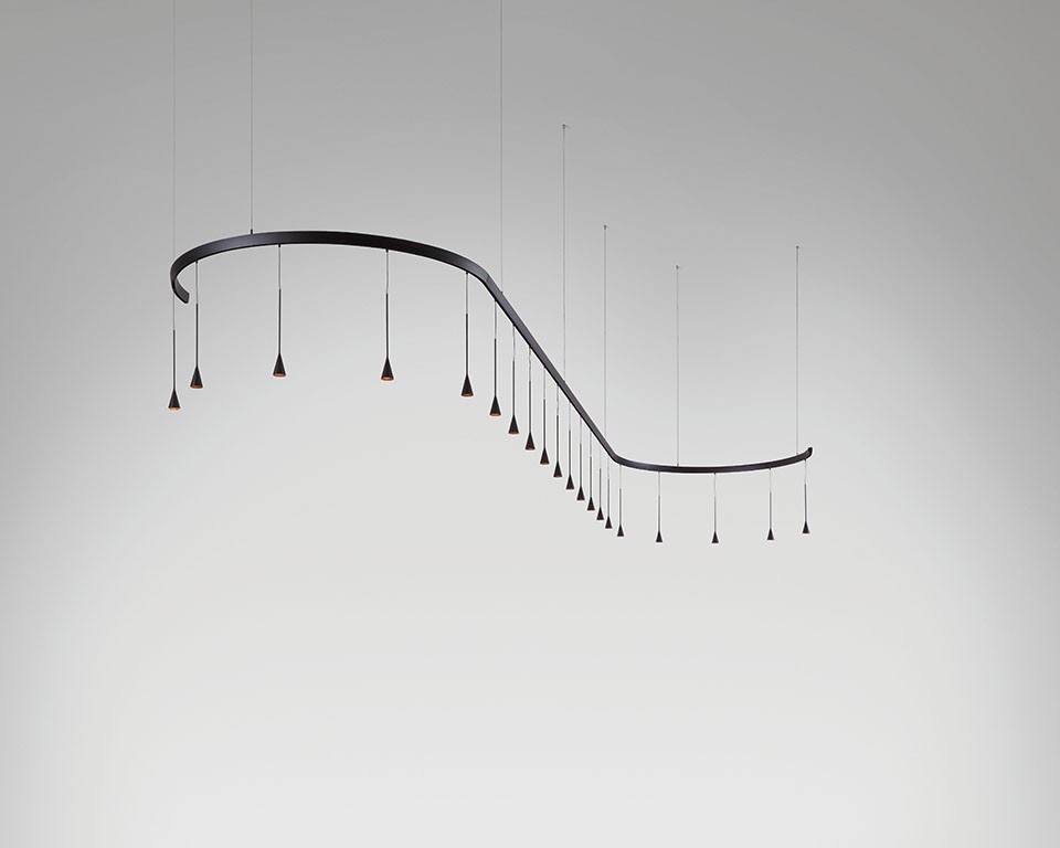 Светильник всегда представлен в строгом черном цвете, но его финишную отделку можно изменить по индивидуальному заказу. Профили сделаны из экструдированного алюминия, что обеспечивает легкость и долговечность.