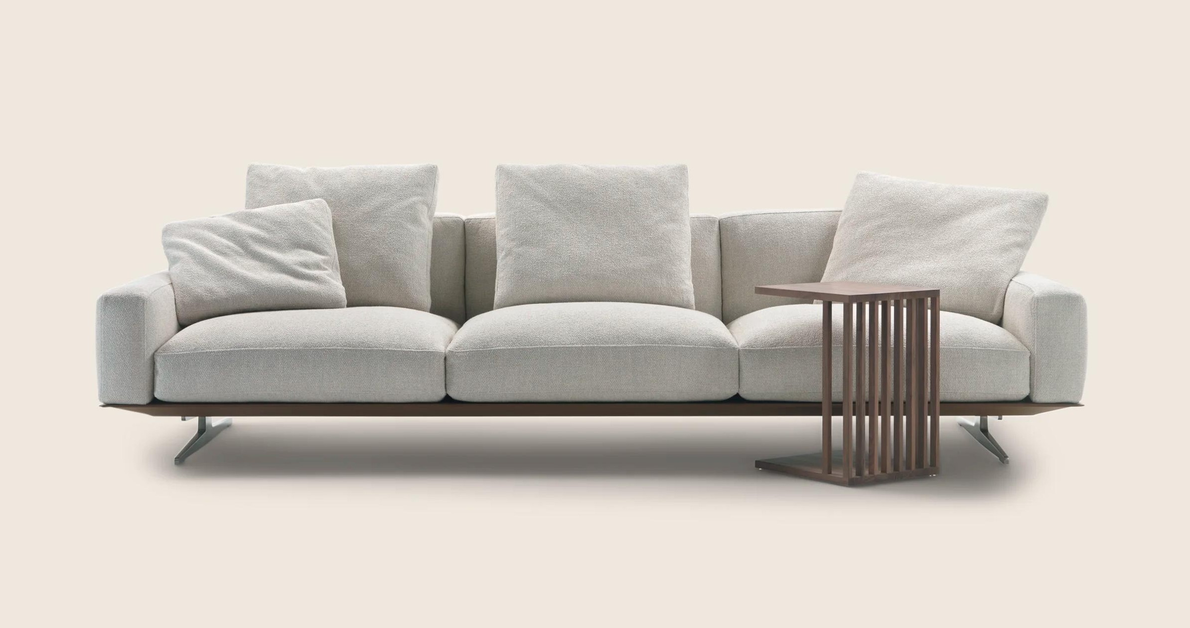 Дизайн модели отличается легкостью и изысканностью. Изящные ножки из литого металла с разнообразными вариантами отделки приподнимают корпус, добавляя интерьеру воздушности. Основание дивана обтянуто кожей, а сиденья и спинки наполнены гусиным пухом, обеспечивающим непревзойденную мягкость.