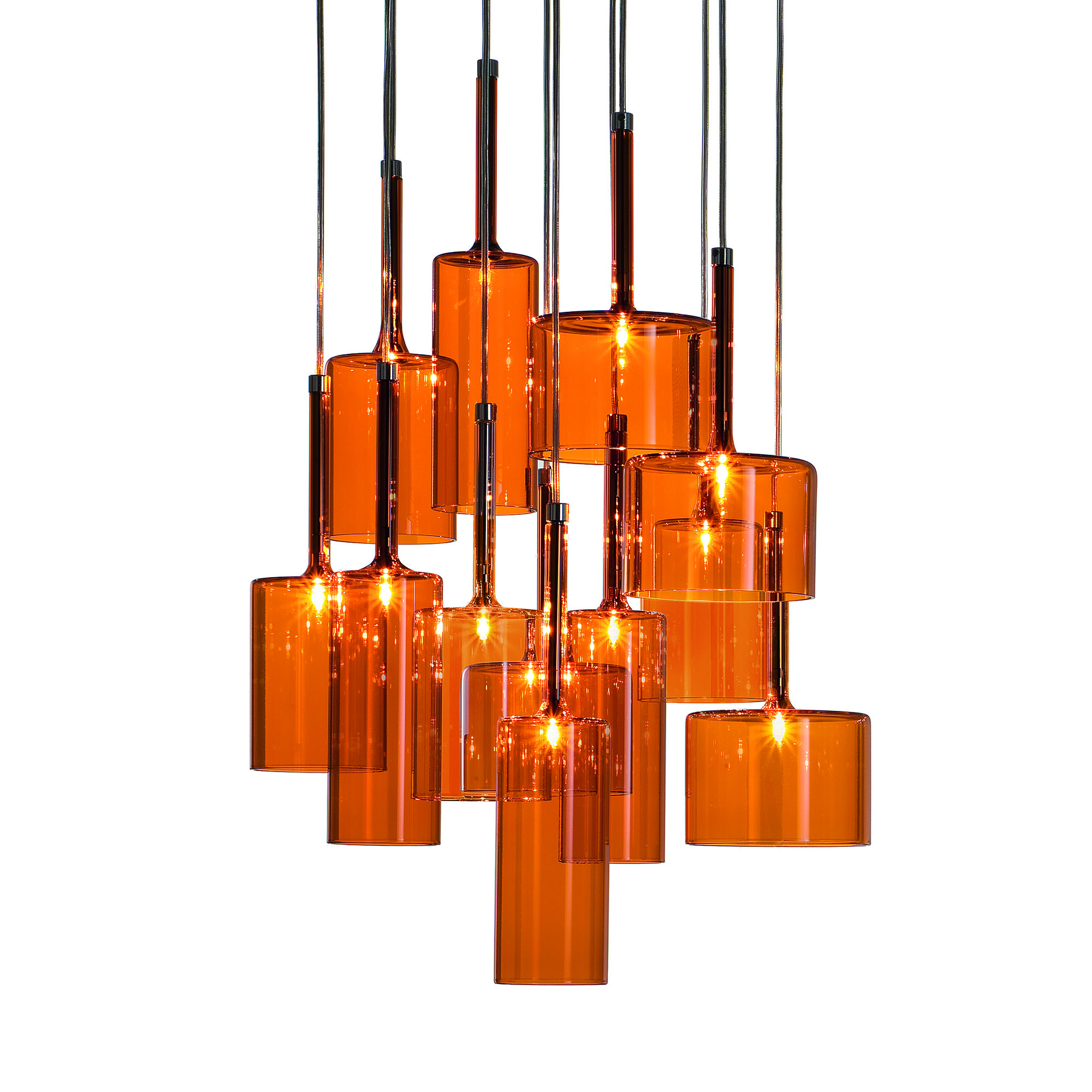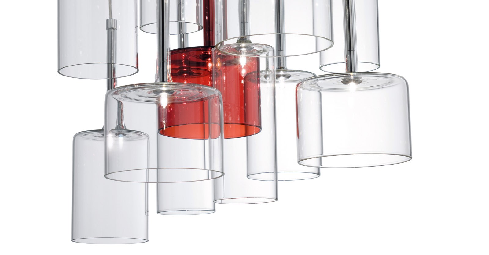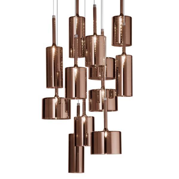 Обворожительная игра стеклянных бокалов, иногда перевернутых, наложение друг на друга бесцветных или цветных прозрачных элементов. Spillray — это эклектическая и элегантная коллекция, различные композиции которой способны создавать нежные плавные движения и изысканную игру цвета. Текучие геометрические формы, стеклянные чаши, предложены в различных моделях, и выходящий из них свет распространяется во всех направлениях. Предлагаются одиночные подвесные светильники, а также линейные модели (6 или 10 ламп) или модели в виде грозди (от 3 до 12 ламп). Варианты люстр: круглая на 30 ламп с двумя уровнями (новинка), круглая на 20 ламп с одним уровнем (новинка) или прямоугольная на 26 ламп (новинка). Предложены также встраиваемые плафоны с одной лампой (новинка), бра и настольные лампы высотой 35 или 50 см (новинка). Абажуры из стекла трех размеров: прозрачные, оранжевого, красного и серого цветов. Каркас из хромированного металла. По одному или в группе, светильники коллекции Spillray естественно вписываются в обстановку жилых и общественных помещений, создавая интерьер и становясь отличительными элементами любого пространства.