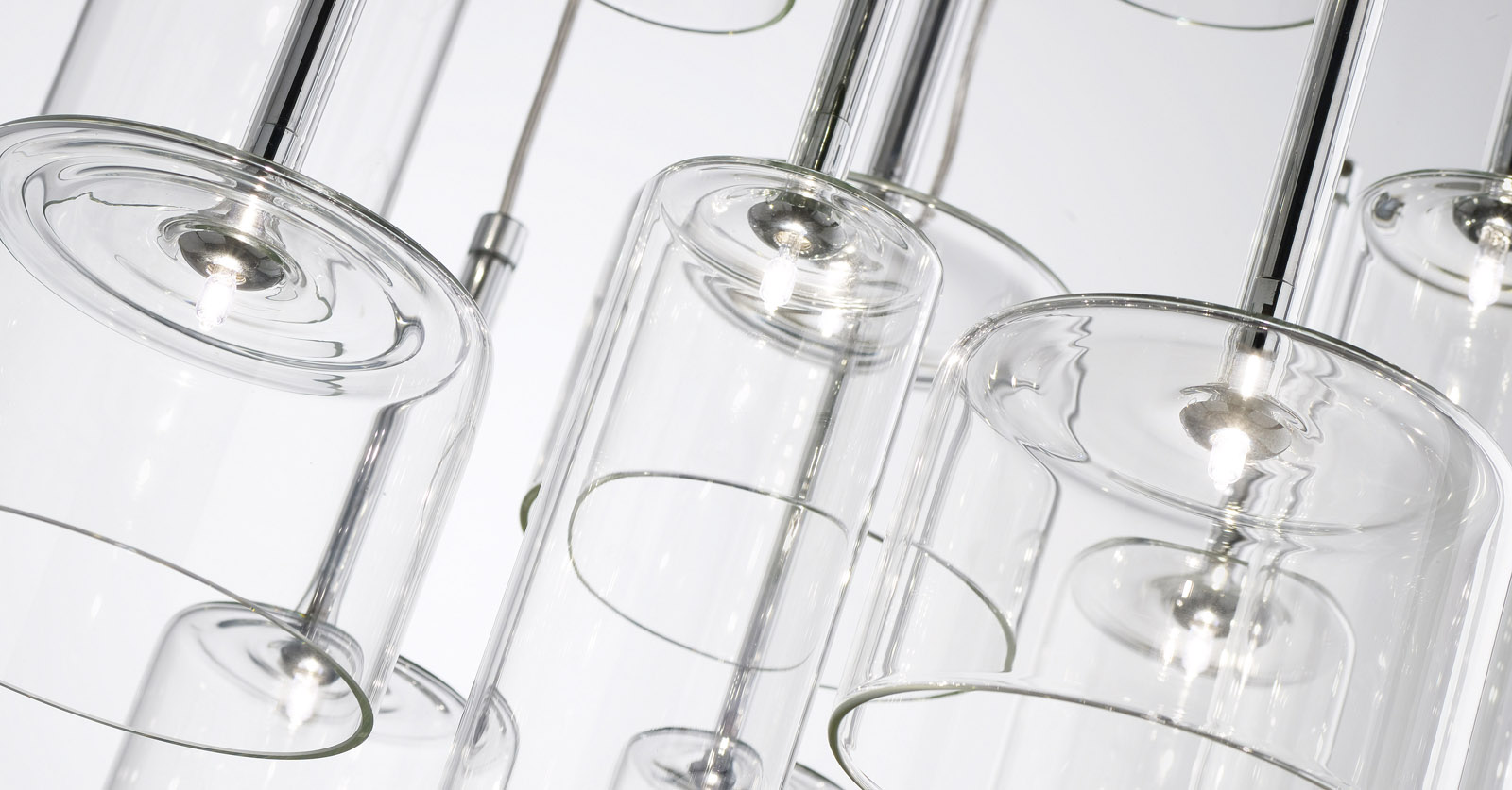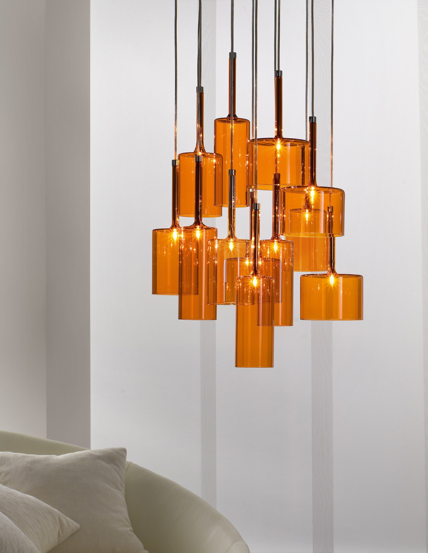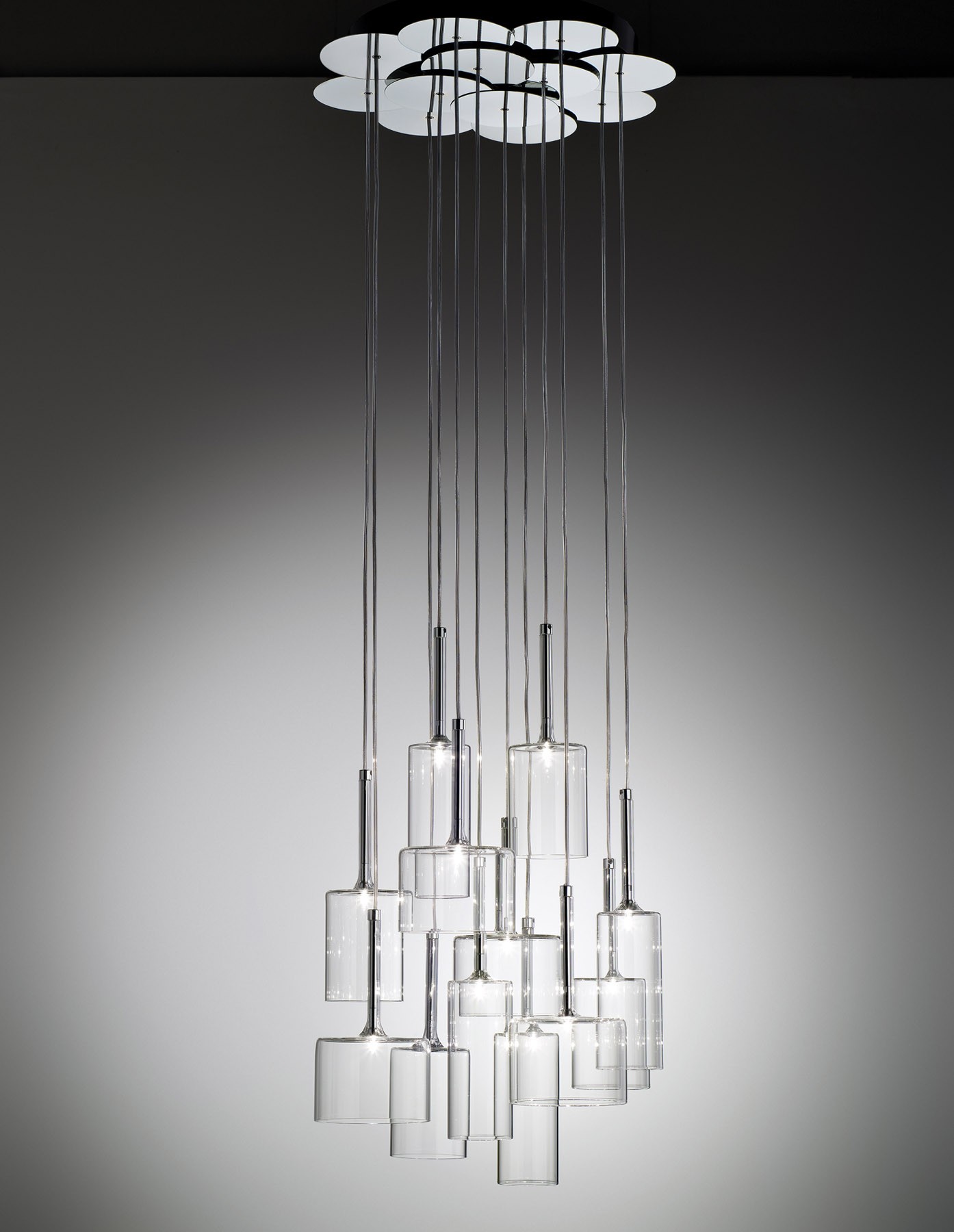 Обворожительная игра стеклянных бокалов, иногда перевернутых, наложение друг на друга бесцветных или цветных прозрачных элементов. Spillray — это эклектическая и элегантная коллекция, различные композиции которой способны создавать нежные плавные движения и изысканную игру цвета. Текучие геометрические формы, стеклянные чаши, предложены в различных моделях, и выходящий из них свет распространяется во всех направлениях. Предлагаются одиночные подвесные светильники, а также линейные модели (6 или 10 ламп) или модели в виде грозди (от 3 до 12 ламп). Варианты люстр: круглая на 30 ламп с двумя уровнями (новинка), круглая на 20 ламп с одним уровнем (новинка) или прямоугольная на 26 ламп (новинка). Предложены также встраиваемые плафоны с одной лампой (новинка), бра и настольные лампы высотой 35 или 50 см (новинка). Абажуры из стекла трех размеров: прозрачные, оранжевого, красного и серого цветов. Каркас из хромированного металла. По одному или в группе, светильники коллекции Spillray естественно вписываются в обстановку жилых и общественных помещений, создавая интерьер и становясь отличительными элементами любого пространства.